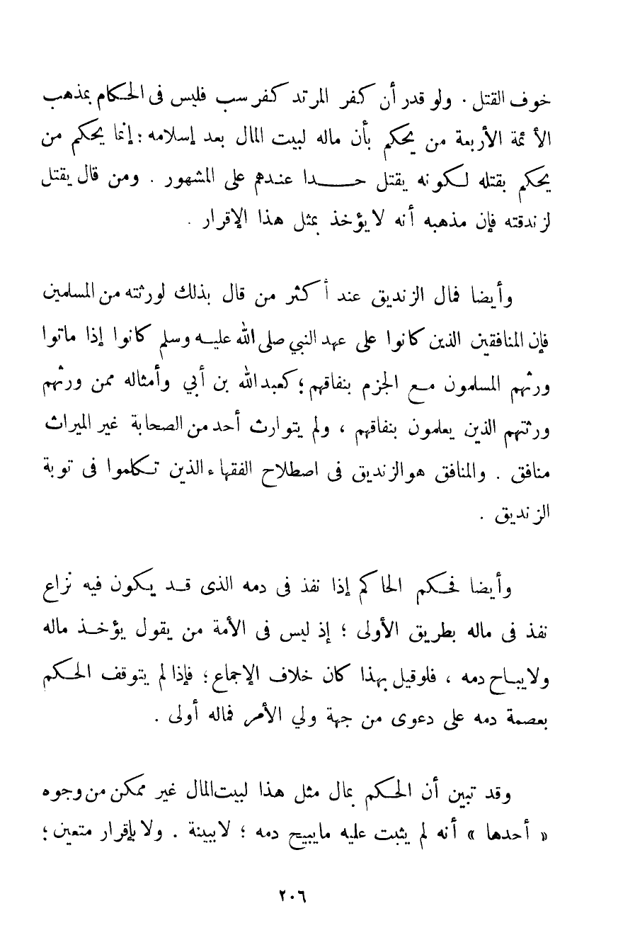 خَوْفَ الْقَتْلِ. وَلَوْ قُدِّرَ أَنَّ كُفْرَ الْمُرْتَدِّ كُفْرُ سَبٍّ فَلَيْسَ فِي الْحُكَّامِ بِمَذْهَبِ الْأَئِمَّةِ الْأَرْبَعَةِ مَنْ يَحْكُمُ بِأَنَّ مَالَهُ لِبَيْتِ الْمَالِ بَعْدَ إسْلَامِهِ؛ إنَّمَا يَحْكُمُ مَنْ يَحْكُمُ بِقَتْلِهِ لِكَوْنِهِ يُقْتَلُ حَدًّا عِنْدَهُمْ عَلَى الْمَشْهُورِ. وَمَنْ قَالَ يُقْتَلُ لِزَنْدَقَتِهِ فَإِنَّ مَذْهَبَهُ أَنَّهُ لَا يُؤْخَذُ بِمِثْلِ هَذَا الْإِقْرَارِ. وَأَيْضًا فَمَالُ الزِّنْدِيقِ عِنْدَ أَكْثَرِ مَنْ قَالَ بِذَلِكَ لِوَرَثَتِهِ مِنْ الْمُسْلِمِينَ فَإِنَّ الْمُنَافِقِينَ الَّذِينَ كَانُوا عَلَى عَهْدِ النَّبِيِّ صَلَّى اللَّهُ عَلَيْهِ وَسَلَّمَ كَانُوا إذَا مَاتُوا وَرِثَهُمْ الْمُسْلِمُونَ مَعَ الْجَزْمِ بِنِفَاقِهِمْ؛ كَعَبْدِ اللَّهِ بْنِ أبي وَأَمْثَالِهِ مِمَّنْ وَرِثَهُمْ وَرَثَتُهُمْ الَّذِينَ يَعْلَمُونَ بِنِفَاقِهِمْ وَلَمْ يَتَوَارَثْ أَحَدٌ مِنْ الصَّحَابَةِ غَيْرَ الْمِيرَاثِ مُنَافِقٌ. وَالْمُنَافِقُ هُوَ الزِّنْدِيقُ فِي اصْطِلَاحِ الْفُقَهَاءِ الَّذِينَ تَكَلَّمُوا فِي تَوْبَةِ الزِّنْدِيقِ. وَأَيْضًا فَحُكْمُ الْحَاكِمِ إذَا نَفَذَ فِي دَمِهِ الَّذِي قَدْ يَكُونُ فِيهِ نِزَاعٌ نَفَذَ فِي مَالِهِ بِطَرِيقِ الْأَوْلَى؛ إذْ لَيْسَ فِي الْأُمَّةِ مَنْ يَقُولُ يُؤْخَذُ مَالُهُ وَلَا يُبَاحُ دَمُهُ فَلَوْ قِيلَ بِهَذَا كَانَ خِلَافَ الْإِجْمَاعِ؛ فَإِذَا لَمْ يَتَوَقَّفُ الْحُكْمُ بِعِصْمَةِ دَمِهِ عَلَى دَعْوَى مِنْ جِهَةِ وَلِيِّ الْأَمْرِ فَمَالُهُ أَوْلَى. وَقَدْ تَبَيَّنَ أَنَّ الْحُكْمَ بِمَالِ مِثْلِ هَذَا لِبَيْتِ الْمَالِ غَيْرُ مُمْكِنٍ مِنْ وُجُوهٍ " أَحَدُهَا " أَنَّهُ لَمْ يَثْبُتْ عَلَيْهِ مَا يُبِيحُ دَمَهُ؛ لَا بِبَيِّنَةِ. وَلَا بِإِقْرَارِ مُتَعَيِّنٍ؛