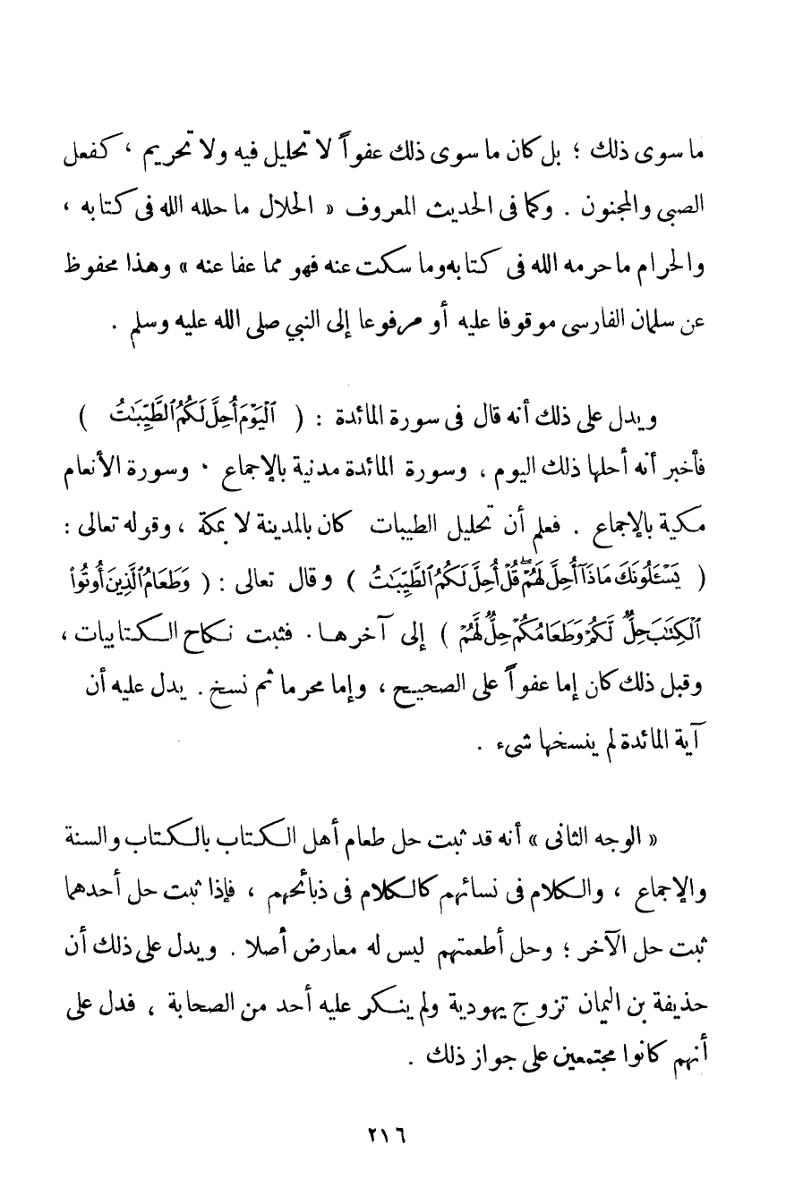 مَا سِوَى ذَلِكَ؛ بَلْ كَانَ مَا سِوَى ذَلِكَ عَفْوًا لَا تَحْلِيلَ فِيهِ وَلَا تَحْرِيمَ كَفِعْلِ الصَّبِيِّ وَالْمَجْنُونِ. وَكَمَا فِي الْحَدِيثِ الْمَعْرُوفِ " {الْحَلَالُ مَا حَلَّلَهُ اللَّهُ فِي كِتَابِهِ وَالْحَرَامُ مَا حَرَّمَهُ اللَّهُ فِي كِتَابِهِ وَمَا سَكَتَ عَنْهُ فَهُوَ مِمَّا عَفَا عَنْهُ} وَهَذَا مَحْفُوظٌ عَنْ سَلْمَانَ الْفَارِسِيِّ مَوْقُوفًا عَلَيْهِ أَوْ مَرْفُوعًا إلَى النَّبِيِّ صَلَّى اللَّهُ عَلَيْهِ وَسَلَّمَ. وَيَدُلُّ عَلَى ذَلِكَ أَنَّهُ قَالَ فِي سُورَةِ الْمَائِدَةِ: {الْيَوْمَ أُحِلَّ لَكُمُ الطَّيِّبَاتُ} فَأَخْبَرَ أَنَّهُ أَحَلَّهَا ذَلِكَ الْيَوْمَ وَسُورَةُ الْمَائِدَةِ مَدَنِيَّةٌ بِالْإِجْمَاعِ وَسُورَةُ الْأَنْعَامِ مَكِّيَّةٌ بِالْإِجْمَاعِ. فَعُلِمَ أَنَّ تَحْلِيلَ الطَّيِّبَاتِ كَانَ بِالْمَدِينَةِ لَا بِمَكَّةَ وَقَوْلُهُ تَعَالَى: {يَسْأَلُونَكَ مَاذَا أُحِلَّ لَهُمْ قُلْ أُحِلَّ لَكُمُ الطَّيِّبَاتُ} وَقَالَ تَعَالَى: {وَطَعَامُ الَّذِينَ أُوتُوا الْكِتَابَ حِلٌّ لَكُمْ وَطَعَامُكُمْ حِلٌّ لَهُمْ} إلَى آخِرِهَا. فَثَبَتَ نِكَاحُ الْكِتَابِيَّاتِ وَقِيلَ ذَلِكَ كَانَ إمَّا عَفْوًا عَلَى الصَّحِيحِ وَإِمَّا مُحَرَّمًا ثُمَّ نُسِخَ. يَدُلُّ عَلَيْهِ أَنَّ آيَةَ الْمَائِدَةِ لَمْ يَنْسَخْهَا شَيْءٌ. " الْوَجْهُ الثَّانِي " أَنَّهُ قَدْ ثَبَتَ حِلُّ طَعَامِ أَهْلِ الْكِتَابِ بِالْكِتَابِ وَالسُّنَّةِ وَالْإِجْمَاعِ وَالْكَلَامُ فِي نِسَائِهِمْ كَالْكَلَامِ فِي ذَبَائِحِهِمْ فَإِذَا ثَبَتَ حِلُّ أَحَدِهِمَا ثَبَتَ حِلُّ الْآخَرِ؛ وَحِلُّ أَطْعِمَتِهِمْ لَيْسَ لَهُ مُعَارِضٌ أَصْلًا. وَيَدُلُّ عَلَى ذَلِكَ أَنَّ حُذَيْفَةَ بْنَ الْيَمَانِ تَزَوَّجَ يَهُودِيَّةً وَلَمْ يُنْكِرْ عَلَيْهِ أَحَدٌ مِنْ الصَّحَابَةِ فَدَلَّ عَلَى أَنَّهُمْ كَانُوا مُجْتَمِعِينَ عَلَى جَوَازِ ذَلِكَ.