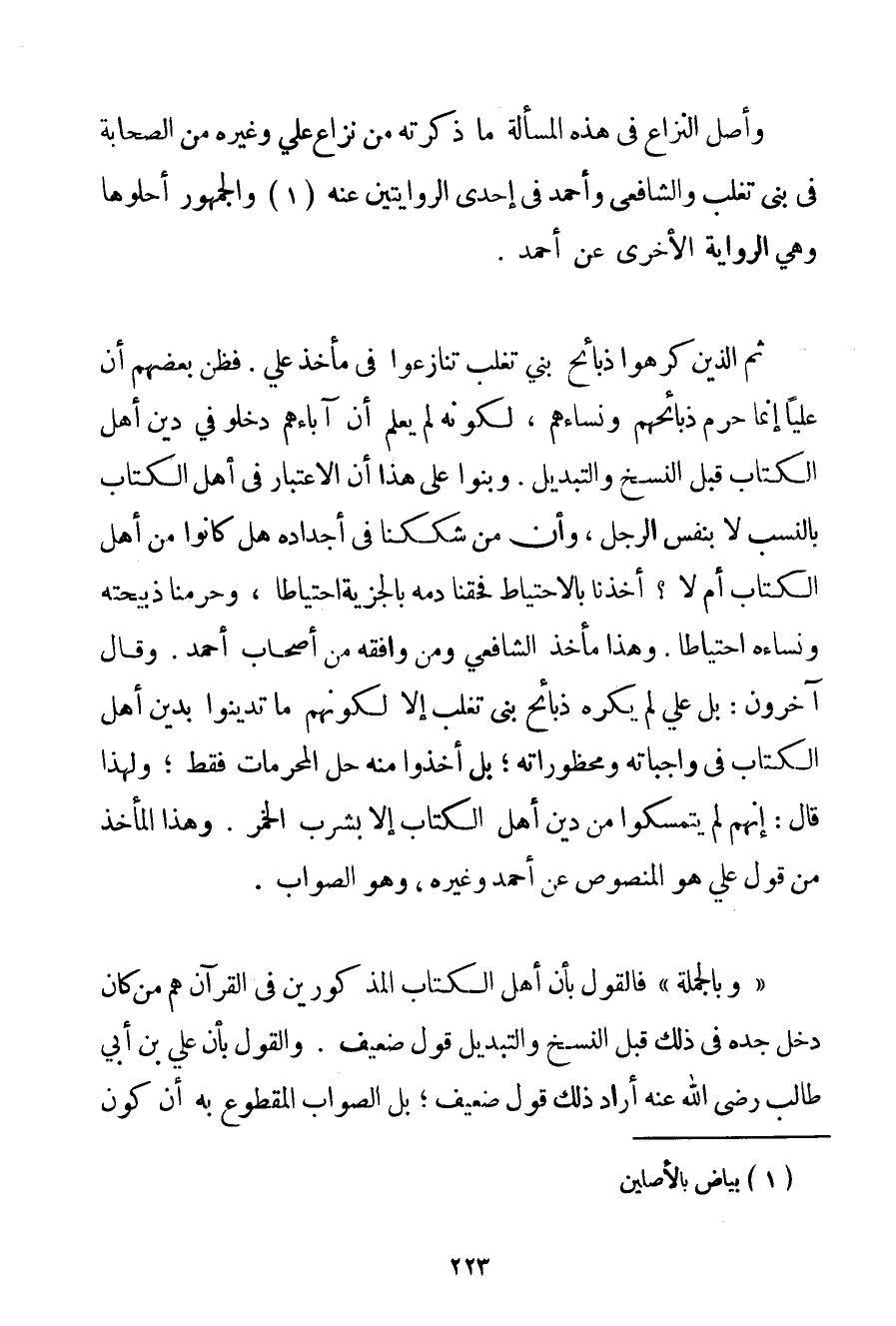 وَأَصْلُ النِّزَاعِ فِي هَذِهِ الْمَسْأَلَةِ مَا ذَكَرْته مِنْ نِزَاعِ عَلِيٍّ وَغَيْرِهِ مِنْ الصَّحَابَةِ فِي بَنِي تَغْلِبَ وَالشَّافِعِيُّ وَأَحْمَد فِي إحْدَى الرِّوَايَتَيْنِ عَنْهُ (1) وَالْجُمْهُورِ أَحَلُّوهَا وَهِيَ الرِّوَايَةُ الْأُخْرَى عَنْ أَحْمَد. ثُمَّ الَّذِينَ كَرِهُوا ذَبَائِحَ بَنِي تَغْلِبَ تَنَازَعُوا فِي مَأْخَذِ عَلِيٍّ. فَظَنَّ بَعْضُهُمْ أَنَّ عَلِيًّا إنَّمَا حَرَّمَ ذَبَائِحَهُمْ وَنِسَاءَهُمْ لِكَوْنِهِ لَمْ يَعْلَمْ أَنَّ آبَاءَهُمْ دَخَلُوا فِي دِين أَهْلِ الْكِتَابِ قَبْلَ النَّسْخِ وَالتَّبْدِيلِ. وَبَنَوْا عَلَى هَذَا أَنَّ الِاعْتِبَارَ فِي أَهْل الْكِتَابِ بِالنَّسَبِ لَا بِنَفْسِ الرَّجُلِ وَأَنَّ مَنْ شَكَكْنَا فِي أَجْدَادِهِ هَلْ كَانُوا مِنْ أَهْلِ الْكِتَابِ أَمْ لَا؟ أَخَذْنَا بِالِاحْتِيَاطِ فَحَقَنَّا دَمَهُ بِالْجِزْيَةِ احْتِيَاطًا وَحَرَّمْنَا ذَبِيحَتَهُ وَنِسَاءَهُ احْتِيَاطًا. وَهَذَا مَأْخَذُ الشَّافِعِيِّ وَمَنْ وَافَقَهُ مِنْ أَصْحَابِ أَحْمَد. وَقَالَ آخَرُونَ: بَلْ عَلِيٌّ لَمْ يَكْرَهْ ذَبَائِحَ بَنِي تَغْلِبَ إلَّا لِكَوْنِهِمْ مَا تَدَيَّنُوا بِدِينِ أَهْلِ الْكِتَابِ فِي وَاجِبَاتِهِ وَمَحْظُورَاتِهِ؛ بَلْ أَخَذُوا مِنْهُ حِلَّ الْمُحَرَّمَاتِ فَقَطْ؛ وَلِهَذَا قَالَ: إنَّهُمْ لَمْ يَتَمَسَّكُوا مِنْ دِينِ أَهْلِ الْكِتَابِ إلَّا بِشُرْبِ الْخَمْرِ. وَهَذَا الْمَأْخَذُ مِنْ قَوْلِ عَلِيٍّ هُوَ الْمَنْصُوصُ عَنْ أَحْمَد وَغَيْرِهِ وَهُوَ الصَّوَابُ. " وَبِالْجُمْلَةِ " فَالْقَوْلُ بِأَنَّ أَهْلَ الْكِتَابِ الْمَذْكُورِينَ فِي الْقُرْآنِ هُمْ مَنْ كَانَ دَخَلَ جَدُّهُ فِي ذَلِكَ قَبْلَ النَّسْخِ وَالتَّبْدِيلِ قَوْلٌ ضَعِيفٌ. وَالْقَوْلُ بِأَنَّ عَلِيَّ بْنَ أَبِي طَالِبٍ رَضِيَ اللَّهُ عَنْهُ أَرَادَ ذَلِكَ قَوْلٌ ضَعِيفٌ؛ بَلْ الصَّوَابُ الْمَقْطُوعُ بِهِ أَنَّ كَوْنَ