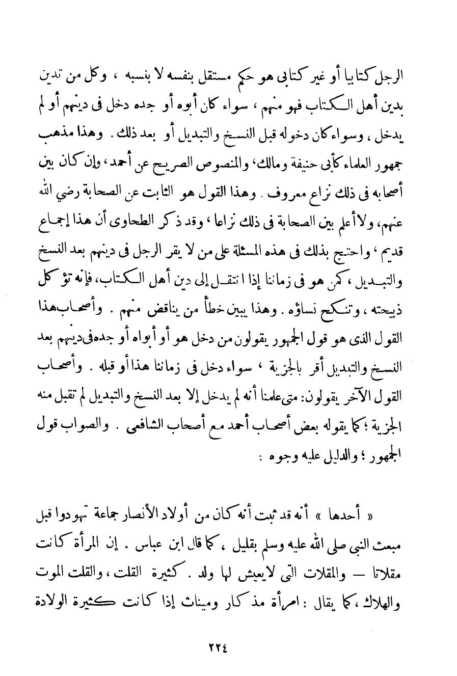 الرَّجُلِ كِتَابِيًّا أَوْ غَيْرَ كِتَابِيٍّ هُوَ حُكْمٌ مُسْتَقِلٌّ بِنَفْسِهِ لَا بِنِسْبَةِ وَكُلُّ مَنْ تَدَيَّنَ بِدِينِ أَهْلِ الْكِتَابِ فَهُوَ مِنْهُمْ سَوَاءٌ كَانَ أَبُوهُ أَوْ جَدُّهُ دَخَلَ فِي دِينِهِمْ أَوْ لَمْ يَدْخُلْ وَسَوَاءٌ كَانَ دُخُولُهُ قَبْلَ النَّسْخِ وَالتَّبْدِيلِ أَوْ بَعْدَ ذَلِكَ. وَهَذَا مَذْهَبُ جُمْهُورِ الْعُلَمَاءِ كَأَبِي حَنِيفَةَ وَمَالِكٍ وَالْمَنْصُوصُ الصَّرِيحُ عَنْ أَحْمَد وَإِنْ كَانَ بَيْنَ أَصْحَابِهِ فِي ذَلِكَ نِزَاعٌ مَعْرُوفٌ. وَهَذَا الْقَوْلُ هُوَ الثَّابِتُ عَنْ الصَّحَابَةِ رَضِيَ اللَّهُ عَنْهُمْ وَلَا أَعْلَمُ بَيْنَ الصَّحَابَةِ فِي ذَلِكَ نِزَاعًا وَقَدْ ذَكَرَ الطَّحَاوِي أَنَّ هَذَا إجْمَاعٌ قَدِيمٌ وَاحْتَجَّ بِذَلِكَ فِي هَذِهِ الْمَسْأَلَةِ عَلَى مَنْ لَا يُقِرُّ الرَّجُلَ فِي دِينِهِمْ بَعْدَ النَّسْخِ وَالتَّبْدِيلِ كَمَنْ هُوَ فِي زَمَانِنَا إذَا انْتَقَلَ إلَى دِينِ أَهْلِ الْكِتَابِ فَإِنَّهُ تُؤْكَلُ ذَبِيحَتُهُ وَتُنْكَحُ نِسَاؤُهُ. وَهَذَا يُبَيِّنُ خَطَأَ مَنْ يُنَاقِضُ مِنْهُمْ. وَأَصْحَابُ هَذَا الْقَوْلِ الَّذِي هُوَ قَوْلُ الْجُمْهُورِ يَقُولُونَ مَنْ دَخَلَ هُوَ أَوْ أَبَوَاهُ أَوْ جَدُّهُ فِي دِينِهِمْ بَعْدَ النَّسْخِ وَالتَّبْدِيلِ أَقَرَّ بِالْجِزْيَةِ سَوَاءٌ دَخَلَ فِي زَمَانِنَا هَذَا أَوْ قَبْلَهُ. وَأَصْحَابُ الْقَوْلِ الْآخَرِ يَقُولُونَ: مَتَى عَلِمْنَا أَنَّهُ لَمْ يَدْخُلْ إلَّا بَعْدَ النَّسْخِ وَالتَّبْدِيلِ لَمْ تُقْبَلْ مِنْهُ الْجِزْيَةُ؛ كَمَا يَقُولُهُ بَعْضُ أَصْحَابِ أَحْمَد مَعَ أَصْحَابِ الشَّافِعِيِّ. وَالصَّوَابُ قَوْلُ الْجُمْهُورِ؛ وَالدَّلِيلِ عَلَيْهِ وُجُوهٌ: " أَحَدُهَا " أَنَّهُ قَدْ ثَبَتَ أَنَّهُ كَانَ مِنْ أَوْلَادِ الْأَنْصَارِ جَمَاعَةٌ تَهَوَّدُوا قَبْلَ مَبْعَثِ النَّبِيِّ صَلَّى اللَّهُ عَلَيْهِ وَسَلَّمَ بِقَلِيلِ كَمَا قَالَ ابْنُ عَبَّاسٍ. إنَّ الْمَرْأَةَ كَانَتْ مِقْلَاتًا - وَالْمُقِلَّاتُ الَّتِي لَا يَعِيشُ لَهَا وَلَدٌ. كَثِيرَةُ الْقَلَتِ وَالْقَلَتُ الْمَوْتُ وَالْهَلَاكُ كَمَا يُقَالُ: امْرَأَةٌ مِذْكَارٌ وميناث إذَا كَانَتْ كَثِيرَةَ الْوِلَادَةِ