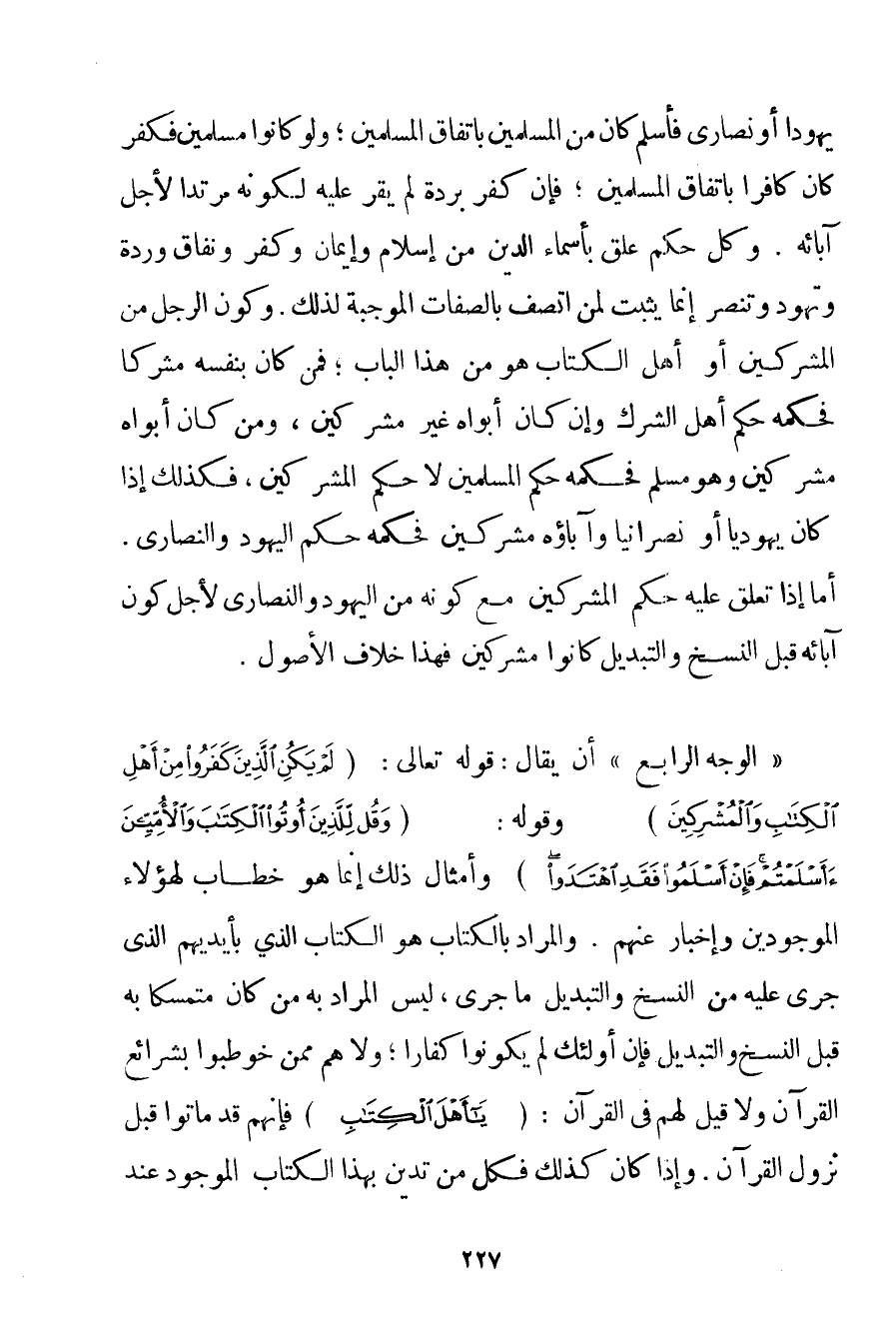 يَهُودًا أَوْ نَصَارَى فَأَسْلَمَ كَانَ مِنْ الْمُسْلِمِينَ بِاتِّفَاقِ الْمُسْلِمِينَ؛ وَلَوْ كَانُوا مُسْلِمِينَ فَكَفَرَ كَانَ كَافِرًا بِاتِّفَاقِ الْمُسْلِمِينَ؛ فَإِنْ كَفَرَ بِرِدَّةِ لَمْ يُقِرَّ عَلَيْهِ لِكَوْنِهِ مُرْتَدًّا لِأَجْلِ آبَائِهِ. وَكُلُّ حُكْمٍ عُلِّقَ بِأَسْمَاءِ الدِّينِ مِنْ إسْلَامٍ وَإِيمَانٍ وَكُفْرٍ وَنِفَاقٍ وَرِدَّةٍ وَتَهَوُّدٍ وَتَنَصُّرٍ إنَّمَا يَثْبُتُ لِمَنْ اتَّصَفَ بِالصِّفَاتِ الْمُوجِبَةِ لِذَلِكَ. وَكَوْنُ الرَّجُلِ مِنْ الْمُشْرِكِينَ أَوْ أَهْلِ الْكِتَابِ هُوَ مِنْ هَذَا الْبَابِ؛ فَمَنْ كَانَ بِنَفْسِهِ مُشْرِكًا فَحُكْمُهُ حُكْمُ أَهْلِ الشِّرْكِ وَإِنْ كَانَ أَبَوَاهُ غَيْرَ مُشْرِكِينَ وَمَنْ كَانَ أَبَوَاهُ مُشْرِكِينَ وَهُوَ مُسْلِمٌ فَحُكْمُهُ حُكْمُ الْمُسْلِمِينَ لَا حُكْمُ الْمُشْرِكِينَ فَكَذَلِكَ إذَا كَانَ يَهُودِيًّا أَوْ نَصْرَانِيًّا وَآبَاؤُهُ مُشْرِكِينَ فَحُكْمُهُ حُكْمُ الْيَهُودِ وَالنَّصَارَى. أَمَّا إذَا تَعَلَّقَ عَلَيْهِ حُكْمُ الْمُشْرِكِينَ مَعَ كَوْنِهِ مِنْ الْيَهُودِ وَالنَّصَارَى لِأَجْلِ كَوْنِ آبَائِهِ قَبْلَ النَّسْخِ وَالتَّبْدِيلِ كَانُوا مُشْرِكِينَ فَهَذَا خِلَافُ الْأُصُولِ. " الْوَجْهُ الرَّابِعُ " أَنْ يُقَالَ: قَوْلُهُ تَعَالَى: {لَمْ يَكُنِ الَّذِينَ كَفَرُوا مِنْ أَهْلِ الْكِتَابِ وَالْمُشْرِكِينَ} وَقَوْلُهُ: {وَقُلْ لِلَّذِينَ أُوتُوا الْكِتَابَ وَالْأُمِّيِّينَ أَأَسْلَمْتُمْ فَإِنْ أَسْلَمُوا فَقَدِ اهْتَدَوْا} وَأَمْثَالُ ذَلِكَ إنَّمَا هُوَ خِطَابٌ لِهَؤُلَاءِ الْمَوْجُودِينَ وَإِخْبَارٌ عَنْهُمْ. وَالْمُرَادُ بِالْكِتَابِ هُوَ الْكِتَابُ الَّذِي بِأَيْدِيهِمْ الَّذِي جَرَى عَلَيْهِ مِنْ النَّسْخِ وَالتَّبْدِيلِ مَا جَرَى لَيْسَ الْمُرَادُ بِهِ مَنْ كَانَ مُتَمَسِّكًا بِهِ قَبْلَ النَّسْخِ وَالتَّبْدِيلِ فَإِنَّ أُولَئِكَ لَمْ يَكُونُوا كُفَّارًا؛ وَلَا هُمْ مِمَّنْ خُوطِبُوا بِشَرَائِعِ الْقُرْآنِ وَلَا قِيلَ لَهُمْ فِي الْقُرْآنِ: {يَا أَهْلَ الْكِتَابِ} فَإِنَّهُمْ قَدْ مَاتُوا قَبْلَ نُزُولِ الْقُرْآنِ. وَإِذَا كَانَ كَذَلِكَ فَكُلُّ مَنْ تَدَيَّنَ بِهَذَا الْكِتَابِ الْمَوْجُودِ عِنْد