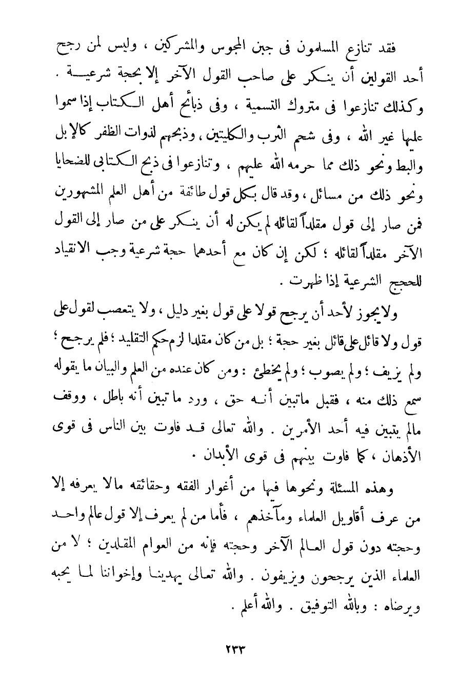 فَقَدْ تَنَازَعَ الْمُسْلِمُونَ فِي جُبْنِ الْمَجُوسِ وَالْمُشْرِكِينَ فَلَيْسَ لِمَنْ رَجَّحَ أَحَدَ الْقَوْلَيْنِ أَنْ يُنْكِرَ عَلَى صَاحِبِ الْقَوْلِ الْآخَرِ إلَّا بِحُجَّةِ شَرْعِيَّةٍ. وَكَذَلِكَ تَنَازَعُوا فِي مَتْرُوكِ التَّسْمِيَةِ وَفِي ذَبَائِحِ أَهْلِ الْكِتَابِ إذَا سَمَّوْا عَلَيْهَا غَيْرَ اللَّهِ وَفِي شَحْمِ الثَّرْبِ وَالْكُلْيَتَيْنِ وَذَبْحِهِمْ لِذَوَاتِ الظُّفْرِ كَالْإِبِلِ وَالْبَطِّ وَنَحْوِ ذَلِكَ مِمَّا حَرَّمَهُ اللَّهُ عَلَيْهِمْ وَتَنَازَعُوا فِي ذَبْحِ الْكِتَابِيِّ لِلضَّحَايَا وَنَحْوِ ذَلِكَ مِنْ مَسَائِلَ وَقَدْ قَالَ بِكُلِّ قَوْلٍ طَائِفَةٌ مِنْ أَهْلِ الْعِلْمِ الْمَشْهُورِينَ فَمَنْ صَارَ إلَى قَوْلٍ مُقَلِّدًا لِقَائِلِهِ لَمْ يَكُنْ لَهُ أَنْ يُنْكِرَ عَلَى مَنْ صَارَ إلَى الْقَوْلِ الْآخَرِ مُقَلِّدًا لِقَائِلِهِ؛ لَكِنْ إنْ كَانَ مَعَ أَحَدِهِمَا حُجَّةٌ شَرْعِيَّةٌ وَجَبَ الِانْقِيَادُ لِلْحُجَجِ الشَّرْعِيَّةِ إذَا ظَهَرَتْ. وَلَا يَجُوزُ لِأَحَدِ أَنْ يُرْجِعَ قَوْلًا عَلَى قَوْلٍ بِغَيْرِ دَلِيلٍ وَلَا يَتَعَصَّبُ لِقَوْلِ عَلَى قَوْلٍ وَلَا قَائِلٍ عَلَى قَائِلٍ بِغَيْرِ حُجَّةٍ؛ بَلْ مَنْ كَانَ مُقَلِّدًا لَزِمَ حُكْمَ التَّقْلِيدِ؛ فَلَمْ يُرَجِّحْ؛ وَلَمْ يُزَيِّفْ؛ وَلَمْ يُصَوِّبْ؛ وَلَمْ يُخَطِّئْ: وَمَنْ كَانَ عِنْدَهُ مِنْ الْعِلْمِ وَالْبَيَانِ مَا يَقُولُهُ سُمِعَ ذَلِكَ مِنْهُ فَقَبِلَ مَا تَبَيَّنَ أَنَّهُ حَقٌّ وَرَدَّ مَا تَبَيَّنَ أَنَّهُ بَاطِلٌ وَوَقَفَ مَا لَمْ يَتَبَيَّنْ فِيهِ أَحَدَ الْأَمْرَيْنِ. وَاَللَّهُ تَعَالَى قَدْ فَاوَتَ بَيْنَ النَّاسِ فِي قُوَى الْأَذْهَانِ كَمَا فَاوَتَ بَيْنَهُمْ فِي قُوَى الْأَبْدَانِ. وَهَذِهِ الْمَسْأَلَةُ وَنَحْوُهَا فِيهَا مِنْ أَغْوَارِ الْفِقْهِ وَحَقَائِقِهِ مَا لَا يَعْرِفُهُ إلَّا مَنْ عَرَفَ أَقَاوِيلَ الْعُلَمَاءِ وَمَآخِذَهُمْ فَأَمَّا مَنْ لَمْ يَعْرِفْ إلَّا قَوْلَ عَالِمٍ وَاحِدٍ وَحُجَّتَهُ دُونَ قَوْلِ الْعَالِمِ الْآخَرِ وَحُجَّتِهِ فَإِنَّهُ مِنْ الْعَوَامِّ الْمُقَلِّدِينَ؛ لَا مِنْ الْعُلَمَاءِ الَّذِينَ يُرَجِّحُونَ وَيُزَيِّفُونَ. وَاَللَّهُ تَعَالَى يَهْدِينَا وَإِخْوَانَنَا لِمَا يُحِبُّهُ وَيَرْضَاهُ: وَبِاَللَّهِ التَّوْفِيقُ. وَاَللَّهُ أَعْلَمُ.