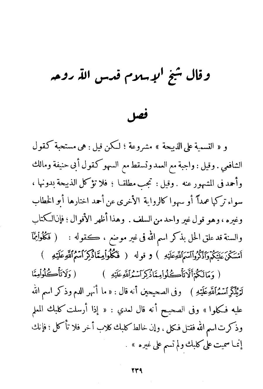 وَ " التَّسْمِيَةُ عَلَى الذَّبِيحَةِ " مَشْرُوعَةٌ؛ لَكِنْ قِيلَ: هِيَ مُسْتَحَبَّةٌ كَقَوْلِ الشَّافِعِيِّ. وَقِيلَ: وَاجِبَةٌ مَعَ الْعَمْدِ وَتَسْقُطُ مَعَ السَّهْوِ كَقَوْلِ أَبِي حَنِيفَةَ وَمَالِكٍ وَأَحْمَد فِي الْمَشْهُورِ عَنْهُ. وَقِيلَ: تَجِبُ مُطْلَقًا؛ فَلَا تُؤْكَلُ الذَّبِيحَةُ بِدُونِهَا سَوَاءٌ تَرَكَهَا عَمْدًا أَوْ سَهْوًا كَالرِّوَايَةِ الْأُخْرَى عَنْ أَحْمَد اخْتَارَهَا أَبُو الْخَطَّابِ وَغَيْرُهُ وَهُوَ قَوْلُ غَيْرِ وَاحِدٍ مِنْ السَّلَفِ. وَهَذَا أَظْهَرُ الْأَقْوَالِ؛ فَإِنَّ الْكِتَابَ وَالسُّنَّةَ قَدْ عَلَّقَ الْحَلَّ بِذِكْرِ اسْمِ اللَّهِ فِي غَيْرِ مَوْضِعٍ كَقَوْلِهِ: {فَكُلُوا مِمَّا أَمْسَكْنَ عَلَيْكُمْ وَاذْكُرُوا اسْمَ اللَّهِ عَلَيْهِ} وَقَوْلِهِ {فَكُلُوا مِمَّا ذُكِرَ اسْمُ اللَّهِ عَلَيْهِ} {وَمَا لَكُمْ أَلَّا تَأْكُلُوا مِمَّا ذُكِرَ اسْمُ اللَّهِ عَلَيْهِ} {وَلَا تَأْكُلُوا مِمَّا لَمْ يُذْكَرِ اسْمُ اللَّهِ عَلَيْهِ} وَفِي الصَّحِيحَيْنِ أَنَّهُ قَالَ: " {مَا أَنْهَرَ الدَّمَ وَذُكِرَ اسْمُ اللَّهِ عَلَيْهِ فَكُلُوا} وَفِي الصَّحِيحِ أَنَّهُ قَالَ لَعَدِيٍّ: " {إذَا أَرْسَلْت كَلْبَك الْمُعَلَّمَ وَذَكَرْت اسْمَ اللَّهِ فَقَتَلَ فَكُلْ وَإِنْ خَالَطَ كَلْبَك كِلَابُ آخَرَ فَلَا تَأْكُلْ؛ فَإِنَّك إنَّمَا سَمَّيْت عَلَى كَلْبِك وَلَمْ تُسَمِّ عَلَى غَيْرِهِ} .