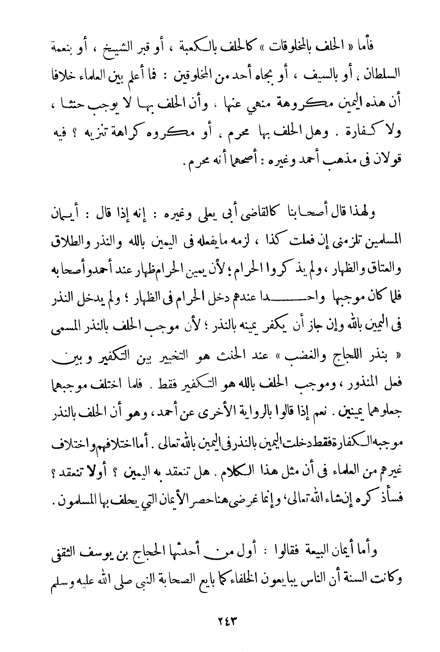 فَأَمَّا " الْحَلِفُ بِالْمَخْلُوقَاتِ " كَالْحَلِفِ بِالْكَعْبَةِ أَوْ قَبْرِ الشَّيْخِ أَوْ بِنِعْمَةِ السُّلْطَانِ أَوْ بِالسَّيْفِ أَوْ بِجَاهِ أَحَدٍ مِنْ الْمَخْلُوقِينَ: فَمَا أَعْلَمُ بَيْنَ الْعُلَمَاءِ خِلَافًا أَنَّ هَذِهِ الْيَمِينَ مَكْرُوهَةٌ مَنْهِيٌّ عَنْهَا وَأَنَّ الْحَلِفَ بِهَا لَا يُوجِبُ حِنْثًا وَلَا كَفَّارَةً. وَهَلْ الْحَلِفُ بِهَا مُحَرَّمٌ أَوْ مَكْرُوهٌ كَرَاهَةَ تَنْزِيهٍ؟ فِيهِ قَوْلَانِ فِي مَذْهَبِ أَحْمَد وَغَيْرِهِ: أَصَحُّهُمَا أَنَّهُ مُحَرَّمٌ. وَلِهَذَا قَالَ أَصْحَابُنَا كَالْقَاضِي أَبِي يَعْلَى وَغَيْرِهِ: إنَّهُ إذَا قَالَ: أَيْمَانُ الْمُسْلِمِينَ تَلْزَمُنِي إنْ فَعَلْت كَذَا لَزِمَهُ مَا يَفْعَلُهُ فِي الْيَمِينِ بِاَللَّهِ وَالنَّذْرِ وَالطَّلَاقِ وَالْعِتَاقِ وَالظِّهَارِ وَلَمْ يَذْكُرُوا الْحَرَامَ؛ لِأَنَّ يَمِينَ الْحَرَامِ ظِهَارٌ عِنْدَ أَحْمَد وَأَصْحَابِهِ فَلَمَّا كَانَ مُوجَبُهَا وَاحِدًا عِنْدَهُمْ دَخَلَ الْحَرَامُ فِي الظِّهَارِ؛ وَلَمْ يَدْخُلْ النَّذْرُ فِي الْيَمِينِ بِاَللَّهِ وَإِنْ جَازَ أَنْ يُكَفِّرَ يَمِينَهُ بِالنَّذْرِ؛ لِأَنَّ مُوجَبَ الْحَلِفِ بِالنَّذْرِ الْمُسَمَّى " بِنَذْرِ اللَّجَاجِ وَالْغَضَبِ " عِنْدَ الْحِنْثِ هُوَ التَّخْيِيرُ بَيْنَ التَّكْفِيرِ وَبَيْنَ فِعْلِ الْمَنْذُورِ وَمُوجَبِ الْحَلِفِ بِاَللَّهِ هُوَ التَّكْفِيرُ فَقَطْ. فَلَمَّا اخْتَلَفَ مُوجَبُهُمَا جَعَلُوهُمَا يَمِينَيْنِ. نَعَمْ إذَا قَالُوا بِالرِّوَايَةِ الْأُخْرَى عَنْ أَحْمَد وَهُوَ أَنَّ الْحَلِفَ بِالنَّذْرِ مُوجَبُهُ الْكَفَّارَةُ فَقَطْ دَخَلَتْ الْيَمِينُ بِالنَّذْرِ فِي الْيَمِينِ بِاَللَّهِ تَعَالَى. أَمَّا اخْتِلَافُهُمْ وَاخْتِلَافُ غَيْرِهِمْ مِنْ الْعُلَمَاءِ فِي أَنَّ مِثْلَ هَذَا الْكَلَامِ. هَلْ تَنْعَقِدُ بِهِ الْيَمِينُ؟ أَوْ لَا تَنْعَقِدُ؟ فَسَأَذْكُرُهُ إنْ شَاءَ اللَّهُ تَعَالَى وَإِنَّمَا غَرَضِي هُنَا حَصْرُ الْأَيْمَانِ الَّتِي يَحْلِفُ بِهَا الْمُسْلِمُونَ. وَأَمَّا أَيْمَانُ الْبَيْعَةِ فَقَالُوا: أَوَّلُ مَنْ أَحْدَثَهَا الْحَجَّاجُ بْنُ يُوسُفَ الثَّقَفِيُّ وَكَانَتْ السُّنَّةُ أَنَّ النَّاسَ يُبَايِعُونَ الْخُلَفَاءَ كَمَا بَايَعَ الصَّحَابَةُ النَّبِيَّ صَلَّى اللَّهُ عَلَيْهِ وَسَلَّمَ