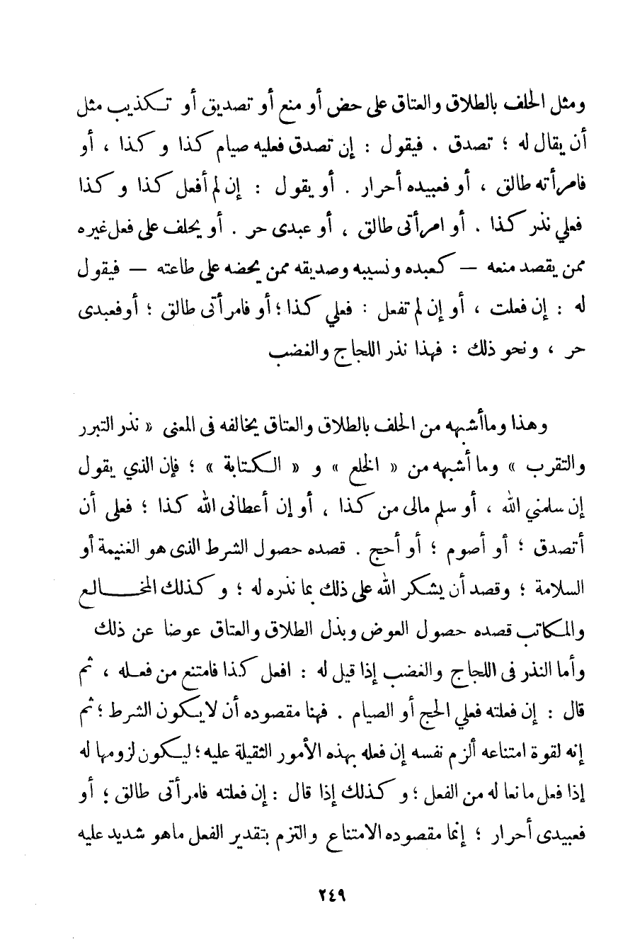 وَمِثْلُ الْحَلِفِ بِالطَّلَاقِ وَالْعِتَاقِ عَلَى حَضٍّ أَوْ مَنْعٍ أَوْ تَصْدِيقٍ أَوْ تَكْذِيبٍ مِثْلُ أَنْ يُقَالَ لَهُ؛ تَصَدَّقْ. فَيَقُولُ: إنْ تَصَدَّقَ فَعَلَيْهِ صِيَامُ كَذَا وَكَذَا أَوْ فَامْرَأَتُهُ طَالِقٌ أَوْ فَعَبِيدُهُ أَحْرَارٌ. أَوْ يَقُولَ: إنْ لَمْ أَفْعَلْ كَذَا وَكَذَا فَعَلَيَّ نَذْرُ كَذَا أَوْ امْرَأَتِي طَالِقٌ أَوْ عَبْدِي حُرٌّ. أَوْ يَحْلِفُ عَلَى فِعْلِ غَيْرِهِ مِمَّنْ يَقْصِدُ مَنْعَهُ - كَعَبْدِهِ وَنَسِيبِهِ وَصَدِيقِهِ مِمَّنْ يَحُضُّهُ عَلَى طَاعَتِهِ - فَيَقُولُ لَهُ: إنْ فَعَلْت أَوْ إنْ لَمْ تَفْعَلْ: فَعَلَيَّ كَذَا؛ أَوْ فَامْرَأَتِي طَالِقٌ؛ أَوْ فَعَبْدِي حُرٌّ وَنَحْوَ ذَلِكَ: فَهَذَا نَذْرُ اللَّجَاجِ وَالْغَضَبِ. وَهَذَا وَمَا أَشْبَهَهُ مِنْ الْحَلِفِ بِالطَّلَاقِ وَالْعِتَاقِ يُخَالِفُهُ فِي الْمَعْنَى " نَذْرُ التَّبَرُّرِ وَالتَّقَرُّبِ " وَمَا أَشْبَهَهُ مِنْ " الْخُلْعِ " و " الْكِتَابَةِ "؛ فَإِنَّ الَّذِي يَقُولُ إنْ سَلَّمَنِي اللَّهُ أَوْ سَلَّمَ مَالِي مِنْ كَذَا أَوْ إنْ أَعْطَانِي اللَّهُ كَذَا؛ فَعَلَيَّ أَنْ أَتَصَدَّقَ؛ أَوْ أَصُومَ؛ أَوْ أَحُجَّ. قَصْدُهُ حُصُولُ الشَّرْطِ الَّذِي هُوَ الْغَنِيمَةُ أَوْ السَّلَامَةُ؛ وَقَصَدَ أَنْ يَشْكُرَ اللَّهَ عَلَى ذَلِكَ بِمَا نَذَرَهُ لَهُ؛ وَكَذَلِكَ الْمُخَالِعُ وَالْمَكَاتِبُ قَصْدُهُ حُصُولُ الْعِوَضِ وَبَذْلُ الطَّلَاقِ وَالْعِتَاقِ عِوَضًا عَنْ ذَلِكَ وَأَمَّا النَّذْرُ فِي اللَّجَاجِ وَالْغَضَبِ إذَا قِيلَ لَهُ: افْعَلْ كَذَا فَامْتَنَعَ مِنْ فِعْلِهِ ثُمَّ قَالَ: إنْ فَعُلْته فَعَلَيَّ الْحَجُّ أَوْ الصِّيَامُ. فَهُنَا مَقْصُودُهُ أَنْ لَا يَكُونَ الشَّرْطُ؛ ثُمَّ إنَّهُ لِقُوَّةِ امْتِنَاعِهِ أَلْزَمَ نَفْسَهُ إنْ فَعَلَهُ بِهَذِهِ الْأُمُورِ الثَّقِيلَةِ عَلَيْهِ؛ لِيَكُونَ لُزُومُهَا لَهُ إذَا فَعَلَ مَانِعًا لَهُ مِنْ الْفِعْلِ؛ وَكَذَلِكَ إذَا قَالَ: إنْ فَعَلْته فَامْرَأَتِي طَالِقٌ؛ أَوْ فَعَبِيدِي أَحْرَارٌ؛ إنَّمَا مَقْصُودُهُ الِامْتِنَاعُ وَالْتَزَمَ بِتَقْدِيرِ الْفِعْلِ مَا هُوَ شَدِيدٌ عَلَيْهِ