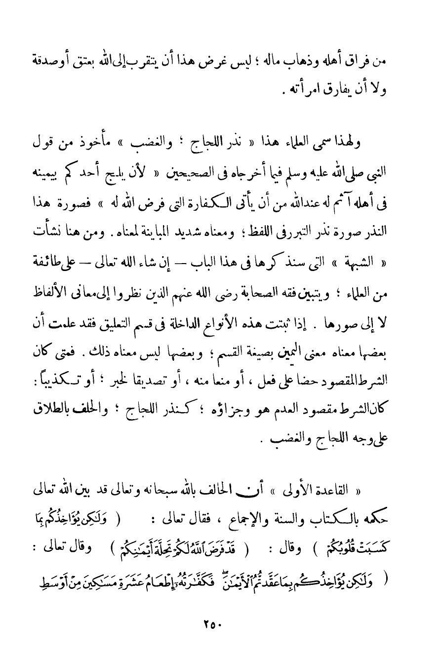 مِنْ فِرَاقِ أَهْلِهِ وَذَهَابِ مَالِهِ؛ لَيْسَ غَرَضُ هَذَا أَنْ يَتَقَرَّبَ إلَى اللَّهِ بِعِتْقِ أَوْ صَدَقَةٍ وَلَا أَنْ يُفَارِقَ امْرَأَتَهُ. وَلِهَذَا سَمَّى الْعُلَمَاءُ هَذَا " نَذْرَ اللَّجَاجِ؛ وَالْغَضَبِ " مَأْخُوذٌ مِنْ قَوْلِ النَّبِيِّ صَلَّى اللَّهُ عَلَيْهِ وَسَلَّمَ فِيمَا أَخْرَجَاهُ فِي الصَّحِيحَيْنِ " {لَأَنْ يَلِجَ أَحَدُكُمْ بِيَمِينِهِ فِي أَهْلِهِ آثَمَ لَهُ عِنْدَ اللَّهِ مِنْ أَنْ يَأْتِيَ الْكَفَّارَةَ الَّتِي فَرَضَ اللَّهُ لَهُ} " فَصُورَةُ هَذَا النَّذْرِ صُورَةُ نَذْرِ التَّبَرُّرِ فِي اللَّفْظِ؛ وَمَعْنَاهُ شَدِيدُ الْمُبَايَنَةِ لِمَعْنَاهُ. وَمِنْ هنا نَشَأَتْ " الشُّبْهَةُ " الَّتِي سَنَذْكُرُهَا فِي هَذَا الْبَابِ - إنْ شَاءَ اللَّهُ تَعَالَى - عَلَى طَائِفَةٍ مِنْ الْعُلَمَاءِ؛ وَيَتَبَيَّنُ فِقْهُ الصَّحَابَةِ رَضِيَ اللَّهُ عَنْهُمْ الَّذِينَ نَظَرُوا إلَى مَعَانِي الْأَلْفَاظِ لَا إلَى صُوَرِهَا. إذَا ثَبَتَتْ هَذِهِ الْأَنْوَاعُ الدَّاخِلَةُ فِي قِسْمِ التَّعْلِيقِ فَقَدْ عَلِمْت أَنَّ بَعْضَهَا مَعْنَاهُ مَعْنَى الْيَمِينِ بِصِيغَةِ الْقَسَمِ؛ وَبَعْضَهَا لَيْسَ مَعْنَاهُ ذَلِكَ. فَمَتَى كَانَ الشَّرْطُ الْمَقْصُودُ حَضًّا عَلَى فِعْلٍ أَوْ مَنْعًا مِنْهُ أَوْ تَصْدِيقًا لِخَبَرِ؛ أَوْ تَكْذِيبًا: كَانَ الشَّرْطُ مَقْصُودَ الْعَدَمِ هُوَ وَجَزَاؤُهُ؛ كَنَذْرِ اللَّجَاجِ؛ وَالْحَلِفِ بِالطَّلَاقِ عَلَى وَجْهِ اللَّجَاجِ وَالْغَضَبِ. " الْقَاعِدَةُ الْأُولَى " أَنَّ الْحَالِفَ بِاَللَّهِ سُبْحَانَهُ وَتَعَالَى قَدْ بَيَّنَ اللَّهُ تَعَالَى حُكْمَهُ بِالْكِتَابِ وَالسُّنَّةِ وَالْإِجْمَاعِ فَقَالَ تَعَالَى: {وَلَكِنْ يُؤَاخِذُكُمْ بِمَا كَسَبَتْ قُلُوبُكُمْ} وَقَالَ: {قَدْ فَرَضَ اللَّهُ لَكُمْ تَحِلَّةَ أَيْمَانِكُمْ} وَقَالَ تَعَالَى: {وَلَكِنْ يُؤَاخِذُكُمْ بِمَا عَقَّدْتُمُ الْأَيْمَانَ فَكَفَّارَتُهُ إطْعَامُ عَشَرَةِ مَسَاكِينَ