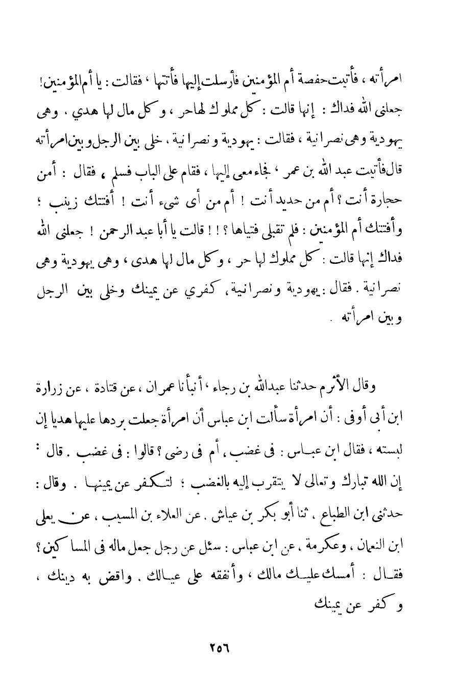 امْرَأَتِهِ فَأَتَيْت حَفْصَةَ أُمَّ الْمُؤْمِنِينَ فَأَرْسَلَتْ إلَيْهَا فَأَتَتْهَا فَقَالَتْ: يَا أُمَّ الْمُؤْمِنِينَ جَعَلَنِي اللَّهُ فِدَاك: إنَّهَا قَالَتْ: كُلُّ مَمْلُوكٍ لَهَا حُرٌّ وَكُلُّ مَالٍ لَهَا هَدْيٌ وَهِيَ يَهُودِيَّةٌ وَهِيَ نَصْرَانِيَّةٌ فَقَالَتْ: يَهُودِيَّةٌ وَنَصْرَانِيَّةٌ خَلِّي بَيْنَ الرَّجُلِ وَبَيْنَ امْرَأَتِهِ قَالَ فَأَتَيْت عَبْدَ اللَّهِ بْنَ عُمَرَ فَجَاءَ مَعِي إلَيْهَا فَقَامَ عَلَى الْبَابِ فَسَلَّمَ فَقَالَ: أَمِنْ حِجَارَةٍ أَنْتِ؟ أَمْ مِنْ حَدِيدٍ أَنْتِ أَمْ مِنْ أَيِّ شَيْءٍ أَنْتِ أَفْتَتْك زَيْنَبُ؛ وَأَفْتَتْك أُمُّ الْمُؤْمِنِينَ: فَلَمْ تَقْبَلِي فُتْيَاهَا قَالَتْ يَا أَبَا عَبْدِ الرَّحْمَنِ جَعَلَنِي اللَّهُ فِدَاك إنَّهَا قَالَتْ: كُلُّ مَمْلُوكٍ لَهَا حُرٌّ وَكُلُّ مَالٍ لَهَا هَدْيٌ وَهِيَ يَهُودِيَّةٌ وَهِيَ نَصْرَانِيَّةٌ. فَقَالَ: يَهُودِيَّةٌ وَنَصْرَانِيَّةٌ كَفِّرِي عَنْ يَمِينِك وَخَلِّي بَيْنَ الرَّجُلِ وَبَيْنَ امْرَأَتِهِ. وَقَالَ الْأَثْرَمُ حَدَّثَنَا عَبْدُ اللَّهِ بْنُ رَجَاءٍ أَنْبَأَنَا عِمْرَانُ عَنْ قتادة عَنْ زرارة بْنِ أَبِي أَوْفَى: أَنَّ امْرَأَةً سَأَلَتْ ابْنَ عَبَّاسٍ أَنَّ امْرَأَةً جَعَلَتْ بُرْدَهَا عَلَيْهَا هَدْيًا إنْ لَبِسَتْهُ فَقَالَ ابْنُ عَبَّاسٍ: فِي غَضَبٍ أَمْ فِي رِضًى؟ قَالُوا: فِي غَضَبٍ. قَالَ: إنَّ اللَّهَ تَبَارَكَ وَتَعَالَى لَا يُتَقَرَّبُ إلَيْهِ بِالْغَضَبِ؛ لِتُكَفِّر عَنْ يَمِينِهَا. وَقَالَ: حَدَّثَنِي ابْنُ الطَّبَّاعِ ثَنَا أَبُو بَكْرِ بْنُ عَيَّاشٍ. عَنْ الْعَلَاءِ بْنِ الْمُسَيِّبِ عَنْ يَعْلَى بْنِ النُّعْمَانِ وَعِكْرِمَةَ عَنْ ابْنِ عَبَّاسٍ: سُئِلَ عَنْ رَجُلٍ جَعَلَ مَالَهُ فِي الْمَسَاكِينِ؟ فَقَالَ: أَمْسِكْ عَلَيْك مَالَك وَأَنْفِقْهُ عَلَى عِيَالِك. وَاقْضِ بِهِ دَيْنَك وَكَفِّرْ عَنْ يَمِينِك