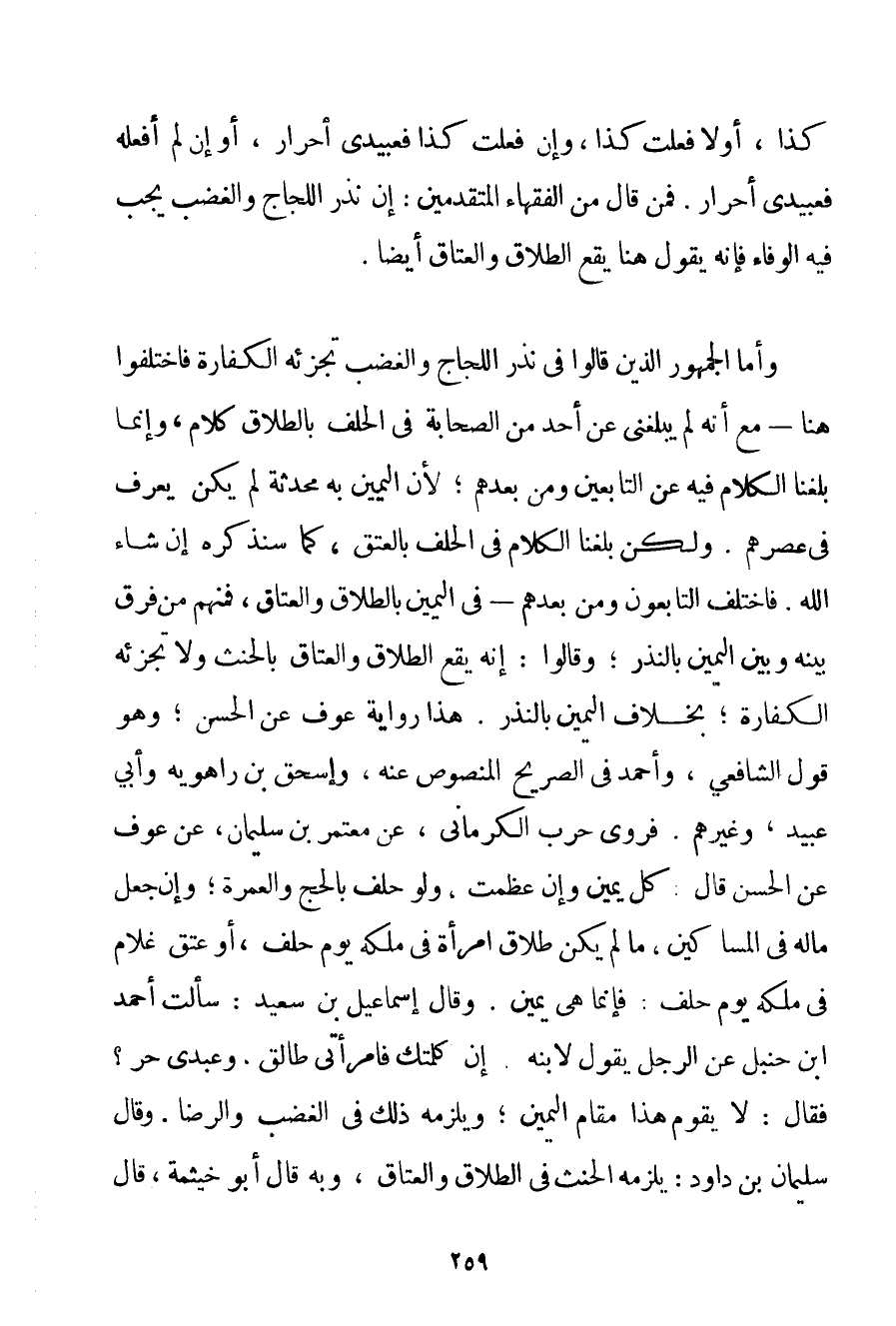 كَذَا أَوْ لَا فَعَلْت كَذَا وَإِنْ فَعَلْت كَذَا فَعَبِيدِي أَحْرَارٌ أَوْ إنْ لَمْ أَفْعَلْهُ فَعَبِيدِي أَحْرَارٌ. فَمَنْ قَالَ مِنْ الْفُقَهَاءِ الْمُتَقَدِّمِينَ: إنَّ نَذْرَ اللَّجَاجِ وَالْغَضَبِ يَجِبُ فِيهِ الْوَفَاءُ فَإِنَّهُ يَقُولُ هُنَا يَقَعُ الطَّلَاقُ وَالْعِتَاقُ أَيْضًا. وَأَمَّا الْجُمْهُورُ الَّذِينَ قَالُوا فِي نَذْرِ اللَّجَاجِ وَالْغَضَبِ تُجْزِئُهُ الْكَفَّارَةُ فَاخْتَلَفُوا هُنَا - مَعَ أَنَّهُ لَمْ يَبْلُغْنِي عَنْ أَحَدٍ مِنْ الصَّحَابَةِ فِي الْحَلِفِ بِالطَّلَاقِ كَلَامٌ وَإِنَّمَا بَلَغَنَا الْكَلَامُ فِيهِ عَنْ التَّابِعِينَ وَمَنْ بَعْدَهُمْ؛ لِأَنَّ الْيَمِينَ بِهِ مُحْدَثَةٌ لَمْ يَكُنْ يُعْرَفُ فِي عَصْرِهِمْ. وَلَكِنْ بَلَغَنَا الْكَلَامُ فِي الْحَلِفِ بِالْعِتْقِ كَمَا سَنَذْكُرُهُ إنْ شَاءَ اللَّهُ. فَاخْتَلَفَ التَّابِعُونَ وَمَنْ بَعْدَهُمْ - فِي الْيَمِينِ بِالطَّلَاقِ وَالْعِتَاقِ فَمِنْهُمْ مَنْ فَرَّقَ بَيْنَهُ وَبَيْنَ الْيَمِينِ بِالنَّذْرِ؛ وَقَالُوا: إنَّهُ يَقَعُ الطَّلَاقُ وَالْعِتَاقُ بِالْحِنْثِ وَلَا تُجْزِئُهُ الْكَفَّارَةُ؛ بِخِلَافِ الْيَمِينِ بِالنَّذْرِ. هَذَا رِوَايَةُ عَوْفٍ عَنْ الْحَسَنِ؛ وَهُوَ قَوْلُ الشَّافِعِيِّ وَأَحْمَد فِي الصَّرِيحِ الْمَنْصُوصِ عَنْهُ وَإِسْحَاقَ بْنِ رَاهَوَيْه وَأَبِي عُبَيْدٍ وَغَيْرِهِمْ. فَرَوَى حَرْبٌ الكرماني عَنْ مُعْتَمِرِ بْنِ سُلَيْمَانَ عَنْ عَوْفٍ عَنْ الْحَسَنِ قَالَ: كُلُّ يَمِينٍ وَإِنْ عَظُمَتْ وَلَوْ حَلَفَ بِالْحَجِّ وَالْعُمْرَةِ؛ وَإِنْ جَعَلَ مَالَهُ فِي الْمَسَاكِينِ مَا لَمْ يَكُنْ طَلَاقَ امْرَأَةٍ فِي مِلْكِهِ يَوْمَ حَلَفَ أَوْ عِتْقَ غُلَامٍ فِي مِلْكِهِ يَوْمَ حَلَفَ. فَإِنَّمَا هِيَ يَمِينٌ. وَقَالَ إسْمَاعِيلُ بْنُ سَعِيدٍ: سَأَلْت أَحْمَد بْنَ حَنْبَلٍ عَنْ الرَّجُلِ يَقُولُ لِابْنِهِ إنْ كَلَّمْتُك فَامْرَأَتِي طَالِقٌ وَعَبْدِي حُرٌّ؟ فَقَالَ: لَا يَقُومُ هَذَا مَقَامَ الْيَمِينِ؛ وَيَلْزَمُهُ ذَلِكَ فِي الْغَضَبِ وَالرِّضَا. وَقَالَ سُلَيْمَانُ بْنُ دَاوُد: يَلْزَمُهُ الْحِنْثُ فِي الطَّلَاقِ وَالْعِتَاقِ وَبِهِ قَالَ أَبُو خيثمة قَالَ