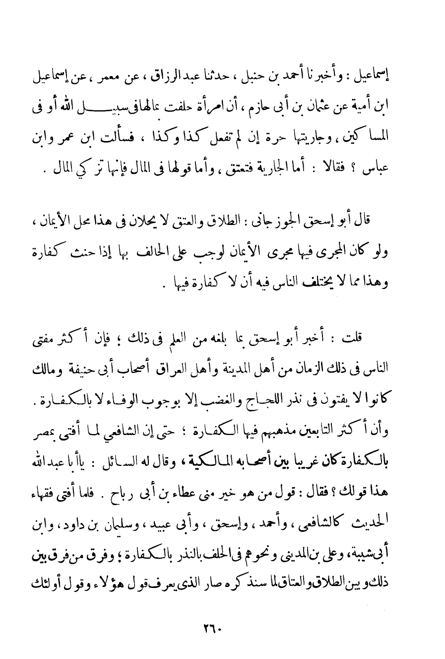 إسْمَاعِيلُ: وَأَخْبَرَنَا أَحْمَد بْنُ حَنْبَلٍ حَدَّثَنَا عَبْدُ الرَّزَّاقِ عَنْ مَعْمَرٍ عَنْ إسْمَاعِيلَ بْنِ أُمَيَّةَ عَنْ عُثْمَانَ بْنِ أَبِي حَازِمٍ أَنَّ امْرَأَةً حَلَفَتْ بِمَالِهَا فِي سَبِيلِ اللَّهِ أَوْ فِي الْمَسَاكِينِ وَجَارِيَتُهَا حُرَّةٌ إنْ لَمْ تَفْعَلْ كَذَا وَكَذَا فَسَأَلَتْ ابْنَ عُمَرَ وَابْنَ عَبَّاسٍ؟ فَقَالَا: أَمَّا الْجَارِيَةُ فَتَعْتِقُ وَأَمَّا قَوْلُهَا فِي الْمَالِ فَإِنَّهَا تُزَكِّي الْمَالَ. قَالَ أَبُو إسْحَاقَ الجوزجاني: الطَّلَاقُ وَالْعِتْقُ لَا يَحِلَّانِ فِي هَذَا مَحَلَّ الْأَيْمَانِ وَلَوْ كَانَ الْمَجْرَى فِيهَا مَجْرَى الْأَيْمَانِ لَوَجَبَ عَلَى الْحَالِفِ بِهَا إذَا حَنِثَ كَفَّارَةٌ وَهَذَا مِمَّا لَا يَخْتَلِفُ النَّاسُ فِيهِ أَنْ لَا كَفَّارَةَ فِيهَا. قُلْت: أَخْبَرَ أَبُو إسْحَاقَ بِمَا بَلَغَهُ مِنْ الْعِلْمِ فِي ذَلِكَ؛ فَإِنَّ أَكْثَرَ مفتيي النَّاسِ فِي ذَلِكَ الزَّمَانِ مِنْ أَهْلِ الْمَدِينَةِ وَأَهْلُ الْعِرَاقِ أَصْحَابُ أَبِي حَنِيفَةَ وَمَالِكٍ كَانُوا لَا يُفْتُونَ فِي نَذْرِ اللَّجَاجِ وَالْغَضَبِ إلَّا بِوُجُوبِ الْوَفَاءِ لَا بِالْكَفَّارَةِ. وَإِنَّ أَكْثَرَ التَّابِعِينَ مَذْهَبُهُمْ فِيهَا الْكَفَّارَةُ؛ حَتَّى إنَّ الشَّافِعِيَّ لَمَّا أَفْتَى بِمِصْرِ بِالْكَفَّارَةِ كَانَ غَرِيبًا بَيْنَ أَصْحَابِهِ الْمَالِكِيَّةِ وَقَالَ لَهُ السَّائِلُ: يَا أَبَا عَبْدِ اللَّهِ هَذَا قَوْلُك؟ فَقَالَ: قَوْلُ مَنْ هُوَ خَيْرٌ مِنِّي عَطَاءُ بْنُ أَبِي رَبَاحٍ. فَلَمَّا أَفْتَى فُقَهَاءُ الْحَدِيثِ كَالشَّافِعِيِّ وَأَحْمَد وَإِسْحَاقَ وَأَبِي عُبَيْدٍ وَسُلَيْمَانَ بْنِ دَاوُد وَابْنِ أَبِي شَيْبَةَ وَعَلِيِّ بْنِ الْمَدِينِيِّ وَنَحْوِهِمْ فِي الْحَلِفِ بِالنَّذْرِ بِالْكَفَّارَةِ؛ وَفَرَّقَ مَنْ فَرَّقَ بَيْنَ ذَلِكَ وَبَيْنَ الطَّلَاقِ وَالْعِتَاقِ لِمَا سَنَذْكُرُهُ صَارَ الَّذِي يَعْرِفُ قَوْلَ هَؤُلَاءِ وَقَوْلَ أُولَئِكَ