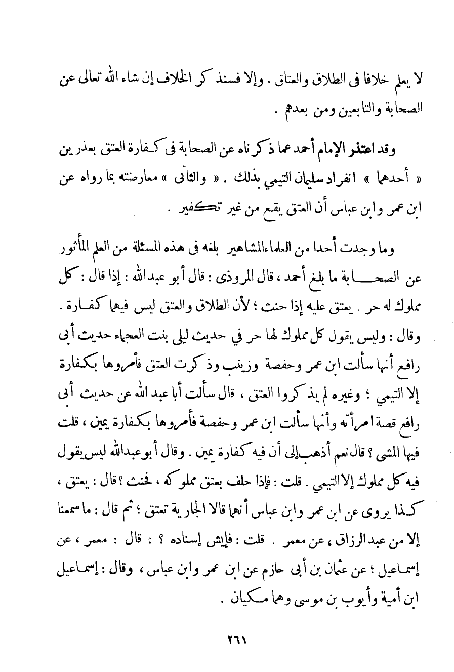 لَا يَعْلَمُ خِلَافًا فِي الطَّلَاقِ وَالْعِتَاقِ وَإِلَّا فَسَنَذْكُرُ الْخِلَافَ إنْ شَاءَ اللَّهُ تَعَالَى عَنْ الصَّحَابَةِ وَالتَّابِعِينَ وَمَنْ بَعْدَهُمْ. وَقَدْ اعْتَذَرَ الْإِمَامُ أَحْمَد عَمَّا ذَكَرْنَاهُ عَنْ الصَّحَابَةِ فِي كَفَّارَةِ الْعِتْقِ بِعُذْرَيْنِ " أَحَدُهُمَا " انْفِرَادُ سُلَيْمَانَ التيمي بِذَلِكَ. " وَالثَّانِي " مُعَارَضَتُهُ بِمَا رَوَاهُ عَنْ ابْنِ عُمَرَ وَابْنِ عَبَّاسٍ أَنَّ الْعِتْقَ يَقَعُ مِنْ غَيْرِ تَكْفِيرٍ. وَمَا وَجَدْت أَحَدًا مِنْ الْعُلَمَاءِ الْمَشَاهِيرِ بَلَغَهُ فِي هَذِهِ الْمَسْأَلَةِ مِنْ الْعِلْمِ الْمَأْثُورِ عَنْ الصَّحَابَةِ مَا بَلَغَ أَحْمَد قَالَ المروذي: قَالَ أَبُو عَبْدِ اللَّهِ: إذَا قَالَ: كُلُّ مَمْلُوكٍ لَهُ حُرٌّ. يَعْتِقُ عَلَيْهِ إذَا حَنِثَ؛ لِأَنَّ الطَّلَاقَ وَالْعِتْقَ لَيْسَ فِيهِمَا كَفَّارَةٌ وَقَالَ: وَلَيْسَ يَقُولُ كُلُّ مَمْلُوكٍ لَهَا حُرٌّ فِي حَدِيثِ لَيْلَى بِنْتِ الْعَجْمَاءِ حَدِيثِ أَبِي رَافِعٍ أَنَّهَا سَأَلَتْ ابْنَ عُمَرَ وَحَفْصَةَ وَزَيْنَبَ وَذَكَرَتْ الْعِتْقَ فَأَمَرُوهَا بِكَفَّارَةٍ إلَّا التيمي؛ وَغَيْرَهُ لَمْ يَذْكُرُوا الْعِتْقَ قَالَ سَأَلْت أَبَا عَبْدِ اللَّهِ عَنْ حَدِيثِ أَبِي رَافِعٍ قِصَّةِ امْرَأَتِهِ وَأَنَّهَا سَأَلَتْ ابْنَ عُمَرَ وَحَفْصَةَ فَأَمَرُوهَا بِكَفَّارَةِ يَمِينٍ قُلْت فِيهَا الْمَشْيُ؟ قَالَ نَعَمْ أَذْهَبُ إلَى أَنَّ فِيهِ كَفَّارَةَ يَمِينٍ. وَقَالَ أَبُو عَبْدِ اللَّهِ لَيْسَ يَقُولُ فِيهِ كُلُّ مَمْلُوكٍ إلَّا التيمي. قُلْت: فَإِذَا حَلَفَ بِعِتْقِ مَمْلُوكِهِ فَحَنِثَ؟ قَالَ: يَعْتِقُ كَذَا يُرْوَى عَنْ ابْنِ عُمَرَ وَابْنِ عَبَّاسٍ أَنَّهُمَا قَالَا الْجَارِيَةُ تَعْتِقُ؛ ثُمَّ قَالَ: مَا سَمِعْنَا إلَّا مِنْ عَبْدِ الرَّزَّاقِ عَنْ مَعْمَرٍ. قُلْت: فإيش إسْنَادُهُ؟ : قَالَ: مَعْمَرٌ عَنْ إسْمَاعِيلَ؛ عَنْ عُثْمَانَ بْنِ أَبِي حَازِمٍ عَنْ ابْنِ عُمَرَ وَابْنِ عَبَّاسٍ وَقَالَ: إسْمَاعِيلُ بْنُ أُمَيَّةَ وَأَيُّوبُ بْنُ مُوسَى وَهُمَا مَكِّيَّانِ.