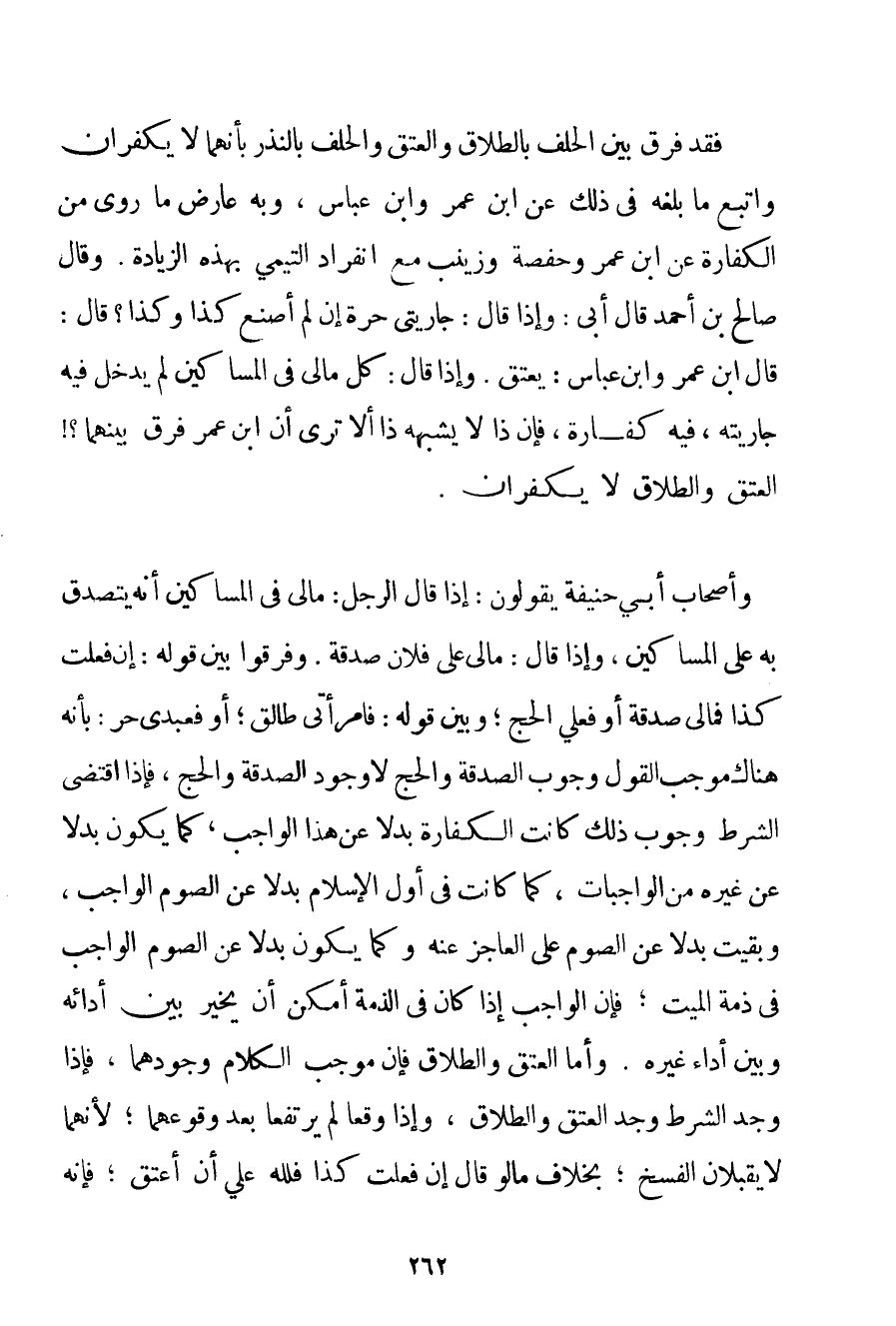فَقَدْ فَرَّقَ بَيْنَ الْحَلِفِ بِالطَّلَاقِ وَالْعِتْقِ وَالْحَلِفِ بِالنَّذْرِ بِأَنَّهُمَا لَا يُكَفِّرَانِ وَاتَّبَعَ مَا بَلَغَهُ فِي ذَلِكَ عَنْ ابْنِ عُمَرَ وَابْنِ عَبَّاسٍ وَبِهِ عَارَضَ مَا رُوِيَ مِنْ الْكُفَّارِ عَنْ ابْنِ عُمَرَ وَحَفْصَةَ وَزَيْنَبَ مَعَ انْفِرَادِ التيمي بِهَذِهِ الزِّيَادَةِ. وَقَالَ صَالِحُ بْنُ أَحْمَد قَالَ أَبِي: وَإِذَا قَالَ: جَارِيَتِي حُرَّةٌ إنْ لَمْ أَصْنَعْ كَذَا وَكَذَا؟ قَالَ: قَالَ ابْنُ عُمَرَ وَابْنُ عَبَّاسٍ: يَعْتِقُ. وَإِذَا قَالَ: كُلُّ مَالِي فِي الْمَسَاكِينِ لَمْ يُدْخِلْ فِيهِ جَارِيَتَهُ فِيهِ كَفَّارَةٌ فَإِنَّ ذَا لَا يُشْبِهُهُ ذَا أَلَا تَرَى أَنَّ ابْنَ عُمَرَ فَرَّقَ بَيْنَهُمَا الْعِتْقُ وَالطَّلَاقُ لَا يُكَفَّرَانِ. وَأَصْحَابُ أَبِي حَنِيفَةَ يَقُولُونَ: إذَا قَالَ الرَّجُلُ: مَالِي فِي الْمَسَاكِينِ أَنَّهُ يَتَصَدَّقُ بِهِ عَلَى الْمَسَاكِينِ وَإِذَا قَالَ: مَالِي عَلَى فُلَانٍ صَدَقَةٌ. وَفَرَّقُوا بَيْنَ قَوْلِهِ: إنْ فَعَلْت كَذَا فَمَالِي صَدَقَةٌ أَوْ فَعَلَيَّ الْحَجُّ؛ وَبَيْنَ قَوْلِهِ: فَامْرَأَتِي طَالِقٌ؛ أَوْ فَعَبْدِي حُرٌّ: بِأَنَّهُ هُنَاكَ مُوجَبُ الْقَوْلِ وُجُوبُ الصَّدَقَةِ وَالْحَجِّ لَا وُجُودُ الصَّدَقَةِ وَالْحَجِّ فَإِذَا اقْتَضَى الشَّرْطُ وُجُوبَ ذَلِكَ كَانَتْ الْكَفَّارَةُ بَدَلًا عَنْ هَذَا الْوَاجِبِ كَمَا يَكُونُ بَدَلًا عَنْ غَيْرِهِ مِنْ الْوَاجِبَاتِ كَمَا كَانَتْ فِي أَوَّلِ الْإِسْلَامِ بَدَلًا عَنْ الصَّوْمِ الْوَاجِبِ وَبَقِيَتْ بَدَلًا عَنْ الصَّوْمِ عَلَى الْعَاجِزِ عَنْهُ وَكَمَا يَكُونُ بَدَلًا عَنْ الصَّوْمِ الْوَاجِبِ فِي ذِمَّةِ الْمَيِّتِ؛ فَإِنَّ الْوَاجِبَ إذَا كَانَ فِي الذِّمَّةِ أَمْكَنَ أَنْ يُخَيَّرَ بَيْنَ أَدَائِهِ وَبَيْنَ أَدَاءِ غَيْرِهِ. وَأَمَّا الْعِتْقُ وَالطَّلَاقُ فَإِنَّ مُوجَبَ الْكَلَامِ وُجُودُهُمَا فَإِذَا وُجِدَ الشَّرْطُ وُجِدَ الْعِتْقُ وَالطَّلَاقُ وَإِذَا وَقَعَا لَمْ يَرْتَفِعَا بَعْدَ وُقُوعِهِمَا؛ لِأَنَّهُمَا لَا يَقْبَلَانِ الْفَسْخَ؛ بِخِلَافِ مَا لَوْ قَالَ إنْ فَعَلْت كَذَا فَلِلَّهِ عَلَيَّ أَنْ أُعْتِقَ؛ فَإِنَّهُ
