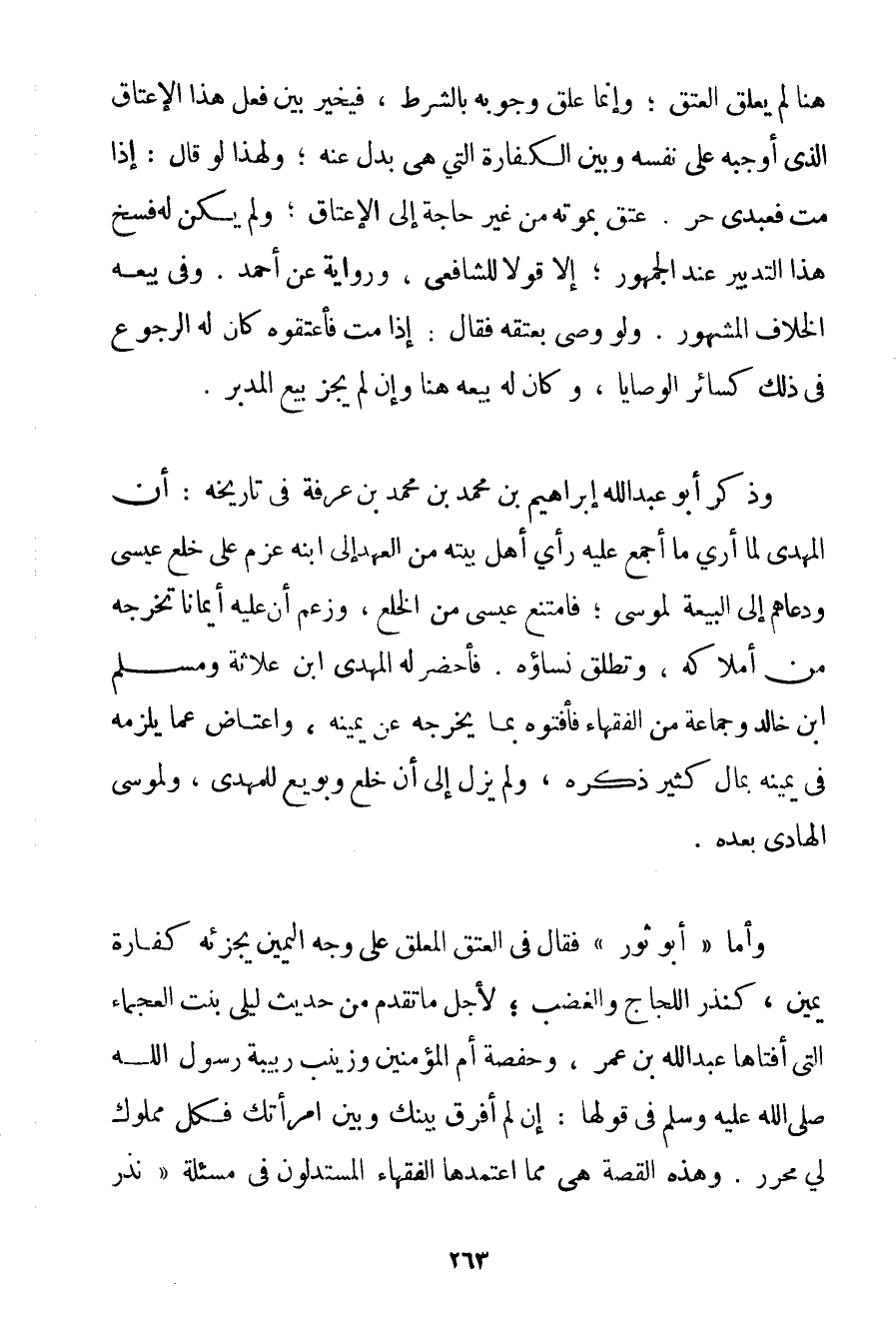 هُنَا لَمْ يُعَلِّقْ الْعِتْقَ؛ وَإِنَّمَا عَلَّقَ وُجُوبَهُ بِالشَّرْطِ فَيُخَيَّرُ بَيْنَ فِعْلِ هَذَا الْإِعْتَاقِ الَّذِي أَوْجَبَهُ عَلَى نَفْسِهِ وَبَيْنَ الْكَفَّارَةِ الَّتِي هِيَ بَدَلٌ عَنْهُ؛ وَلِهَذَا لَوْ قَالَ: إذَا مُتّ فَعَبْدِي حُرٌّ. عَتَقَ بِمَوْتِهِ مِنْ غَيْرِ حَاجَةٍ إلَى الْإِعْتَاقِ؛ وَلَمْ يَكُنْ لَهُ فَسْخُ هَذَا التَّدْبِيرِ عِنْدَ الْجُمْهُورِ؛ إلَّا قَوْلًا لِلشَّافِعِيِّ وَرِوَايَةً عَنْ أَحْمَد. وَفِي بَيْعِهِ الْخِلَافُ الْمَشْهُورُ. وَلَوْ وَصَّى بِعِتْقِهِ فَقَالَ: إذَا مُتّ فَاعْتِقُوهُ كَانَ لَهُ الرُّجُوعُ فِي ذَلِكَ كَسَائِرِ الْوَصَايَا وَكَانَ لَهُ بَيْعُهُ هُنَا وَإِنْ لَمْ يَجُزْ بَيْعُ الْمُدَبَّرِ. وَذَكَرَ أَبُو عَبْدِ اللَّهِ إبْرَاهِيمُ بْنُ مُحَمَّدِ بْنِ مُحَمَّدِ بْنِ عَرَفَةَ فِي تَارِيخِهِ: أَنْ الْمَهْدِيَّ لَمَّا رَأَى مَا أَجْمَعَ عَلَيْهِ رَأْيُ أَهْلِ بَيْتِهِ مِنْ الْعَهْدِ إلَى ابْنِهِ عَزَمَ عَلَى خَلْعِ عِيسَى وَدَعَاهُمْ إلَى الْبَيْعَةِ لِمُوسَى؛ فَامْتَنَعَ عِيسَى مِنْ الْخَلْعِ وَزَعَمَ أَنَّ عَلَيْهِ أَيْمَانًا تُخْرِجُهُ مِنْ أَمْلَاكِهِ وَتُطَلِّقُ نِسَاءَهُ. فَأَحْضَرَ لَهُ الْمَهْدِيُّ ابْنَ عُلَاثَةَ وَمُسْلِمَ بْنَ خَالِدٍ وَجَمَاعَةً مِنْ الْفُقَهَاءِ فَأَفْتَوْهُ بِمَا يُخْرِجُهُ عَنْ يَمِينِهِ وَاعْتَاضَ عَمَّا يَلْزَمُهُ فِي يَمِينِهِ بِمَالِ كَثِيرٍ ذَكَرَهُ وَلَمْ يَزَلْ إلَى أَنْ خُلِعَ وَبُويِعَ لِلْمَهْدِيِّ وَلِمُوسَى الْهَادِي بَعْدَهُ. وَأَمَّا " أَبُو ثَوْرٍ " فَقَالَ فِي الْعِتْقِ الْمُعَلَّقِ عَلَى وَجْهِ الْيَمِينِ يُجْزِئُهُ كَفَّارَةُ يَمِينٍ كَنَذْرِ اللَّجَاجِ وَالْغَضَبِ؛ لِأَجْلِ مَا تَقَدَّمَ مِنْ حَدِيثِ لَيْلَى بِنْتِ الْعَجْمَاءِ الَّتِي أَفْتَاهَا عَبْدُ اللَّهِ بْنُ عُمَرَ وَحَفْصَةُ أُمُّ الْمُؤْمِنِينَ وَزَيْنَبُ رَبِيبَةُ رَسُولِ اللَّهِ صَلَّى اللَّهُ عَلَيْهِ وَسَلَّمَ فِي قَوْلِهَا: إنْ لَمْ أُفَرِّقْ بَيْنَك وَبَيْنَ امْرَأَتِك فَكُلُّ مَمْلُوكٍ لِي مُحَرَّرٌ. وَهَذِهِ الْقِصَّةُ هِيَ مِمَّا اعْتَمَدَهَا الْفُقَهَاءُ الْمُسْتَدِلُّونَ فِي مَسْأَلَةِ " نَذْرِ