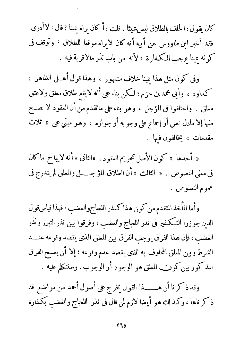 كَانَ يَقُولُ: الْحَلِفُ بِالطَّلَاقِ لَيْسَ شَيْئًا. قُلْت: أَكَانَ يَرَاهُ يَمِينًا؟ قَالَ: لَا أَدْرِي. فَقَدْ أَخْبَرَ ابْنُ طاوس عَنْ أَبِيهِ أَنَّهُ كَانَ لَا يَرَاهُ مُوقِعًا لِلطَّلَاقِ وَتَوَقَّفَ فِي كَوْنِهِ يَمِينًا يُوجِبُ الْكَفَّارَةَ؛ لِأَنَّهُ مِنْ بَابِ نَذْرِ مَا لَا قُرْبَةَ فِيهِ. وَفِي كَوْنِ مِثْلِ هَذَا يَمِينًا خِلَافٌ مَشْهُورٌ وَهَذَا قَوْلُ أَهْلِ الظَّاهِرِ: كدَاوُد وَأَبِي مُحَمَّدِ بْنِ حَزْمٍ؛ لَكِنْ بِنَاءً عَلَى أَنَّهُ لَا يَقَعُ طَلَاقٌ مُعَلَّقٌ وَلَا عِتْقٌ مُعَلَّقٌ. وَاخْتَلَفُوا فِي الْمُؤَجَّلِ وَهُوَ بِنَاءً عَلَى مَا تَقَدَّمَ مِنْ أَنَّ الْعُقُودَ لَا يَصِحُّ مِنْهَا إلَّا مَا دَلَّ نَصٌّ أَوْ إجْمَاعٌ عَلَى وُجُوبِهِ أَوْ جَوَازِهِ وَهُوَ مَبْنِيٌّ عَلَى " ثَلَاثِ مُقَدِّمَاتٍ " يُخَالِفُونَ فِيهَا. " أَحَدُهَا " كَوْنُ الْأَصْلِ تَحْرِيمَ الْعُقُودِ. " الثَّانِي " أَنَّهُ لَا يُبَاحُ مَا كَانَ فِي مَعْنَى النُّصُوصِ. " الثَّالِثُ " أَنَّ الطَّلَاقَ الْمُؤَجَّلَ وَالْمُعَلَّقَ لَمْ يَنْدَرِجْ فِي عُمُومِ النُّصُوصِ. وَأَمَّا الْمَأْخَذُ الْمُتَقَدِّمُ مِنْ كَوْنِ هَذَا كَنَذْرِ اللَّجَاجِ وَالْغَضَبِ فَهَذَا قِيَاسُ قَوْلِ الَّذِينَ جَوَّزُوا التَّكْفِيرَ فِي نَذْرِ اللَّجَاجِ وَالْغَضَبِ وَفَرَّقُوا بَيْنَ نَذْرِ التَّبَرُّرِ وَنَذْرِ الْغَضَبِ فَإِنَّ هَذَا الْفَرْقَ يُوجِبُ الْفَرْقَ بَيْنَ الْمُعَلَّقِ الَّذِي يُقْصَدُ وُقُوعُهُ عِنْدَ الشَّرْطِ وَبَيْنَ الْمُعَلَّقِ الْمَحْلُوفِ بِهِ الَّذِي يُقْصَدُ عَدَمُ وُقُوعِهِ؛ إلَّا أَنْ يَصِحَّ الْفَرْقُ الْمَذْكُورُ بَيْنَ كَوْنِ الْمُعَلَّقِ هُوَ الْوُجُودَ أَوْ الْوُجُوبَ. وَسَنَتَكَلَّمُ عَلَيْهِ. وَقَدْ ذَكَرْنَا أَنَّ هَذَا الْقَوْلَ يُخَرَّجُ عَلَى أُصُولِ أَحْمَد مِنْ مَوَاضِعَ قَدْ ذَكَرْنَاهَا وَكَذَلِكَ هُوَ أَيْضًا لَازِمٌ لِمَنْ قَالَ فِي نَذْرِ اللَّجَاجِ وَالْغَضَبِ بِكَفَّارَةِ