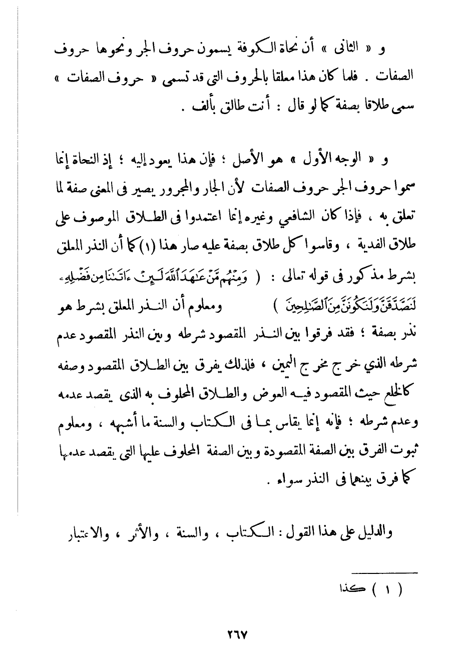 و " الثَّانِي " أَنَّ نُحَاةَ الْكُوفَةِ يُسَمُّونَ حُرُوفَ الْجَرِّ وَنَحْوَهَا حُرُوفَ الصِّفَاتِ. فَلَمَّا كَانَ هَذَا مُعَلَّقًا بِالْحُرُوفِ الَّتِي قَدْ تُسَمَّى " حُرُوفَ الصِّفَاتِ " سُمِّيَ طَلَاقًا بِصِفَةِ كَمَا لَوْ قَالَ: أَنْتِ طَالِقٌ بِأَلْفِ. و " الْوَجْهُ الْأَوَّلُ " هُوَ الْأَصْلُ؛ فَإِنَّ هَذَا يَعُودُ إلَيْهِ؛ إذْ النُّحَاةُ إنَّمَا سَمَّوْا حُرُوفَ الْجَرِّ حُرُوفَ الصِّفَاتِ لِأَنَّ الْجَارَّ وَالْمَجْرُورَ يَصِيرُ فِي الْمَعْنَى صِفَةً لِمَا تَعَلَّقَ بِهِ فَإِذَا كَانَ الشَّافِعِيُّ وَغَيْرُهُ إنَّمَا اعْتَمَدُوا فِي الطَّلَاقِ الْمَوْصُوفِ عَلَى طَلَاقِ الْفِدْيَةِ وَقَاسُوا كُلَّ طَلَاقٍ بِصِفَةِ عَلَيْهِ صَارَ هَذَا. . . (1)