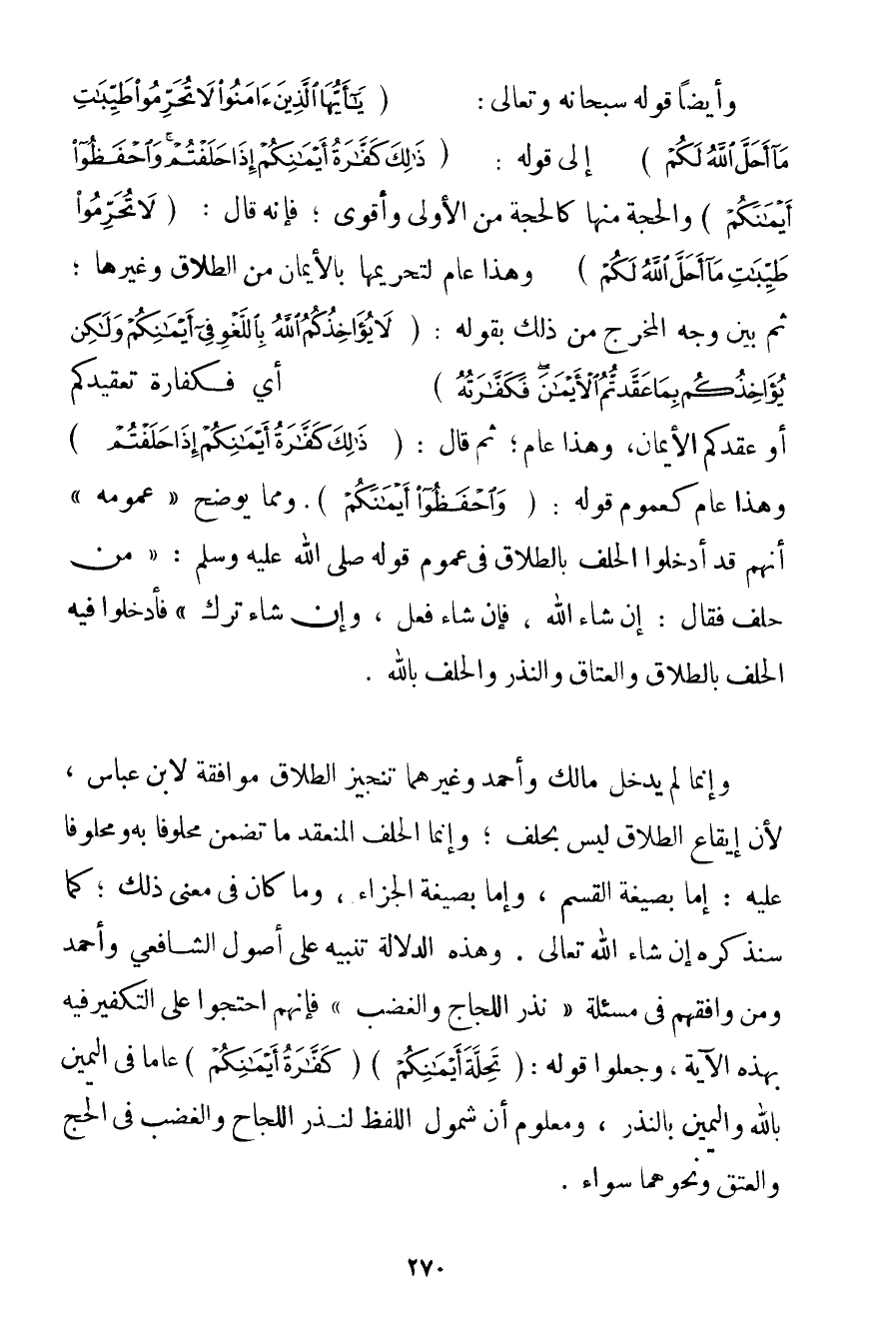 وَأَيْضًا قَوْلُهُ سُبْحَانَهُ وَتَعَالَى: {يَا أَيُّهَا الَّذِينَ آمَنُوا لَا تُحَرِّمُوا طَيِّبَاتِ مَا أَحَلَّ اللَّهُ لَكُمْ} إلَى قَوْلِهِ: {ذَلِكَ كَفَّارَةُ أَيْمَانِكُمْ إذَا حَلَفْتُمْ وَاحْفَظُوا أَيْمَانَكُمْ} وَالْحُجَّةُ مِنْهَا كَالْحُجَّةِ مِنْ الْأُولَى وَأَقْوَى؛ فَإِنَّهُ قَالَ: {لَا تُحَرِّمُوا طَيِّبَاتِ مَا أَحَلَّ اللَّهُ لَكُمْ} وَهَذَا عَامٌّ لِتَحْرِيمِهَا بِالْأَيْمَانِ مِنْ الطَّلَاقِ وَغَيْرِهَا؛ ثُمَّ بَيَّنَ وَجْهَ الْمَخْرَجِ مِنْ ذَلِكَ بِقَوْلِهِ: {لَا يُؤَاخِذُكُمُ اللَّهُ بِاللَّغْوِ فِي أَيْمَانِكُمْ وَلَكِنْ يُؤَاخِذُكُمْ بِمَا عَقَّدْتُمُ الْأَيْمَانَ فَكَفَّارَتُهُ} أَيْ فَكَفَّارَةُ تَعْقِيدِكُمْ أَوْ عَقْدِكُمْ الْأَيْمَانَ وَهَذَا عَامٌّ؛ ثُمَّ قَالَ: {ذَلِكَ كَفَّارَةُ أَيْمَانِكُمْ إذَا حَلَفْتُمْ} وَهَذَا عَامٌّ كَعُمُومِ قَوْلِهِ: {وَاحْفَظُوا أَيْمَانَكُمْ} . وَمِمَّا يُوضِحُ " عُمُومَهُ " أَنَّهُمْ قَدْ أَدْخَلُوا الْحَلِفَ بِالطَّلَاقِ فِي عُمُومِ قَوْلِهِ صَلَّى اللَّهُ عَلَيْهِ وَسَلَّمَ {مَنْ حَلَفَ فَقَالَ: إنْ شَاءَ اللَّهُ فَإِنْ شَاءَ فَعَلَ وَإِنْ شَاءَ تَرَكَ} فَأَدْخَلُوا فِيهِ الْحَلِفَ بِالطَّلَاقِ وَالْعِتَاقِ وَالنَّذْرِ وَالْحَلِفَ بِاَللَّهِ. وَإِنَّمَا لَمْ يُدْخِلْ مَالِكٌ وَأَحْمَد وَغَيْرُهُمَا تَنْجِيزَ الطَّلَاقِ مُوَافَقَةً لِابْنِ عَبَّاسٍ لِأَنَّ إيقَاعَ الطَّلَاقِ لَيْسَ بِحَلِفِ؛ وَإِنَّمَا الْحَلِفُ الْمُنْعَقِدُ مَا تَضَمَّنَ مَحْلُوفًا بِهِ وَمَحْلُوفًا عَلَيْهِ: إمَّا بِصِيغَةِ الْقَسَمِ وَإِمَّا بِصِيغَةِ الْجَزَاءِ وَمَا كَانَ فِي مَعْنَى ذَلِكَ؛ كَمَا سَنَذْكُرُهُ إنْ شَاءَ اللَّهُ تَعَالَى. وَهَذِهِ الدِّلَالَةُ تَنْبِيهٌ عَلَى أُصُولِ الشَّافِعِيِّ وَأَحْمَد وَمَنْ وَافَقَهُمْ فِي مَسْأَلَةِ " نَذْرِ اللَّجَاجِ وَالْغَضَبِ " فَإِنَّهُمْ احْتَجُّوا عَلَى التَّكْفِيرِ فِيهِ بِهَذِهِ الْآيَةِ وَجَعَلُوا قَوْلَهُ: {تَحِلَّةَ أَيْمَانِكُمْ} {كَفَّارَةُ أَيْمَانِكُمْ} عَامًّا فِي الْيَمِينِ بِاَللَّهِ وَالْيَمِينِ بِالنَّذْرِ وَمَعْلُومٌ أَنَّ شُمُولَ اللَّفْظِ لِنَذْرِ اللَّجَاجِ وَالْغَضَبِ فِي الْحَجِّ وَالْعِتْقِ وَنَحْوِهِمَا سَوَاءٌ.
