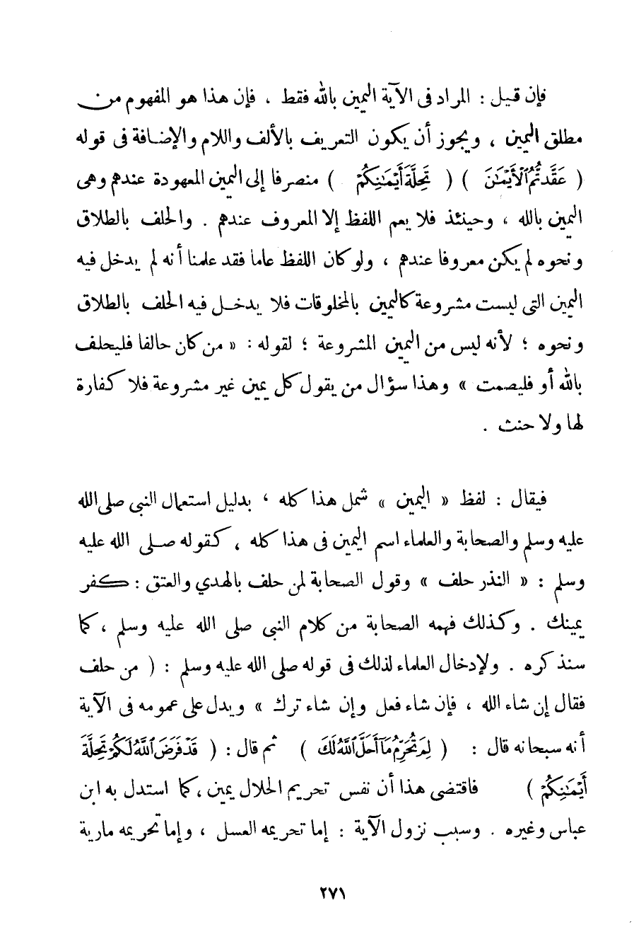 فَإِنْ قِيلَ: الْمُرَادُ فِي الْآيَةِ الْيَمِينُ بِاَللَّهِ فَقَطْ فَإِنَّ هَذَا هُوَ الْمَفْهُومُ مِنْ مُطْلَقِ الْيَمِينِ وَيَجُوزُ أَنْ يَكُونَ التَّعْرِيفُ بِالْأَلِفِ وَاللَّامِ وَالْإِضَافَةِ فِي قَوْلِهِ {عَقَّدْتُمُ الْأَيْمَانَ} {تَحِلَّةَ أَيْمَانِكُمْ} مُنْصَرِفًا إلَى الْيَمِينِ الْمَعْهُودَةِ عِنْدَهُمْ وَهِيَ الْيَمِينُ بِاَللَّهِ وَحِينَئِذٍ فَلَا يَعُمُّ اللَّفْظُ إلَّا الْمَعْرُوفَ عِنْدَهُمْ. وَالْحَلِفُ بِالطَّلَاقِ وَنَحْوِهِ لَمْ يَكُنْ مَعْرُوفًا عِنْدَهُمْ وَلَوْ كَانَ اللَّفْظُ عَامًّا فَقَدْ عَلَّمَنَا أَنَّهُ لَمْ يَدْخُلْ فِيهِ الْيَمِينُ الَّتِي لَيْسَتْ مَشْرُوعَةً كَالْيَمِينِ بِالْمَخْلُوقَاتِ فَلَا يَدْخُلُ فِيهِ الْحَلِفُ بِالطَّلَاقِ وَنَحْوِهِ؛ لِأَنَّهُ لَيْسَ مِنْ الْيَمِينِ الْمَشْرُوعَةِ؛ لِقَوْلِهِ: {مَنْ كَانَ حَالِفًا فَلْيَحْلِفْ بِاَللَّهِ أَوْ فَلْيَصْمُتْ} وَهَذَا سُؤَالُ مَنْ يَقُولُ كُلُّ يَمِينٍ غَيْرُ مَشْرُوعَةٍ فَلَا كَفَّارَةَ لَهَا وَلَا حِنْثَ. فَيُقَالُ: لَفْظُ " الْيَمِينِ " شَمِلَ هَذَا كُلَّهُ بِدَلِيلِ اسْتِعْمَالِ النَّبِيِّ صَلَّى اللَّهُ عَلَيْهِ وَسَلَّمَ وَالصَّحَابَةِ وَالْعُلَمَاءِ اسْمَ الْيَمِينِ فِي هَذَا كُلِّهِ كَقَوْلِهِ صَلَّى اللَّهُ عَلَيْهِ وَسَلَّمَ " النَّذْرُ حَلِفٌ " وَقَوْلِ الصَّحَابَةِ لِمَنْ حَلَفَ بِالْهَدْيِ وَالْعِتْقِ: كَفِّرْ يَمِينَك. وَكَذَلِكَ فَهِمَهُ الصَّحَابَةُ مِنْ كَلَامِ النَّبِيِّ صَلَّى اللَّهُ عَلَيْهِ وَسَلَّمَ كَمَا سَنَذْكُرُهُ. وَلِإِدْخَالِ الْعُلَمَاءِ لِذَلِكَ فِي قَوْلِهِ صَلَّى اللَّهُ عَلَيْهِ وَسَلَّمَ {مَنْ حَلَفَ فَقَالَ إنْ شَاءَ اللَّهُ فَإِنْ شَاءَ فَعَلَ وَإِنْ شَاءَ تَرَكَ} وَيَدُلُّ عَلَى عُمُومِهِ فِي الْآيَةِ أَنَّهُ سُبْحَانَهُ قَالَ: {لِمَ تُحَرِّمُ مَا أَحَلَّ اللَّهُ لَكَ} ثُمَّ قَالَ: {قَدْ فَرَضَ اللَّهُ لَكُمْ تَحِلَّةَ أَيْمَانِكُمْ} فَاقْتَضَى هَذَا أَنَّ نَفْسَ تَحْرِيمِ الْحَلَالِ يَمِينٌ كَمَا اسْتَدَلَّ بِهِ ابْنُ عَبَّاسٍ وَغَيْرُهُ. وَسَبَبُ نُزُولِ الْآيَةِ: إمَّا تَحْرِيمُهُ الْعَسَلَ وَإِمَّا تَحْرِيمُهُ مَارِيَةَ