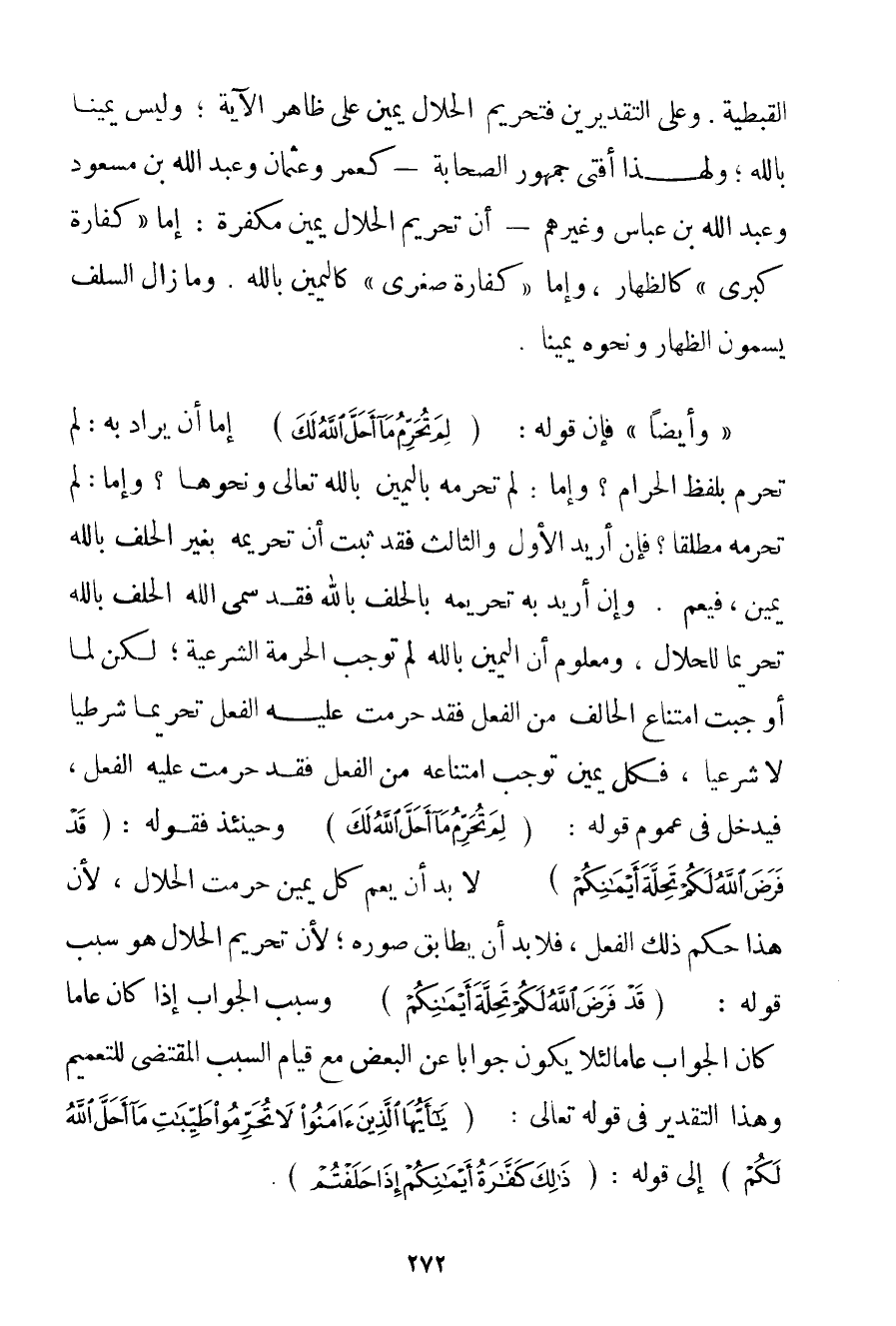 الْقِبْطِيَّةَ. وَعَلَى التَّقْدِيرَيْنِ فَتَحْرِيمُ الْحَلَالِ يَمِينٌ عَلَى ظَاهِرِ الْآيَةِ؛ وَلَيْسَ يَمِينًا بِاَللَّهِ؛ وَلِهَذَا أَفْتَى جُمْهُورُ الصَّحَابَةِ - كَعُمَرِ وَعُثْمَانَ وَعَبْدِ اللَّهِ بْنِ مَسْعُودٍ وَعَبْدِ اللَّهِ بْنِ عَبَّاسٍ وَغَيْرِهِمْ - أَنَّ تَحْرِيمَ الْحَلَالِ يَمِينٌ مُكَفَّرَةٌ: إمَّا " كَفَّارَةً كُبْرَى " كَالظِّهَارِ وَإِمَّا " كَفَّارَةً صُغْرَى " كَالْيَمِينِ بِاَللَّهِ. وَمَا زَالَ السَّلَفُ يُسَمُّونَ الظِّهَارَ وَنَحْوَهُ يَمِينًا. " وَأَيْضًا " فَإِنَّ قَوْلَهُ: {لِمَ تُحَرِّمُ مَا أَحَلَّ اللَّهُ لَكَ} إمَّا أَنْ يُرَادَ بِهِ: لِمَ تُحَرِّمُ بِلَفْظِ الْحَرَامِ؟ وَإِمَّا: لِمَ تُحَرِّمُهُ بِالْيَمِينِ بِاَللَّهِ تَعَالَى وَنَحْوِهَا؟ وَإِمَّا: لِمَ تُحَرِّمُهُ مُطْلَقًا؟ فَإِنْ أُرِيدَ الْأَوَّلُ وَالثَّالِثُ فَقَدْ ثَبَتَ أَنَّ تَحْرِيمَهُ بِغَيْرِ الْحَلِفِ بِاَللَّهِ يَمِينٌ فَيَعُمُّ. وَإِنْ أُرِيدَ بِهِ تَحْرِيمُهُ بِالْحَلِفِ بِاَللَّهِ فَقَدْ سَمَّى اللَّهُ الْحَلِفَ بِاَللَّهِ تَحْرِيمًا لِلْحَلَالِ وَمَعْلُومٌ أَنَّ الْيَمِينَ بِاَللَّهِ لَمْ تُوجِبْ الْحُرْمَةَ الشَّرْعِيَّةَ؛ لَكِنْ لَمَّا أَوْجَبَتْ امْتِنَاعَ الْحَالِفِ مِنْ الْفِعْلِ فَقَدْ حَرَّمَتْ عَلَيْهِ الْفِعْلَ تَحْرِيمًا شَرْطِيًّا لَا شَرْعِيًّا فَكُلُّ يَمِينٍ تُوجِبُ امْتِنَاعَهُ مِنْ الْفِعْلِ فَقَدْ حَرَّمَتْ عَلَيْهِ الْفِعْلَ فَيَدْخُلُ فِي عُمُومِ قَوْلِهِ: {لِمَ تُحَرِّمُ مَا أَحَلَّ اللَّهُ لَكَ} وَحِينَئِذٍ فَقَوْلُهُ: {قَدْ فَرَضَ اللَّهُ لَكُمْ تَحِلَّةَ أَيْمَانِكُمْ} لَا بُدَّ أَنْ يَعُمَّ كُلَّ يَمِينٍ حَرَّمَتْ الْحَلَالَ لِأَنَّ هَذَا حُكْمُ ذَلِكَ الْفِعْلِ فَلَا بُدَّ أَنْ يُطَابِقَ صُوَرَهُ؛ لِأَنَّ تَحْرِيمَ الْحَلَالِ هُوَ سَبَبُ قَوْلِهِ: {قَدْ فَرَضَ اللَّهُ لَكُمْ تَحِلَّةَ أَيْمَانِكُمْ} وَسَبَبُ الْجَوَابِ إذَا كَانَ عَامًّا كَانَ الْجَوَابُ عَامًّا لِئَلَّا يَكُونَ جَوَابًا عَنْ الْبَعْضِ مَعَ قِيَامِ السَّبَبِ الْمُقْتَضِي لِلتَّعْمِيمِ وَهَذَا التَّقْدِيرُ فِي قَوْلِهِ تَعَالَى: {يَا أَيُّهَا الَّذِينَ آمَنُوا لَا تُحَرِّمُوا طَيِّبَاتِ مَا أَحَلَّ اللَّهُ لَكُمْ} إلَى قَوْلِهِ: {ذَلِكَ كَفَّارَةُ أَيْمَانِكُمْ إذَا حَلَفْتُمْ} .
