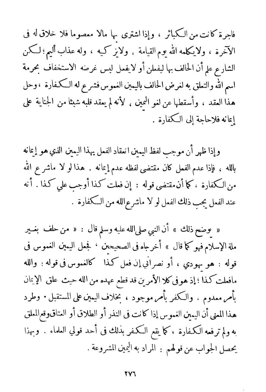 فَاجِرَةً كَانَتْ مِنْ الْكَبَائِرِ وَإِذَا اشْتَرَى بِهَا مَالًا مَعْصُومًا فَلَا خَلَاقَ لَهُ فِي الْآخِرَةِ وَلَا يُكَلِّمُهُ اللَّهُ يَوْمَ الْقِيَامَةِ وَلَا يُزَكِّيهِ وَلَهُ عَذَابٌ أَلِيمٌ؛ لَكِنَّ الشَّارِعَ عَلِمَ أَنَّ الْحَالِفَ بِهَا لَيَفْعَلَنَّ أَوْ لَا يَفْعَلُ لَيْسَ غَرَضُهُ الِاسْتِخْفَافَ بِحُرْمَةِ اسْمِ اللَّهِ وَالتَّعَلُّقَ بِهِ لِغَرَضِ الْحَالِفِ بِالْيَمِينِ الْغَمُوسِ فَشَرَعَ لَهُ الْكَفَّارَةَ وَحَلَّ هَذَا الْعَقْدَ وَأَسْقَطَهَا عَنْ لَغْوِ الْيَمِينِ لِأَنَّهُ لَمْ يَعْقِدْ قَلْبُهُ شَيْئًا مِنْ الْجِنَايَةِ عَلَى إيمَانِهِ فَلَا حَاجَةَ إلَى الْكَفَّارَةِ. وَإِذَا ظَهَرَ أَنَّ مُوجَبَ لَفْظِ الْيَمِينِ انْعِقَادُ الْفِعْلِ بِهَذَا الْيَمِينِ الَّذِي هُوَ إيمَانُهُ بِاَللَّهِ فَإِذَا عَدِمَ الْفِعْلَ كَانَ مُقْتَضَى لَفْظِهِ عَدَمُ إيمَانِهِ. هَذَا لَوْلَا مَا شَرَعَ اللَّهُ مِنْ الْكَفَّارَةِ كَمَا أَنَّ مُقْتَضَى قَوْلِهِ: إنْ فَعَلْت كَذَا أَوْجَبَ عَلَيَّ كَذَا. أَنَّهُ عِنْدَ الْفِعْلِ يَجِبُ ذَلِكَ الْفِعْلُ لَوْلَا مَا شَرَعَ اللَّهُ مِنْ الْكَفَّارَةِ. " يُوَضِّحُ ذَلِكَ " أَنَّ النَّبِيَّ صَلَّى اللَّهُ عَلَيْهِ وَسَلَّمَ قَالَ: {مَنْ حَلَفَ بِغَيْرِ مِلَّةِ الْإِسْلَامِ فَهُوَ كَمَا قَالَ} أَخْرَجَاهُ فِي الصَّحِيحَيْنِ فَجُعِلَ الْيَمِينُ الْغَمُوسُ فِي قَوْلِهِ: هُوَ يَهُودِيٌّ أَوْ نَصْرَانِيٌّ إنْ فَعَلَ كَذَا كَالْغَمُوسِ فِي قَوْلِهِ: وَاَللَّهِ مَا فَعَلْت كَذَا؛ إذْ هُوَ فِي كِلَا الْأَمْرَيْنِ قَدْ قَطَعَ عَهْدَهُ مِنْ اللَّهِ حَيْثُ عَلَّقَ الْإِيمَانَ بِأَمْرِ مَعْدُومٍ وَالْكُفْرَ بِأَمْرِ مَوْجُودٍ بِخِلَافِ الْيَمِينِ عَلَى الْمُسْتَقْبَلِ. وَطَرْدُ هَذَا الْمَعْنَى أَنَّ الْيَمِينَ الْغَمُوسَ إذَا كَانَتْ فِي النَّذْرِ أَوْ الطَّلَاقِ أَوْ الْعِتَاقِ وَقَعَ الْمُعَلَّقُ بِهِ وَلَمْ تَرْفَعْهُ الْكَفَّارَةُ كَمَا يَقَعُ الْكُفْرُ بِذَلِكَ فِي أَحَدِ قَوْلَيْ الْعُلَمَاءِ. وَبِهَذَا يَحْصُلُ الْجَوَابُ عَنْ قَوْلِهِمْ: الْمُرَادُ بِهِ الْيَمِينُ الْمَشْرُوعَةُ.