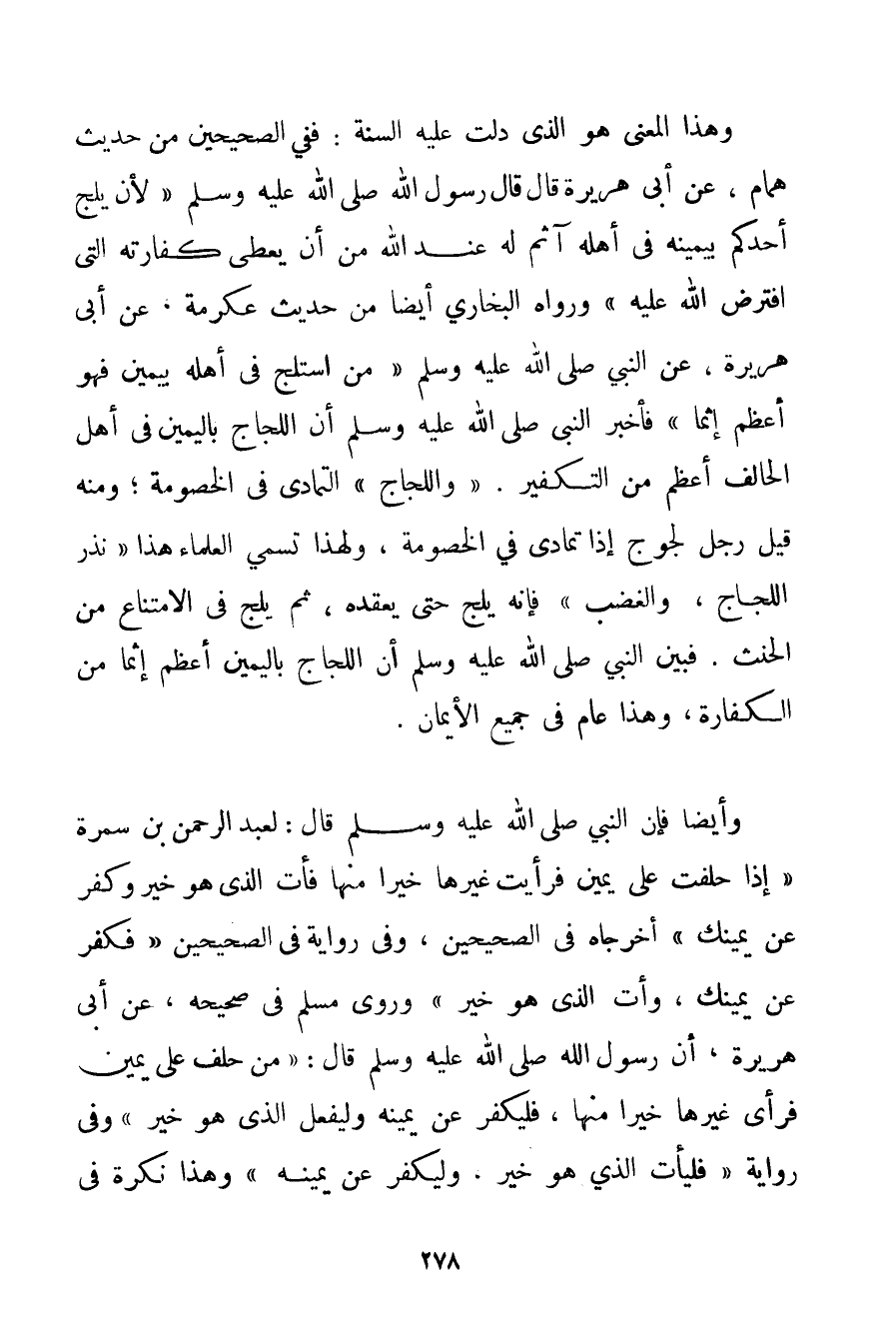 وَهَذَا الْمَعْنَى هُوَ الَّذِي دَلَّتْ عَلَيْهِ السُّنَّةُ: فَفِي الصَّحِيحَيْنِ مِنْ حَدِيث هَمَّامٍ عَنْ أَبِي هُرَيْرَةَ قَالَ رَسُولُ اللَّهِ صَلَّى اللَّهُ عَلَيْهِ وَسَلَّمَ {لَأَنْ يَلِجَ أَحَدُكُمْ بِيَمِينِهِ فِي أَهْلِهِ آثَمَ لَهُ عِنْدَ اللَّهِ مِنْ أَنْ يُعْطِيَ كَفَّارَتَهُ الَّتِي افْتَرَضَ اللَّهُ عَلَيْهِ} وَرَوَاهُ الْبُخَارِيُّ أَيْضًا مِنْ حَدِيثِ عِكْرِمَةَ عَنْ أَبِي هُرَيْرَةَ عَنْ النَّبِيِّ صَلَّى اللَّهُ عَلَيْهِ وَسَلَّمَ {مَنْ اسْتَلَجَ فِي أَهْلِهِ بِيَمِينِ فَهُوَ أَعْظَمُ إثْمًا} فَأَخْبَرَ النَّبِيُّ صَلَّى اللَّهُ عَلَيْهِ وَسَلَّمَ أَنَّ اللَّجَاجَ بِالْيَمِينِ فِي أَهْلِ الْحَالِفِ أَعْظَمُ مِنْ التَّكْفِيرِ. " وَاللَّجَاجُ " التَّمَادِي فِي الْخُصُومَةِ؛ وَمِنْهُ قِيلُ رَجُلٍ لَجُوجٍ إذَا تَمَادَى فِي الْخُصُومَةِ وَلِهَذَا تُسَمِّي الْعُلَمَاءُ هَذَا " نَذْرُ اللَّجَاجِ وَالْغَضَبِ " فَإِنَّهُ يَلِجُّ حَتَّى يَعْقِدَهُ ثُمَّ يَلِجُّ فِي الِامْتِنَاعِ مِنْ الْحِنْثِ. فَبَيَّنَ النَّبِيُّ صَلَّى اللَّهُ عَلَيْهِ وَسَلَّمَ أَنَّ اللَّجَاجَ بِالْيَمِينِ أَعْظَمُ إثْمًا مِنْ الْكَفَّارَةِ وَهَذَا عَامٌّ فِي جَمِيعِ الْأَيْمَانِ. وَأَيْضًا {فَإِنَّ النَّبِيَّ صَلَّى اللَّهُ عَلَيْهِ وَسَلَّمَ قَالَ لِعَبْدِ الرَّحْمَنِ بْنِ سَمُرَةَ: إذَا حَلَفْت عَلَى يَمِينٍ فَرَأَيْت غَيْرَهَا خَيْرًا مِنْهَا فَأْتِ الَّذِي هُوَ خَيْرٌ وَكَفِّرْ عَنْ يَمِينِك} أَخْرَجَاهُ فِي الصَّحِيحَيْنِ وَفِي رِوَايَةٍ فِي الصَّحِيحَيْنِ {فَكَفِّرْ عَنْ يَمِينِك وَأْتِ الَّذِي هُوَ خَيْرٌ} وَرَوَى مُسْلِمٌ فِي صَحِيحِهِ عَنْ أَبِي هُرَيْرَةَ " أَنَّ رَسُولَ اللَّهِ صَلَّى اللَّهُ عَلَيْهِ وَسَلَّمَ قَالَ: {مَنْ حَلَفَ عَلَى يَمِينٍ فَرَأَى غَيْرَهَا خَيْرًا مِنْهَا فَلْيُكَفِّرْ عَنْ يَمِينِهِ وَلْيَفْعَلْ الَّذِي هُوَ خَيْرٌ} وَفِي رِوَايَةٍ {فَلْيَأْتِ الَّذِي هُوَ خَيْرٌ. وَلْيُكَفِّرْ عَنْ يَمِينِهِ} وَهَذَا نَكِرَةٌ