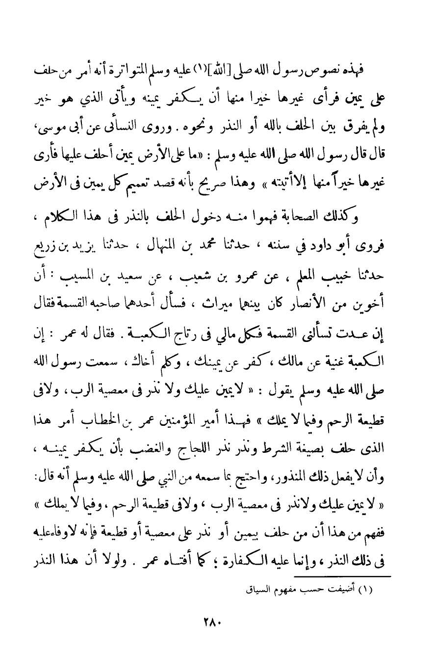 هَذِهِ الْوُجُوهِ مِنْ حَدِيثِ عَبْدِ اللَّهِ بْنِ عُمَرَ وَعَوْفِ بْنِ مَالِكٍ الجشمي. فَهَذِهِ نُصُوصُ رَسُولِ اللَّهِ صَلَّى اللَّهُ عَلَيْهِ وَسَلَّمَ الْمُتَوَاتِرَةُ أَنَّهُ أَمَرَ مَنْ حَلَفَ عَلَى يَمِينٍ فَرَأَى غَيْرَهَا خَيْرًا مِنْهَا أَنْ يُكَفِّرَ يَمِينَهُ وَيَأْتِيَ الَّذِي هُوَ خَيْرٌ وَلَمْ يُفَرِّقْ بَيْنَ الْحَلِفِ بِاَللَّهِ أَوْ النَّذْرِ وَنَحْوِهِ. وَرَوَى النَّسَائِي عَنْ أَبِي مُوسَى قَالَ قَالَ رَسُولُ اللَّهِ صَلَّى اللَّهُ عَلَيْهِ وَسَلَّمَ {مَا عَلَى الْأَرْضِ يَمِينٌ أَحْلِفُ عَلَيْهَا فَأَرَى غَيْرَهَا خَيْرًا مِنْهَا إلَّا أَتَيْته} وَهَذَا صَرِيحٌ بِأَنَّهُ قَصَدَ تَعْمِيمَ كُلِّ يَمِينٍ فِي الْأَرْضِ وَكَذَلِكَ الصَّحَابَةُ فَهِمُوا مِنْهُ دُخُولَ الْحَلِفِ بِالنَّذْرِ فِي هَذَا الْكَلَامِ فَرَوَى أَبُو دَاوُد فِي سُنَنِهِ حَدَّثَنَا مُحَمَّدُ بْنُ الْمِنْهَالِ حَدَّثَنَا يَزِيدُ بْنُ زريع حَدَّثَنَا خبيب الْمُعَلِّمُ عَنْ عَمْرِو بْنِ شُعَيْبٍ عَنْ سَعِيدِ بْنِ الْمُسَيِّبِ: أَنَّ أَخَوَيْنِ مِنْ الْأَنْصَارِ كَانَ بَيْنَهُمَا مِيرَاثٌ فَسَأَلَ أَحَدُهُمَا صَاحِبَهُ الْقِسْمَةَ فَقَالَ إنْ عُدْت تَسْأَلُنِي الْقِسْمَةَ فَكُلُّ مَالِي فِي رِتَاجِ الْكَعْبَةِ. فَقَالَ لَهُ عُمَرُ: إنَّ الْكَعْبَةَ غَنِيَّةٌ عَنْ مَالِك كَفِّرْ عَنْ يَمِينِك وَكَلِّمْ أَخَاك سَمِعْت رَسُولَ اللَّهِ صَلَّى اللَّهُ عَلَيْهِ وَسَلَّمَ يَقُولُ: {لَا يَمِينَ عَلَيْك وَلَا نَذْرَ فِي مَعْصِيَةِ الرَّبِّ وَلَا فِي قَطِيعَةِ الرَّحِمِ وَفِيمَا لَا يُمْلَكُ} فَهَذَا أَمِيرُ الْمُؤْمِنِينَ عُمَرُ بْنُ الْخَطَّابِ أَمَرَ هَذَا الَّذِي حَلَفَ بِصِيغَةِ الشَّرْطِ وَنَذَرَ نَذْرَ اللَّجَاجِ وَالْغَضَبِ بِأَنْ يُكَفِّرَ يَمِينَهُ وَأَنْ لَا يَفْعَلَ ذَلِكَ الْمَنْذُورَ وَاحْتَجَّ بِمَا سَمِعَهُ مِنْ النَّبِيِّ صَلَّى اللَّهُ عَلَيْهِ وَسَلَّمَ أَنَّهُ قَالَ: {لَا يَمِينَ عَلَيْك وَلَا نَذْرَ فِي مَعْصِيَةِ الرَّبِّ وَلَا فِي قَطِيعَةِ الرَّحِمِ وَفِيمَا لَا يُمْلَكُ} فَفُهِمَ مِنْ هَذَا أَنَّ مَنْ حَلَفَ بِيَمِينِ أَوْ نَذْرٍ عَلَى مَعْصِيَةٍ أَوْ قَطِيعَةٍ فَإِنَّهُ لَا وَفَاءَ عَلَيْهِ فِي ذَلِكَ النَّذْرِ وَإِنَّمَا عَلَيْهِ الْكَفَّارَةُ؛ كَمَا أَفْتَاهُ عُمَرُ. وَلَوْلَا أَنَّ هَذَا النَّذْرَ