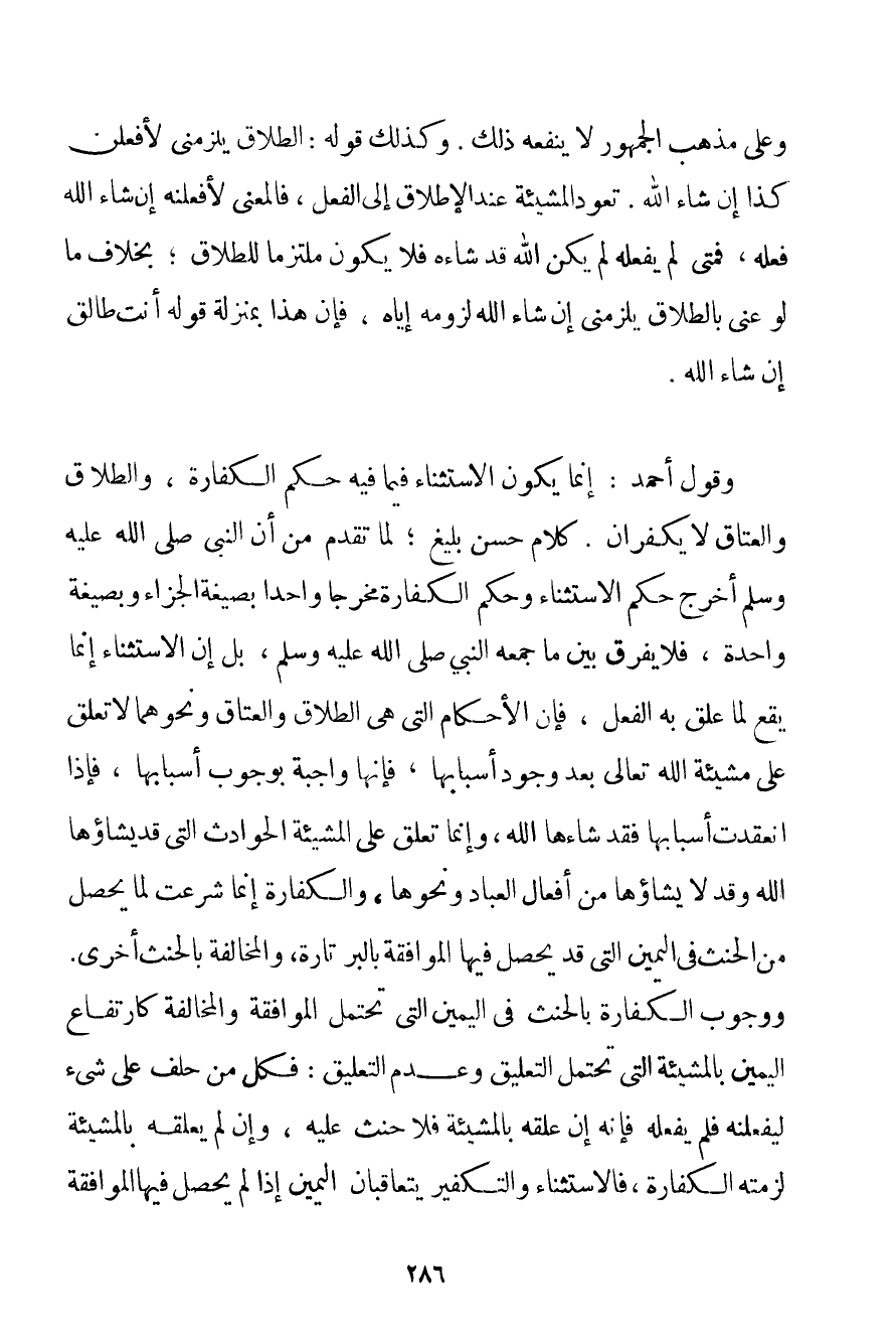 وَعَلَى مَذْهَبِ الْجُمْهُورِ لَا يَنْفَعُهُ ذَلِكَ. وَكَذَلِكَ قَوْلُهُ: الطَّلَاقُ يَلْزَمُنِي لَأَفْعَلَنَّ كَذَا إنْ شَاءَ اللَّهُ. تَعُودُ الْمَشِيئَةُ عِنْدَ الْإِطْلَاقِ إلَى الْفِعْلِ فَالْمَعْنَى لَأَفْعَلَنَّهُ إنْ شَاءَ اللَّهُ فَعَلَهُ فَمَتَى لَمْ يَفْعَلْهُ لَمْ يَكُنْ اللَّهُ قَدْ شَاءَهُ فَلَا يَكُونُ مُلْتَزِمًا لِلطَّلَاقِ؛ بِخِلَافِ مَا لَوْ عَنَى بِالطَّلَاقِ يَلْزَمُنِي إنْ شَاءَ اللَّهُ لُزُومَهُ إيَّاهُ فَإِنَّ هَذَا بِمَنْزِلَةِ قَوْلِهِ أَنْت طَالِقٌ إنْ شَاءَ اللَّهُ. وَقَوْلِ أَحْمَد: إنَّمَا يَكُونُ الِاسْتِثْنَاءُ فِيمَا فِيهِ حُكْمُ الْكَفَّارَةِ وَالطَّلَاقِ وَالْعِتَاقِ لَا يُكَفَّرَانِ. كَلَامٌ حَسَنٌ بَلِيغٌ؛ لِمَا تَقَدَّمَ مِنْ أَنَّ النَّبِيَّ صَلَّى اللَّهُ عَلَيْهِ وَسَلَّمَ خَرَّجَ حُكْمَ الِاسْتِثْنَاءِ وَحُكْمَ الْكَفَّارَةِ مَخْرَجًا وَاحِدًا بِصِيغَةِ الْجَزَاءِ وَبِصِيغَةِ وَاحِدَةٍ فَلَا يُفَرَّقُ بَيْنَ مَا جَمَعَهُ النَّبِيُّ صَلَّى اللَّهُ عَلَيْهِ وَسَلَّمَ بَلْ إنَّ الِاسْتِثْنَاءَ إنَّمَا يَقَعُ لِمَا عُلِّقَ بِهِ الْفِعْلُ فَإِنَّ الْأَحْكَامَ الَّتِي هِيَ الطَّلَاقُ وَالْعِتَاقُ وَنَحْوُهُمَا لَا تُعَلَّقُ عَلَى مَشِيئَةِ اللَّهِ تَعَالَى بَعْدَ وُجُودِ أَسْبَابِهَا فَإِنَّهَا وَاجِبَةٌ بِوُجُوبِ أَسْبَابِهَا فَإِذَا انْعَقَدَتْ أَسْبَابُهَا فَقَدْ شَاءَهَا اللَّهُ وَإِنَّمَا تُعَلَّقُ عَلَى الْمَشِيئَةِ الْحَوَادِثُ الَّتِي قَدْ يَشَاؤُهَا اللَّهُ وَقَدْ لَا يَشَاؤُهَا مِنْ أَفْعَالِ الْعِبَادِ وَنَحْوِهَا وَالْكَفَّارَةُ إنَّمَا شُرِعَتْ لِمَا يَحْصُلُ مِنْ الْحِنْثِ فِي الْيَمِينِ الَّتِي قَدْ يَحْصُلُ فِيهَا الْمُوَافَقَةُ بِالْبِرِّ تَارَةً وَالْمُخَالَفَةِ بِالْحِنْثِ أُخْرَى. وَوُجُوبُ الْكَفَّارَةِ بِالْحِنْثِ فِي الْيَمِينِ الَّتِي تَحْتَمِلُ الْمُوَافَقَةَ وَالْمُخَالَفَةَ كَارْتِفَاعِ الْيَمِينِ بِالْمَشِيئَةِ الَّتِي تَحْتَمِلُ التَّعْلِيقَ وَعَدَمَ التَّعْلِيقِ: فَكُلُّ مَنْ حَلَفَ عَلَى شَيْءٍ لَيَفْعَلَنَّهُ فَلَمْ يَفْعَلْهُ فَإِنَّهُ إنْ عَلَّقَهُ بِالْمَشِيئَةِ فَلَا حِنْثَ عَلَيْهِ وَإِنْ لَمْ يُعَلِّقْهُ بِالْمَشِيئَةِ لَزِمَتْهُ الْكَفَّارَةُ فَالِاسْتِثْنَاءُ وَالتَّكْفِيرُ يَتَعَاقَبَانِ الْيَمِينَ إذَا لَمْ يَحْصُلُ فِيهَا الْمُوَافَقَةُ