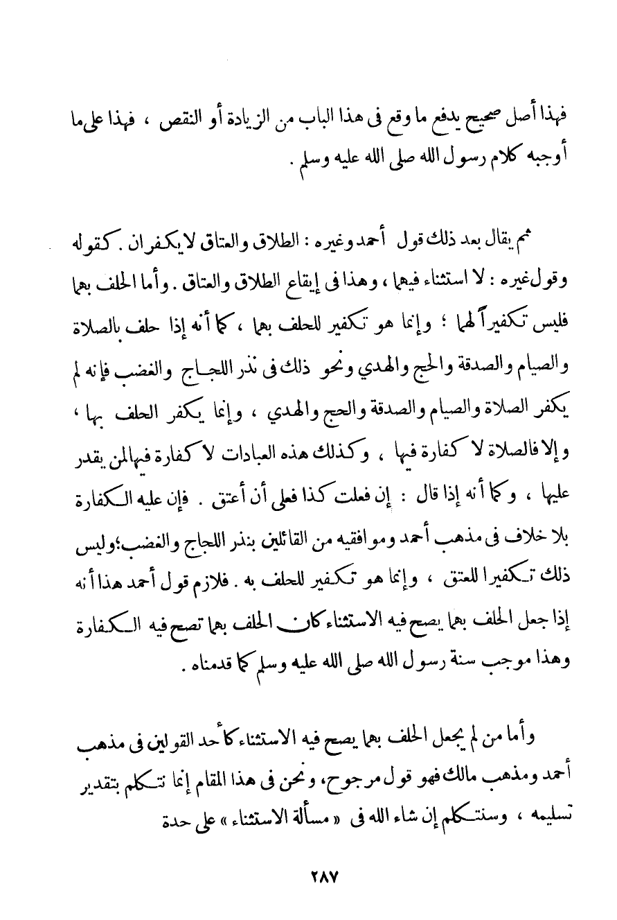 فَهَذَا أَصْلٌ صَحِيحٌ يَدْفَعُ مَا وَقَعَ فِي هَذَا الْبَابِ مِنْ الزِّيَادَةِ أَوْ النَّقْصِ فَهَذَا عَلَى مَا أَوْجَبَهُ كَلَامُ رَسُولِ اللَّهِ صَلَّى اللَّهُ عَلَيْهِ وَسَلَّمَ. ثُمَّ يُقَالُ بَعْدَ ذَلِكَ قَوْلُ أَحْمَد وَغَيْرِهِ: الطَّلَاقُ وَالْعِتَاقُ لَا يُكَفَّرَانِ. كَقَوْلِهِ وَقَوْلِ غَيْرِهِ: لَا اسْتِثْنَاءَ فِيهِمَا وَهَذَا فِي إيقَاعِ الطَّلَاقِ وَالْعِتَاقِ. وَأَمَّا الْحَلِفُ بِهِمَا فَلَيْسَ تَكْفِيرًا لَهُمَا؛ وَإِنَّمَا هُوَ تَكْفِيرٌ لِلْحَلِفِ بِهِمَا كَمَا أَنَّهُ إذَا حَلَفَ بِالصَّلَاةِ وَالصِّيَامِ وَالصَّدَقَةِ وَالْحَجِّ وَالْهَدْيِ وَنَحْوِ ذَلِكَ فِي نَذْرِ اللَّجَاجِ وَالْغَضَبِ فَإِنَّهُ لَمْ يُكَفِّرْ الصَّلَاةَ وَالصِّيَامَ وَالصَّدَقَةَ وَالْحَجَّ وَالْهَدْيَ وَإِنَّمَا يُكَفِّرُ الْحَلِفَ بِهِمْ وَإِلَّا فَالصَّلَاةُ لَا كَفَّارَةَ فِيهَا وَكَذَلِكَ هَذِهِ الْعِبَادَاتُ لَا كَفَّارَةَ فِيهَا لِمَنْ يَقْدِرُ عَلَيْهَا وَكَمَا أَنَّهُ إذَا قَالَ: إنْ فَعَلْت كَذَا فَعَلَيَّ أَنْ أُعْتِقَ. فَإِنَّ عَلَيْهِ الْكَفَّارَةَ بِلَا خِلَافٍ فِي مَذْهَبِ أَحْمَد وَمُوَافِقِيهِ مِنْ الْقَائِلِينَ بِنَذْرِ اللَّجَاجِ وَالْغَضَبِ؛ وَلَيْسَ ذَلِكَ تَكْفِيرًا لِلْعِتْقِ وَإِنَّمَا هُوَ تَكْفِيرٌ لِلْحَلِفِ بِهِ. فَلَازَمَ قَوْلَ أَحْمَد هَذَا أَنَّهُ إذَا جَعَلَ الْحَلِفَ بِهِمَا يَصِحُّ فِيهِ الِاسْتِثْنَاءُ كَانَ الْحَلِفُ بِهِمَا تَصِحُّ فِيهِ الْكَفَّارَةُ وَهَذَا مُوجَبُ سُنَّةِ رَسُولِ اللَّهِ صَلَّى اللَّهُ عَلَيْهِ وَسَلَّمَ كَمَا قَدَّمْنَاهُ. وَأَمَّا مَنْ لَمْ يَجْعَلْ الْحَلِفَ بِهِمَا يَصِحُّ فِيهِ الِاسْتِثْنَاءُ كَأَحَدِ الْقَوْلَيْنِ فِي مَذْهَبِ أَحْمَد وَمَذْهَبِ مَالِكٍ فَهُوَ قَوْلٌ مَرْجُوحٌ وَنَحْنُ فِي هَذَا الْمَقَامِ إنَّمَا نَتَكَلَّمُ بِتَقْدِيرِ تَسْلِيمِهِ وَسَنَتَكَلَّمُ إنْ شَاءَ اللَّهُ فِي " مَسْأَلَةِ الِاسْتِثْنَاءِ " عَلَى حِدَةٍ.