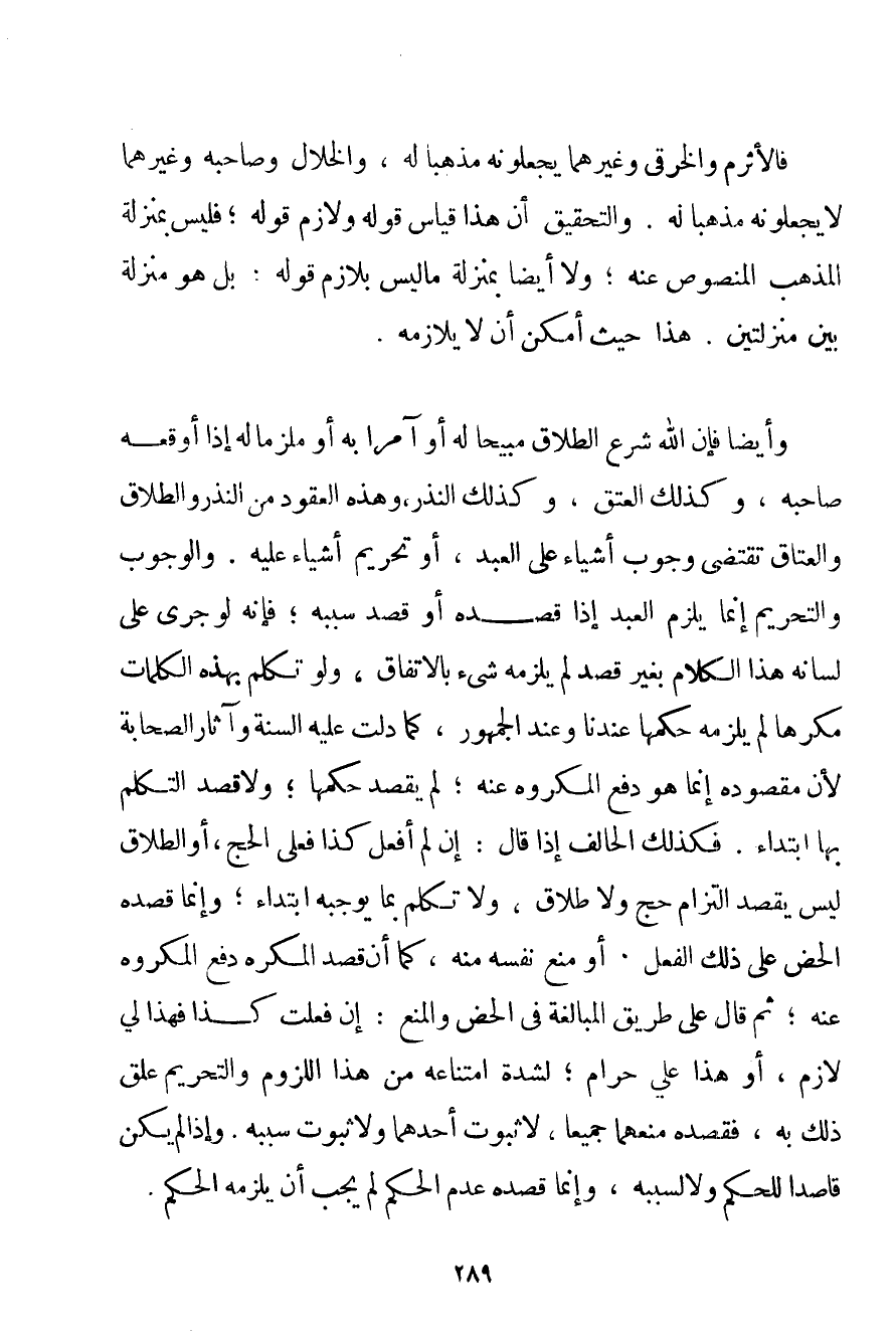 فَالْأَثْرَمُ والخرقي وَغَيْرُهُمَا يَجْعَلُونَهُ مَذْهَبًا لَهُ وَالْخَلَّالُ وَصَاحِبُهُ وَغَيْرُهُمَا لَا يَجْعَلُونَهُ مَذْهَبًا لَهُ. وَالتَّحْقِيقُ أَنَّ هَذَا قِيَاسُ قَوْلِهِ وَلَازِمُ قَوْلِهِ؛ فَلَيْسَ بِمَنْزِلَةِ الْمَذْهَبِ الْمَنْصُوصِ عَنْهُ؛ وَلَا أَيْضًا بِمَنْزِلَةِ مَا لَيْسَ بِلَازِمِ قَوْلُهُ؛ بَلْ هُوَ مَنْزِلَةٌ بَيْنَ مَنْزِلَتَيْنِ. هَذَا حَيْثُ أَمْكَنَ أَنْ لَا يُلَازِمَهُ. وَأَيْضًا فَإِنَّ اللَّهَ شَرَعَ الطَّلَاقَ مُبِيحًا لَهُ أَوْ آمِرًا بِهِ أَوْ مُلْزِمًا لَهُ إذَا أَوْقَعَهُ صَاحِبُهُ وَكَذَلِكَ الْعِتْقُ وَكَذَلِكَ النَّذْرُ. وَهَذِهِ الْعُقُودُ مِنْ النُّذُورِ وَالطَّلَاقِ وَالْعِتَاقِ تَقْتَضِي وُجُوبَ أَشْيَاءَ عَلَى الْعَبْدِ أَوْ تَحْرِيمَ أَشْيَاءَ عَلَيْهِ. وَالْوُجُوبُ وَالتَّحْرِيمُ إنَّمَا يَلْزَمُ الْعَبْدَ إذَا قَصَدَهُ أَوْ قَصَدَ سَبَبَهُ؛ فَإِنَّهُ لَوْ جَرَى عَلَى لِسَانِهِ هَذَا الْكَلَامُ بِغَيْرِ قَصْدٍ لَمْ يَلْزَمْهُ شَيْءٌ بِالِاتِّفَاقِ وَلَوْ تَكَلَّمَ بِهَذِهِ الْكَلِمَاتِ مُكْرَهًا لَمْ يَلْزَمْهُ حُكْمُهَا عِنْدَنَا وَعِنْدَ الْجُمْهُورِ كَمَا دَلَّتْ عَلَيْهِ السُّنَّةُ وَآثَارُ الصَّحَابَةِ لِأَنَّ مَقْصُودَهُ إنَّمَا هُوَ دَفْعُ الْمَكْرُوهِ عَنْهُ؛ لَمْ يَقْصِدْ حُكْمَهَا؛ وَلَا قَصَدَ التَّكَلُّمَ بِهَا ابْتِدَاءً. فَكَذَلِكَ الْحَالِفُ إذَا قَالَ: إنْ لَمْ أَفْعَلْ كَذَا فَعَلَيَّ الْحَجُّ أَوْ الطَّلَاقُ لَيْسَ يَقْصِدُ الْتِزَامَ حَجٍّ وَلَا طَلَاقٍ وَلَا تَكَلَّمَ بِمَا يُوجِبُهُ ابْتِدَاءً؛ وَإِنَّمَا قَصْدُهُ الْحَضُّ عَلَى ذَلِكَ الْفِعْلِ. أَوْ مَنْعُ نَفْسِهِ مِنْهُ كَمَا أَنَّ قَصْدَ الْمُكْرَهِ دَفْعُ الْمَكْرُوهِ عَنْهُ؛ ثُمَّ قَالَ عَلَى طَرِيقِ الْمُبَالَغَةِ فِي الْحَضِّ وَالْمَنْعِ: إنْ فَعَلْت كَذَا فَهَذَا لِي لَازِمٌ أَوْ هَذَا عَلَيَّ حَرَامٌ؛ لِشِدَّةِ امْتِنَاعِهِ مِنْ هَذَا اللُّزُومِ وَالتَّحْرِيمِ عُلِّقَ ذَلِكَ بِهِ فَقَصْدُهُ مَنْعُهُمَا جَمِيعًا لَا ثُبُوتُ أَحَدِهِمَا وَلَا ثُبُوتُ سَبَبِهِ. وَإِذَا لَمْ يَكُنْ قَاصِدًا لِلْحُكْمِ وَلَا لِسَبَبِهِ وَإِنَّمَا قَصْدُهُ عَدَمُ الْحُكْمِ لَمْ يَجِبْ أَنْ يَلْزَمَهُ الْحُكْمُ.