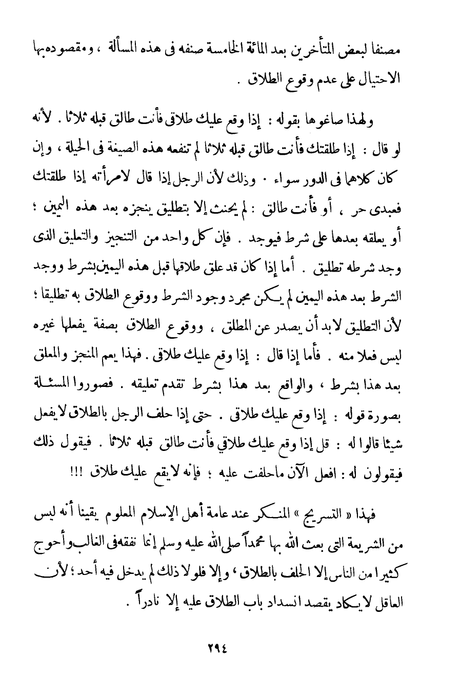 مُصَنَّفًا لِبَعْضِ الْمُتَأَخِّرِينَ بَعْدَ الْمِائَةِ الْخَامِسَةِ صَنَّفَهُ فِي هَذِهِ الْمَسْأَلَةِ وَمَقْصُودُهُ بِهَا الِاحْتِيَالُ عَلَى عَدَمِ وُقُوعِ الطَّلَاقِ. وَلِهَذَا صَاغُوهَا بِقَوْلِهِ: إذَا وَقَعَ عَلَيْك طَلَاقِي فَأَنْت طَالِقٌ قَبْلَهُ ثَلَاثًا. لِأَنَّهُ لَوْ قَالَ: إذَا طَلَّقْتُك فَأَنْت طَالِقٌ قَبْلَهُ ثَلَاثًا لَمْ تَنْفَعْهُ هَذِهِ الصِّيغَةُ فِي الْحِيلَةِ وَإِنْ كَانَ كِلَاهُمَا فِي الدَّوْرِ سَوَاءٌ. وَذَلِكَ لِأَنَّ الرَّجُلَ إذَا قَالَ لِامْرَأَتِهِ إذَا طَلَّقْتُك فَعَبْدِي حُرٌّ أَوْ فَأَنْت طَالِقٌ: لَمْ يَحْنَثْ إلَّا بِتَطْلِيقِ يُنَجِّزُهُ بَعْدَ هَذِهِ الْيَمِينُ؛ أَوْ يُعَلِّقُهُ بَعْدَهَا عَلَى شَرْطٍ فَيُوجَدُ. فَإِنَّ كُلَّ وَاحِدٍ مِنْ التَّنْجِيزِ وَالتَّعْلِيقِ الَّذِي وُجِدَ شَرْطُهُ تَطْلِيقٌ. أَمَّا إذَا كَانَ قَدْ عَلَّقَ طَلَاقَهَا قَبْلَ هَذِهِ الْيَمِينِ بِشَرْطِ وَوُجِدَ الشَّرْطُ بَعْدَ هَذِهِ الْيَمِينَ لَمْ يَكُنْ مُجَرَّدُ وُجُودِ الشَّرْطِ وَوُقُوعِ الطَّلَاقِ بِهِ تَطْلِيقًا؛ لِأَنَّ التَّطْلِيقَ لَا بُدَّ أَنْ يَصْدُرَ عَنْ الْمُطَلِّقِ وَوُقُوعَ الطَّلَاقِ بِصِفَةِ يَفْعَلُهَا غَيْرُهُ لَيْسَ فِعْلًا مِنْهُ. فَأَمَّا إذَا قَالَ: إذَا وَقَعَ عَلَيْك طَلَاقِي. فَهَذَا يَعُمُّ الْمُنَجَّزَ وَالْمُعَلَّقَ بَعْدَ هَذَا بِشَرْطِ وَالْوَاقِعُ بَعْدَ هَذَا بِشَرْطِ تَقَدَّمَ تَعْلِيقُهُ. فَصَوَّرُوا الْمَسْأَلَةَ بِصُورَةِ قَوْلِهِ: إذَا وَقَعَ عَلَيْك طَلَاقِي. حَتَّى إذَا حَلَفَ الرَّجُلُ بِالطَّلَاقِ لَا يَفْعَلُ شَيْئًا قَالُوا لَهُ: قُلْ إذَا وَقَعَ عَلَيْك طَلَاقِي فَأَنْت طَالِقٌ قَبْلَهُ ثَلَاثًا. فَيَقُولُ ذَلِكَ فَيَقُولُونَ لَهُ: افْعَلْ الْآنَ مَا حَلَفْت عَلَيْهِ؛ فَإِنَّهُ لَا يَقَعُ عَلَيْك طَلَاقٌ فَهَذَا " التَّسْرِيجُ " الْمُنْكَرُ عِنْدَ عَامَّةِ أَهْلِ الْإِسْلَامِ الْمَعْلُومُ يَقِينًا أَنَّهُ لَيْسَ مِنْ الشَّرِيعَةِ الَّتِي بَعَثَ اللَّهُ بِهَا مُحَمَّدًا صَلَّى اللَّهُ عَلَيْهِ وَسَلَّمَ إنَّمَا نَفْقُه فِي الْغَالِبِ وَأَحْوَجُ كَثِيرًا مِنْ النَّاسِ إلَّا الْحَلِف بِالطَّلَاقِ وَإِلَّا فَلَوْلَا ذَلِكَ لَمْ يَدْخُلْ فِيهِ أَحَدٌ؛ لِأَنَّ الْعَاقِلَ لَا يَكَادُ يَقْصِدُ انْسِدَادَ بَابِ الطَّلَاقِ عَلَيْهِ إلَّا نَادِرًا.