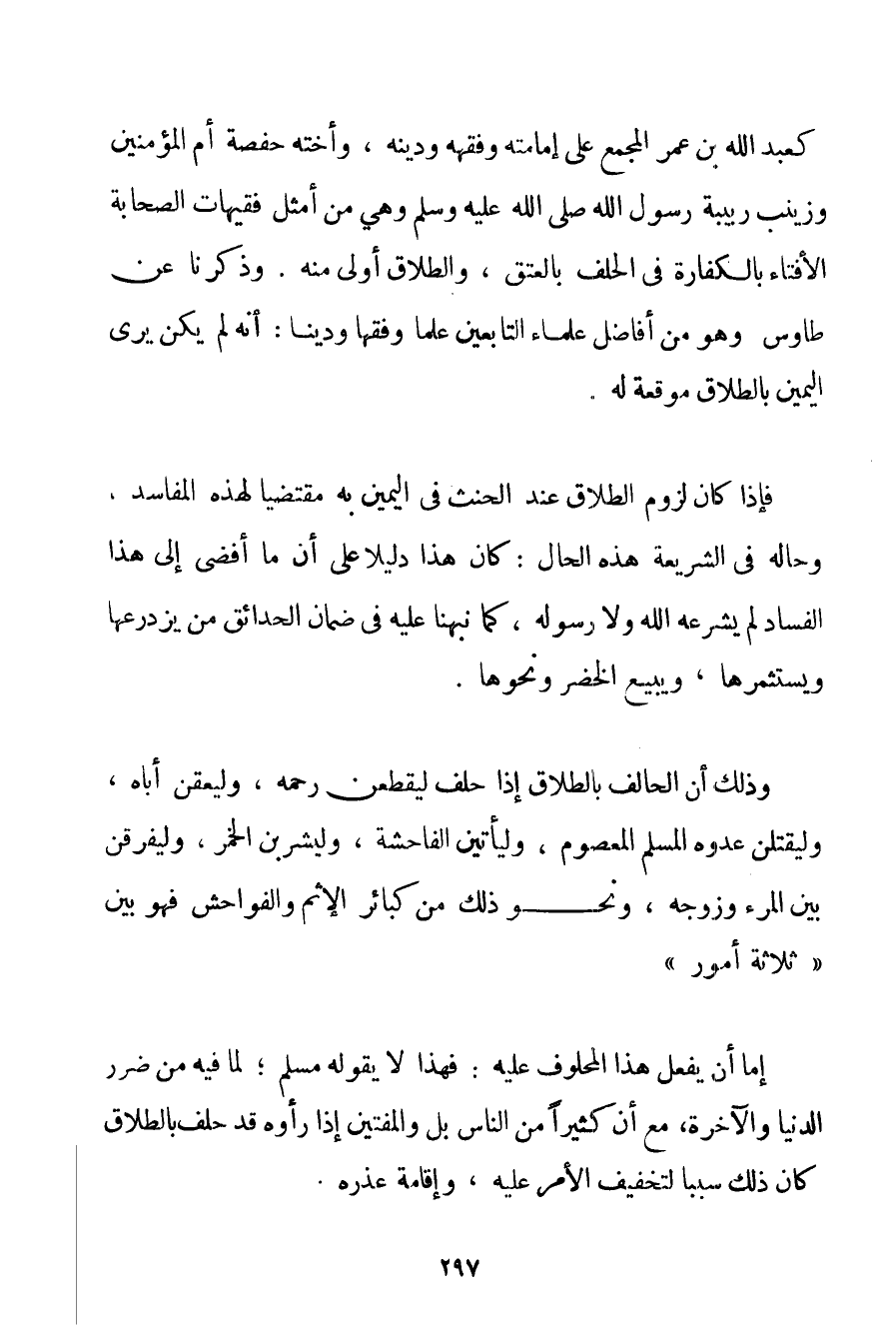 وَذَلِكَ أَنَّ الْحَالِفَ بِالطَّلَاقِ إذَا حَلَفَ لَيَقْطَعَنَّ رَحِمَهُ وَلَيَعُقَّنَّ أَبَاهُ وَلَيَقْتُلَنَّ عَدُوَّهُ الْمُسْلِمَ الْمَعْصُومَ وَلَيَأْتِيَنَّ الْفَاحِشَةَ وَلَيَشْرَبَنَّ الْخَمْرَ وَلَيُفَرِّقَنَّ بَيْنَ الْمَرْءِ وَزَوْجِهِ وَنَحْوَ ذَلِكَ مِنْ كَبَائِرِ الْإِثْمِ وَالْفَوَاحِشِ فَهُوَ بَيْنَ " ثَلَاثَةِ أُمُورٍ " إمَّا أَنْ يَفْعَلَ هَذَا الْمَحْلُوفَ عَلَيْهِ: فَهَذَا لَا يَقُولُهُ مُسْلِمٌ؛ لِمَا فِيهِ مِنْ ضَرَرِ الدُّنْيَا وَالْآخِرَةِ مَعَ أَنَّ كَثِيرًا مِنْ النَّاسِ بَلْ وَالْمُفْتِينَ إذَا رَأَوْهُ قَدْ حَلَفَ بِالطَّلَاقِ كَانَ ذَلِكَ سَبَبًا لِتَخْفِيفِ الْأَمْرِ عَلَيْهِ وَإِقَامَةِ عُذْرِهِ.