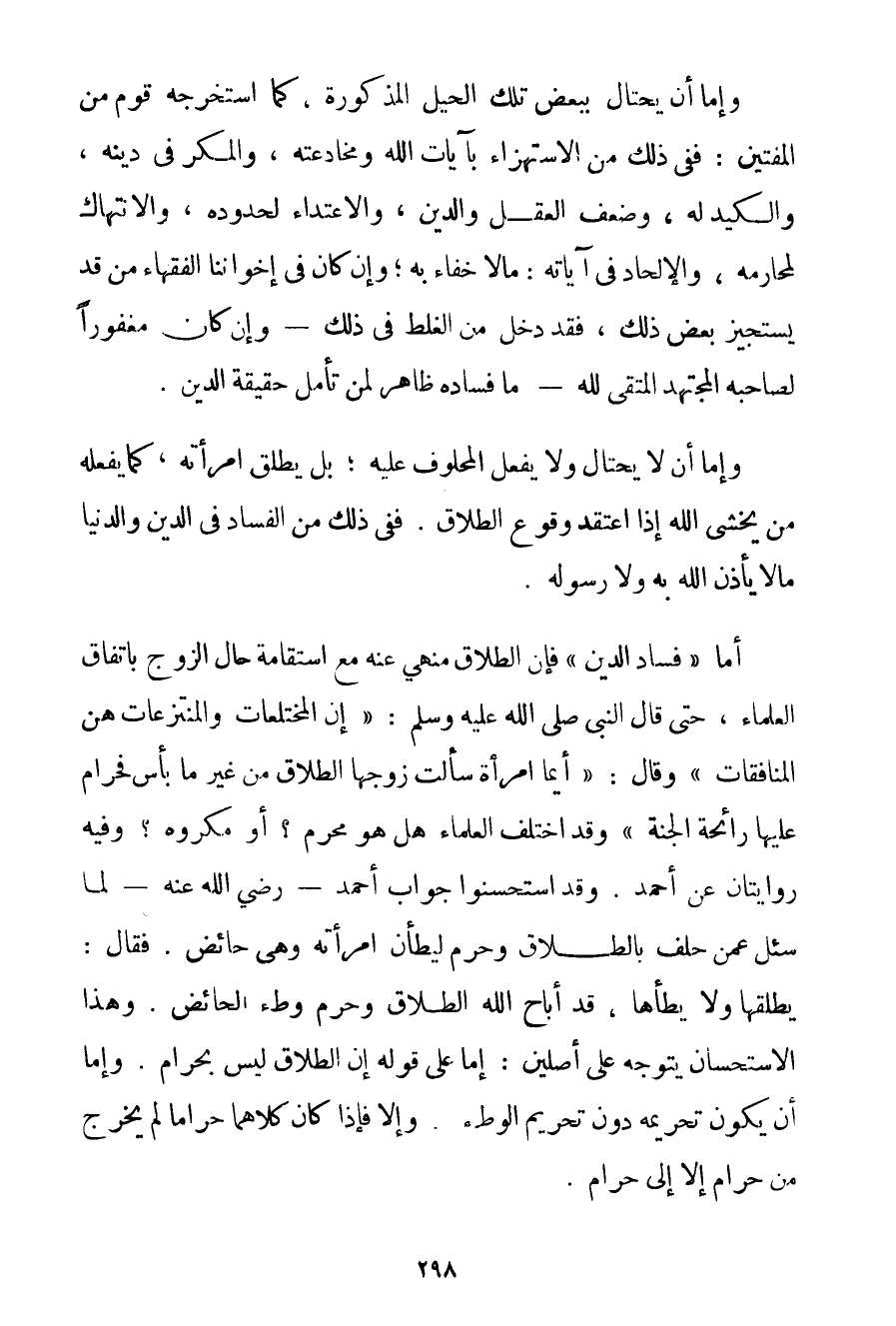 وَإِمَّا أَنْ يَحْتَالَ بِبَعْضِ تِلْكَ الْحِيَلِ الْمَذْكُورَةِ كَمَا اسْتَخْرَجَهُ قَوْمٌ مِنْ الْمُفْتِينَ: فَفِي ذَلِكَ مِنْ الِاسْتِهْزَاءِ بِآيَاتِ اللَّهِ وَمُخَادَعَتِهِ وَالْمَكْرِ فِي دِينِهِ وَالْكَيْدِ لَهُ وَضَعْفِ الْعَقْلِ وَالدِّينِ وَالِاعْتِدَاءِ لِحُدُودِهِ وَالِانْتِهَاكِ لِمَحَارِمِهِ وَالْإِلْحَادِ فِي آيَاتِهِ: مَا لَا خَفَاءَ بِهِ؛ وَإِنْ كَانَ فِي إخْوَانِنَا الْفُقَهَاءِ مَنْ قَدْ يَسْتَجِيزُ بَعْضَ ذَلِكَ فَقَدْ دَخَلَ مِنْ الْغَلَطِ فِي ذَلِكَ - وَإِنْ كَانَ مَغْفُورًا لِصَاحِبِهِ الْمُجْتَهِدِ الْمُتَّقِي لِلَّهِ - مَا فَسَادُهُ ظَاهِرٌ لِمَنْ تَأَمَّلَ حَقِيقَةَ الدِّينِ. وَإِمَّا أَنْ لَا يَحْتَالَ وَلَا يَفْعَلَ الْمَحْلُوفَ عَلَيْهِ؛ بَلْ يُطَلِّقُ امْرَأَتَهُ كَمَا يَفْعَلُهُ مَنْ يَخْشَى اللَّهَ إذَا اعْتَقَدَ وُقُوعَ الطَّلَاقِ. فَفِي ذَلِكَ مِنْ الْفَسَادِ فِي الدِّينِ وَالدُّنْيَا مَا لَا يَأْذَنُ اللَّهُ بِهِ وَلَا رَسُولُهُ. أَمَّا " فَسَادُ الدِّينِ " فَإِنَّ الطَّلَاقَ مَنْهِيٌّ عَنْهُ مَعَ اسْتِقَامَةِ حَالِ الزَّوْجِ بِاتِّفَاقِ الْعُلَمَاءِ حَتَّى قَالَ النَّبِيُّ صَلَّى اللَّهُ عَلَيْهِ وَسَلَّمَ {إنَّ الْمُخْتَلَعَاتِ وَالْمُنْتَزَعَاتِ هُنَّ الْمُنَافِقَاتُ} وَقَالَ: {أَيُّمَا امْرَأَةٍ سَأَلَتْ زَوْجَهَا الطَّلَاقَ مِنْ غَيْرِ مَا بَأْسٍ فَحَرَامٌ عَلَيْهَا رَائِحَةُ الْجَنَّةِ} وَقَدْ اخْتَلَفَ الْعُلَمَاءُ هَلْ هُوَ مُحَرَّمٌ؟ أَوْ مَكْرُوهٌ؟ وَفِيهِ رِوَايَتَانِ عَنْ أَحْمَد. وَقَدْ اسْتَحْسَنُوا جَوَابَ أَحْمَد - رَضِيَ اللَّهُ عَنْهُ - لَمَّا سُئِلَ عَمَّنْ حَلَفَ بِالطَّلَاقِ وَحَرَّمَ لَيَطَأَنَّ امْرَأَتَهُ وَهِيَ حَائِضٌ. فَقَالَ: يُطَلِّقُهَا وَلَا يَطَؤُهَا قَدْ أَبَاحَ اللَّهُ الطَّلَاقَ وَحَرَّمَ وَطْءَ الْحَائِضِ. وَهَذَا الِاسْتِحْسَانُ يَتَوَجَّهُ عَلَى أَصْلَيْنِ: إمَّا عَلَى قَوْلِهِ إنَّ الطَّلَاقَ لَيْسَ بِحَرَامِ. وَإِمَّا أَنْ يَكُونَ تَحْرِيمُهُ دُونَ تَحْرِيمِ الْوَطْءِ. وَإِلَّا فَإِذَا كَانَ كِلَاهُمَا حَرَامًا لَمْ يَخْرُجْ مِنْ حَرَامٍ إلَّا إلَى حَرَامٍ.