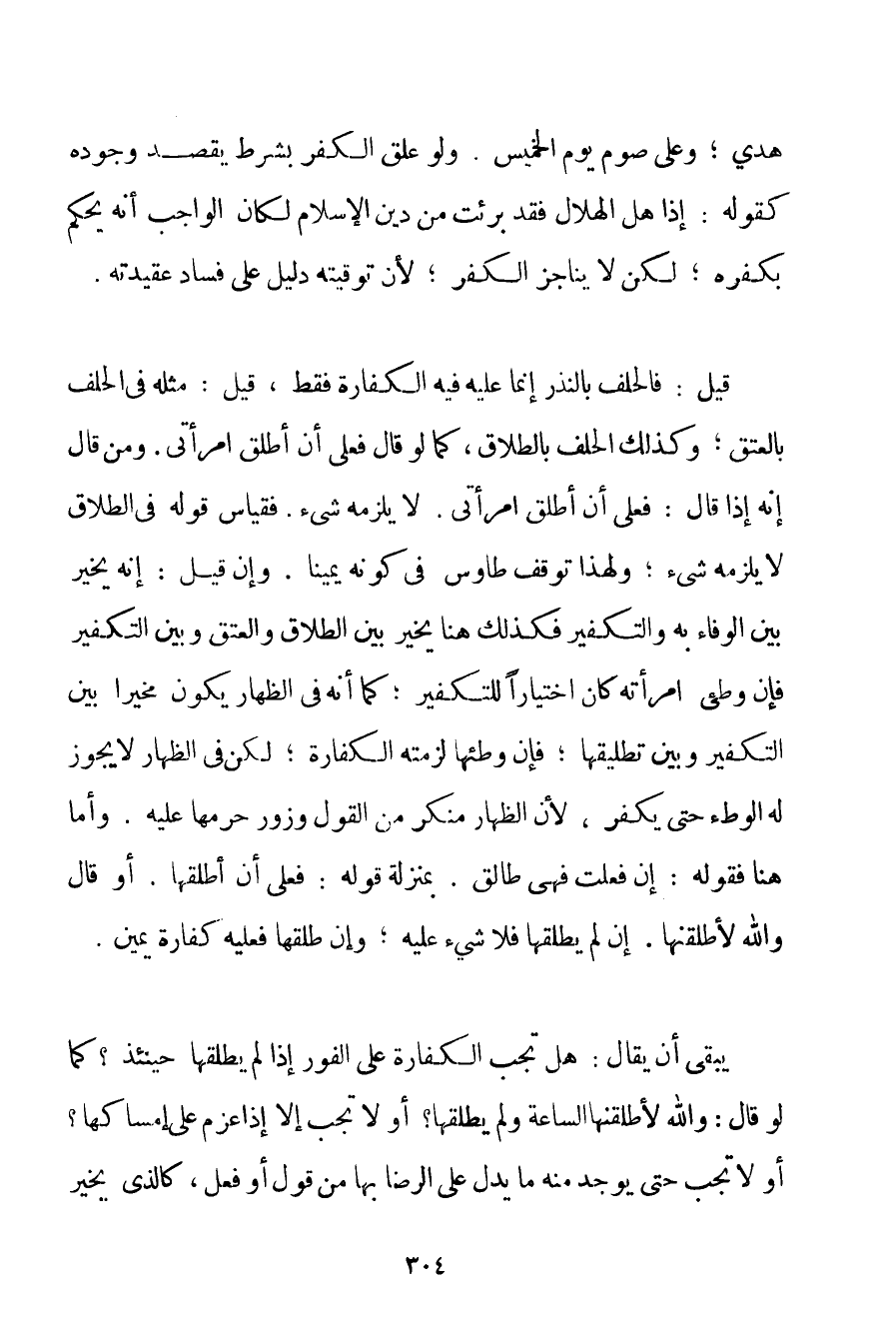 يَوْمِ الْخَمِيسِ. وَلَوْ عَلَّقَ الْكُفْرَ بِشَرْطِ يَقْصِدُ وُجُودَهُ كَقَوْلِهِ: إذَا هَلَّ الْهِلَالُ فَقَدْ بَرِئْت مِنْ دِينِ الْإِسْلَامِ لَكَانَ الْوَاجِبُ أَنَّهُ يُحْكَمُ بِكُفْرِهِ؛ لَكِنْ لَا يُنَاجَزُ الْكُفْرَ؛ لِأَنَّ تَوْقِيتَهُ دَلِيلٌ عَلَى فَسَادِ عَقِيدَتِهِ. قِيلَ: فَالْحَلِفُ بِالنَّذْرِ إنَّمَا عَلَيْهِ فِيهِ الْكَفَّارَةُ فَقَطْ قِيلَ: مِثْلُهُ فِي الْحَلِفِ بِالْعِتْقِ؛ وَكَذَلِكَ الْحَلِفُ بِالطَّلَاقِ كَمَا لَوْ قَالَ فَعَلَيَّ أَنْ أُطَلِّقَ امْرَأَتِي. وَمَنْ قَالَ إنَّهُ إذَا قَالَ: فَعَلَيَّ أَنْ أُطَلِّقَ امْرَأَتِي. لَا يَلْزَمُهُ شَيْءٌ. فَقِيَاسُ قَوْلِهِ فِي الطَّلَاقِ لَا يَلْزَمُهُ شَيْءٌ؛ وَلِهَذَا تَوَقَّفَ طاوس فِي كَوْنِهِ يَمِينًا. وَإِنْ قِيلَ: إنَّهُ يُخَيَّرُ بَيْنَ الْوَفَاءِ بِهِ وَالتَّكْفِيرِ فَكَذَلِكَ هُنَا يُخَيَّرُ بَيْنَ الطَّلَاقِ وَالْعِتْقِ وَبَيْنَ التَّكْفِيرِ فَإِنْ وَطِئَ امْرَأَتَهُ كَانَ اخْتِيَارًا لِلتَّكْفِيرِ؛ كَمَا أَنَّهُ فِي الظِّهَارِ يَكُونُ مُخَيَّرًا بَيْنَ التَّكْفِيرِ وَبَيْنَ تَطْلِيقِهَا؛ فَإِنْ وَطِئَهَا لَزِمَتْهُ الْكَفَّارَةُ؛ لَكِنْ فِي الظِّهَارِ لَا يَجُوزُ لَهُ الْوَطْءُ حَتَّى يُكَفِّرَ لِأَنَّ الظِّهَارَ مُنْكَرٌ مِنْ الْقَوْلِ وَزُورٌ حَرَّمَهَا عَلَيْهِ. وَأَمَّا هُنَا فَقَوْلُهُ: إنْ فَعَلْت فَهِيَ طَالِقٌ. بِمَنْزِلَةِ قَوْلِهِ: فَعَلَيَّ أَنْ أُطَلِّقَهَا. أَوْ قَالَ وَاَللَّهِ لَأُطَلِّقَنَّهَا. إنْ لَمْ يُطَلِّقْهَا فَلَا شَيْءَ عَلَيْهِ؛ وَإِنْ طَلَّقَهَا فَعَلَيْهِ كَفَّارَةُ يَمِينٍ. يَبْقَى أَنْ يُقَالَ: هَلْ تَجِبُ الْكَفَّارَةُ عَلَى الْفَوْرِ إذَا لَمْ يُطَلِّقْهَا حِينَئِذٍ؟ كَمَا لَوْ قَالَ: وَاَللَّهِ لَأُطَلِّقَنَّهَا السَّاعَةَ وَلَمْ يُطَلِّقْهَا؟ أَوْ لَا تَجِبُ إلَّا إذَا عَزَمَ عَلَى إمْسَاكِهَا؟ أَوْ لَا تَجِبُ حَتَّى يُوجَدَ مِنْهُ مَا يَدُلُّ عَلَى الرِّضَا بِهَا مِنْ قَوْلٍ أَوْ فِعْلٍ كَاَلَّذِي يُخَيَّرُ