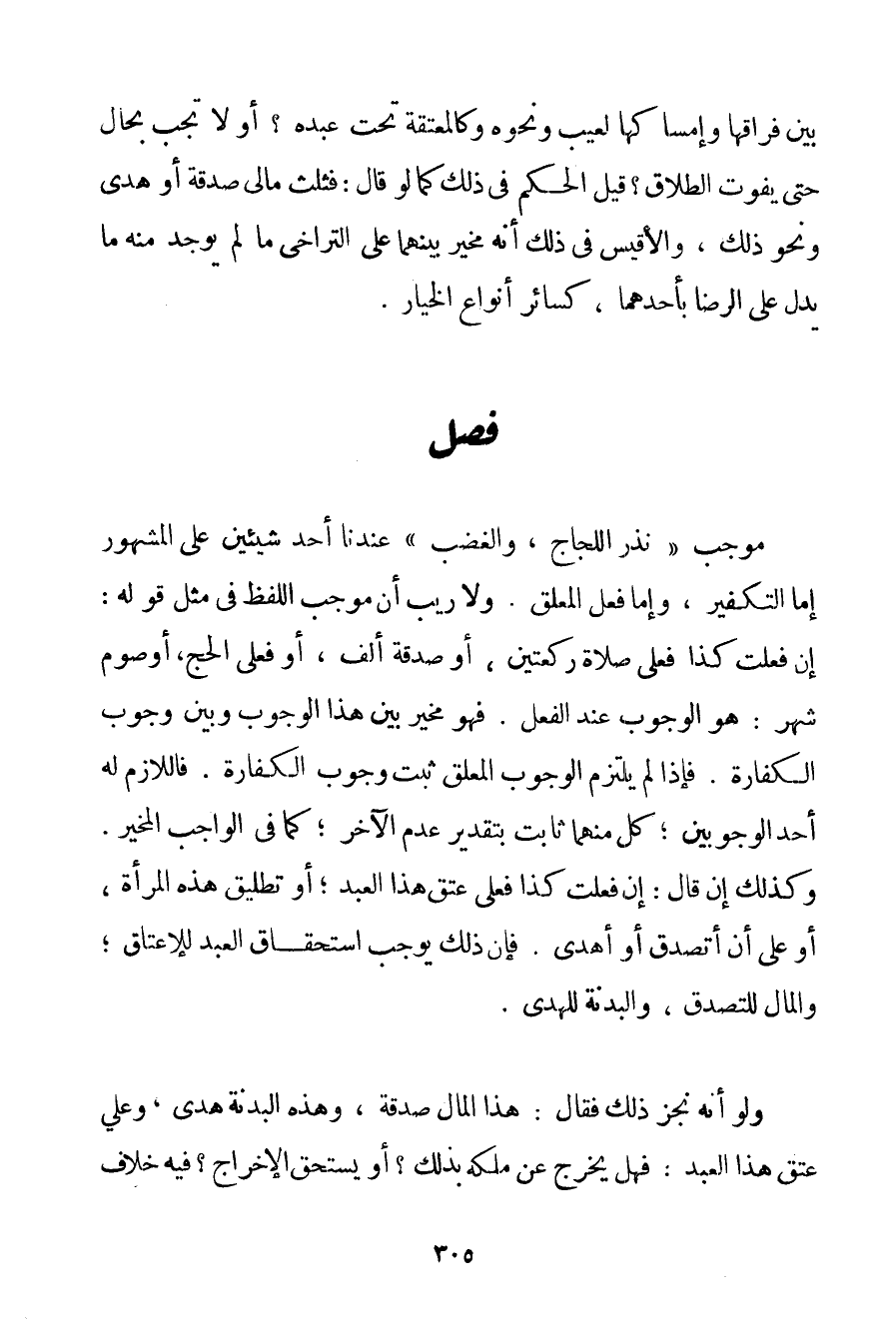 مُوجَبُ " نَذْرِ اللَّجَاجِ وَالْغَضَبِ " عِنْدَنَا أَحَدُ شَيْئَيْنِ عَلَى الْمَشْهُورِ إمَّا التَّكْفِيرُ وَإِمَّا فِعْلُ الْمُعَلَّقِ. وَلَا رَيْبَ أَنَّ مُوجَبَ اللَّفْظِ فِي مِثْلِ قَوْلِهِ: إنْ فَعَلْت كَذَا فَعَلَيَّ صَلَاةُ رَكْعَتَيْنِ أَوْ صَدَقَةُ أَلْفٍ أَوْ فَعَلَيَّ الْحَجُّ أَوْ صَوْمُ شَهْرٍ: هُوَ الْوُجُوبُ عِنْدَ الْفِعْلِ. فَهُوَ مُخَيَّرٌ بَيْنَ هَذَا الْوُجُوبِ وَبَيْنَ وُجُوبِ الْكَفَّارَةِ. فَإِذَا لَمْ يَلْتَزِمُ الْوُجُوبَ الْمُعَلَّقَ ثَبَتَ وُجُوبُ الْكَفَّارَةِ. فَاللَّازِمُ لَهُ أَحَدُ الوجوبين؛ كُلٌّ مِنْهُمَا ثَابِتٌ بِتَقْدِيرِ عَدَمِ الْآخَرِ؛ كَمَا فِي الْوَاجِبِ الْمُخَيَّرِ. وَكَذَلِكَ إنْ قَالَ: إنْ فَعَلْت كَذَا فَعَلَيَّ عِتْقُ هَذَا الْعَبْدِ؛ أَوْ تَطْلِيقُ هَذِهِ الْمَرْأَةِ أَوْ عَلَيَّ أَنْ أَتَصَدَّقَ أَوْ أَهْدِيَ. فَإِنَّ ذَلِكَ يُوجِبُ اسْتِحْقَاقَ الْعَبْدِ لِلْإِعْتَاقِ؛ وَالْمَالِ لِلتَّصَدُّقِ وَالْبَدَنَةِ لِلْهَدْيِ. وَلَوْ أَنَّهُ نَجَّزَ ذَلِكَ فَقَالَ: هَذَا الْمَالُ صَدَقَةٌ وَهَذِهِ الْبَدَنَةُ هَدْيٌ وَعَلَيَّ عِتْقُ هَذَا الْعَبْدِ: فَهَلْ يَخْرُجُ عَنْ مِلْكِهِ بِذَلِكَ؟ أَوْ يَسْتَحِقُّ الْإِخْرَاجَ؟ فِيهِ خِلَافٌ