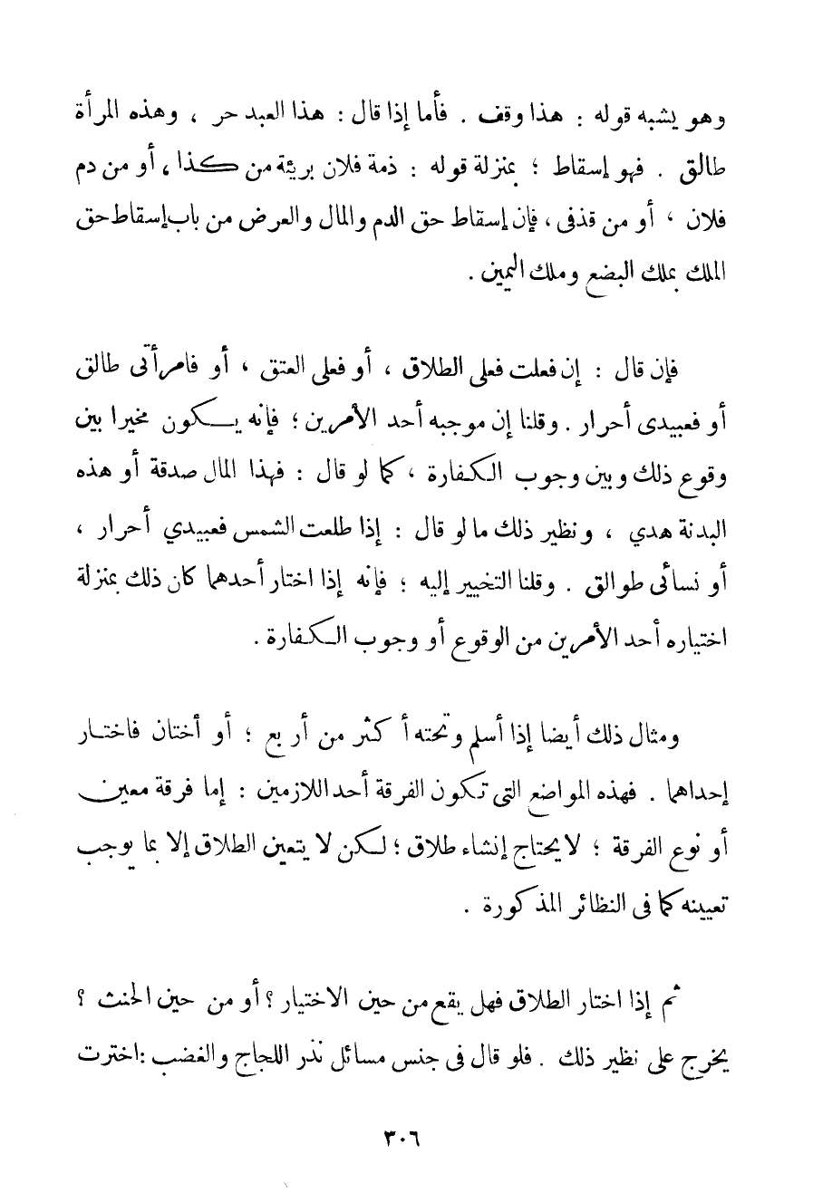 وَهُوَ يُشْبِهُ قَوْلَهُ: هَذَا وَقْفٌ. فَأَمَّا إذَا قَالَ: هَذَا الْعَبْدُ حُرٌّ وَهَذِهِ الْمَرْأَةُ طَالِقٌ. فَهُوَ إسْقَاطٌ؛ بِمَنْزِلَةِ قَوْلِهِ: ذِمَّةُ فُلَانٍ بَرِيئَةٌ مِنْ كَذَا أَوْ مِنْ دَمِ فُلَانٍ أَوْ مِنْ قَذْفِي فَإِنَّ إسْقَاطَ حَقِّ الدَّمِ وَالْمَالِ وَالْعِرْضِ مِنْ بَابِ إسْقَاطِ حَقِّ الْمِلْكِ بِمِلْكِ الْبُضْعِ وَمِلْكِ الْيَمِينِ. فَإِنْ قَالَ: إنْ فَعَلْت فَعَلَيَّ الطَّلَاقُ أَوْ فَعَلَيَّ الْعِتْقُ أَوْ فَامْرَأَتِي طَالِقٌ أَوْ فَعَبِيدِي أَحْرَارٌ. وَقُلْنَا إنَّ مُوجَبَهُ أَحَدُ الْأَمْرَيْنِ؛ فَإِنَّهُ يَكُونُ مُخَيَّرًا بَيْنَ وُقُوعِ ذَلِكَ وَبَيْنَ وُجُوبِ الْكَفَّارَةِ كَمَا لَوْ قَالَ: فَهَذَا الْمَالُ صَدَقَةٌ أَوْ هَذِهِ الْبَدَنَةُ هَدْيٌ وَنَظِيرُ ذَلِكَ مَا لَوْ قَالَ: إذَا طَلَعَتْ الشَّمْسُ فَعَبِيدِي أَحْرَارٌ أَوْ نِسَائِي طَوَالِقُ. وَقُلْنَا التَّخْيِيرُ إلَيْهِ؛ فَإِنَّهُ إذَا اخْتَارَ أَحَدَهُمَا كَانَ ذَلِكَ بِمَنْزِلَةِ اخْتِيَارِهِ أَحَدَ الْأَمْرَيْنِ مِنْ الْوُقُوعِ أَوْ وُجُوبِ الْكَفَّارَةِ. وَمِثَالٌ ذَلِكَ أَيْضًا إذَا أَسْلَمَ وَتَحْتَهُ أَكْثَرُ مِنْ أَرْبَعٍ؛ أَوْ أُخْتَانِ فَاخْتَارَ إحْدَاهُمَا. فَهَذِهِ الْمَوَاضِعُ الَّتِي تَكُونُ الْفُرْقَةُ أَحَدَ اللَّازِمَيْنِ: إمَّا فُرْقَةُ مُعَيَّنٍ أَوْ نَوْعُ الْفُرْقَةِ؛ لَا يَحْتَاجُ إنْشَاءَ طَلَاقٍ؛ لَكِنْ لَا يَتَعَيَّنُ الطَّلَاقُ إلَّا بِمَا يُوجِبُ تَعْيِينَهُ كَمَا فِي النَّظَائِرِ الْمَذْكُورَةِ. ثُمَّ إذَا اخْتَارَ الطَّلَاقَ فَهَلْ يَقَعُ مِنْ حِينِ الِاخْتِيَارِ؟ أَوْ مِنْ حِينِ الْحِنْثِ؟ يُخَرَّجُ عَلَى نَظِيرِ ذَلِكَ. فَلَوْ قَالَ فِي جِنْسِ مَسَائِلِ نَذْرِ اللَّجَاجِ وَالْغَضَبِ: اخْتَرْت