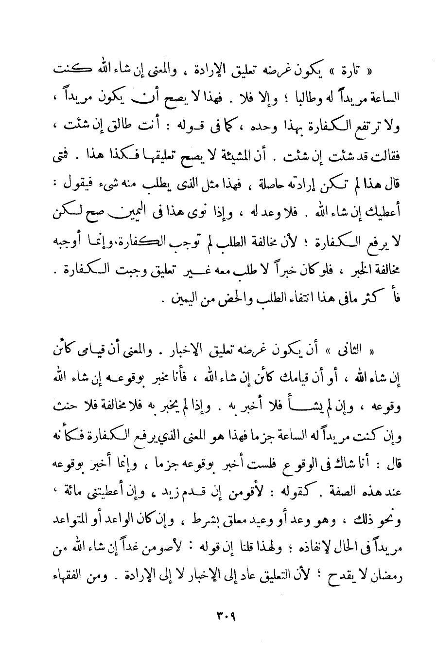 " تَارَةً " يَكُونُ غَرَضُهُ تَعْلِيقُ الْإِرَادَةِ وَالْمَعْنَى إنْ شَاءَ اللَّهُ كُنْت السَّاعَةَ مُرِيدًا لَهُ وَطَالِبًا؛ وَإِلَّا فَلَا. فَهَذَا لَا يَصِحُّ أَنْ يَكُونَ مُرِيدًا وَلَا تَرْتَفِعُ الْكَفَّارَةُ بِهَذَا وَحْدَهُ كَمَا فِي قَوْلِهِ: أَنْت طَالِقٌ إنْ شِئْت فَقَالَتْ قَدْ شِئْت إنْ شِئْت. أَنَّ الْمَشِيئَةَ لَا يَصِحُّ تَعْلِيقُهَا فَكَذَا هَذَا. فَمَتَى قَالَ هَذَا لَمْ تَكُنْ إرَادَتُهُ حَاصِلَةً فَهَذَا مِثْلُ الَّذِي يُطْلَبُ مِنْهُ شَيْءٌ فَيَقُولُ: أُعْطِيك إنْ شَاءَ اللَّهُ. فَلَا وَعْدَ لَهُ وَإِذَا نَوَى هَذَا فِي الْيَمِينِ صَحَّ لَكِنْ لَا يَرْفَعُ الْكَفَّارَةَ؛ لِأَنَّ مُخَالَفَةَ الطَّلَبِ لَمْ تُوجِبْ الْكَفَّارَةَ وَإِنَّمَا أَوْجَبَهُ مُخَالَفَةُ الْخَبَرِ فَلَوْ كَانَ خَبَرًا لَا طَلَبَ مَعَهُ غَيْرَ تَعْلِيقٍ وَجَبَتْ الْكَفَّارَةُ. فَأَكْثَرَ مَا فِي هَذَا انْتِفَاءُ الطَّلَبِ وَالْحَضِّ مِنْ الْيَمِينِ. " الثَّانِي " أَنْ يَكُونَ غَرَضُهُ تَعْلِيقَ الْإِخْبَارِ. وَالْمَعْنَى أَنَّ قِيَامِي كَائِنٌ إنْ شَاءَ اللَّهُ أَوْ أَنَّ قِيَامَك كَائِنٌ إنْ شَاءَ اللَّهُ فَأَنَا مُخْبِرٌ بِوُقُوعِهِ إنْ شَاءَ اللَّهُ وُقُوعَهُ وَإِنْ لَمْ يَشَأْ فَلَا أُخْبِرُ بِهِ. وَإِذَا لَمْ يُخْبِرْ بِهِ فَلَا مُخَالَفَةَ فَلَا حِنْثَ وَإِنْ كُنْت مُرِيدًا لَهُ السَّاعَةَ جَزْمًا فَهَذَا هُوَ الْمَعْنَى الَّذِي يَرْفَعُ الْكَفَّارَةَ فَكَأَنَّهُ قَالَ: أَنَا شَاكٌّ فِي الْوُقُوعِ فَلَسْت أُخْبِرُ بِوُقُوعِهِ جَزْمًا وَإِنَّمَا أُخْبِرُ بِوُقُوعِهِ عِنْدَ هَذِهِ الصِّفَةِ. كَقَوْلِهِ: لَأَقُومَنَّ إنْ قَدِمَ زَيْدٌ وَإِنْ أَعْطَيْتنِي مِائَةً وَنَحْوَ ذَلِكَ وَهُوَ وَعْدٌ أَوْ وَعِيدٌ مُعَلَّقٌ بِشَرْطِ وَإِنْ كَانَ الْوَاعِدُ أَوْ الْمُتَوَاعِدُ مُرِيدًا فِي الْحَالِ لِإِنْفَاذِهِ؛ وَلِهَذَا قُلْنَا إنَّ قَوْلَهُ: لَأَصُومَنَّ غَدًا إنْ شَاءَ اللَّهُ مِنْ رَمَضَانَ لَا يَقْدَحُ؛ لِأَنَّ التَّعْلِيقَ عَادَ إلَى الْإِخْبَارِ لَا إلَى الْإِرَادَةِ. وَمِنْ الْفُقَهَاءِ
