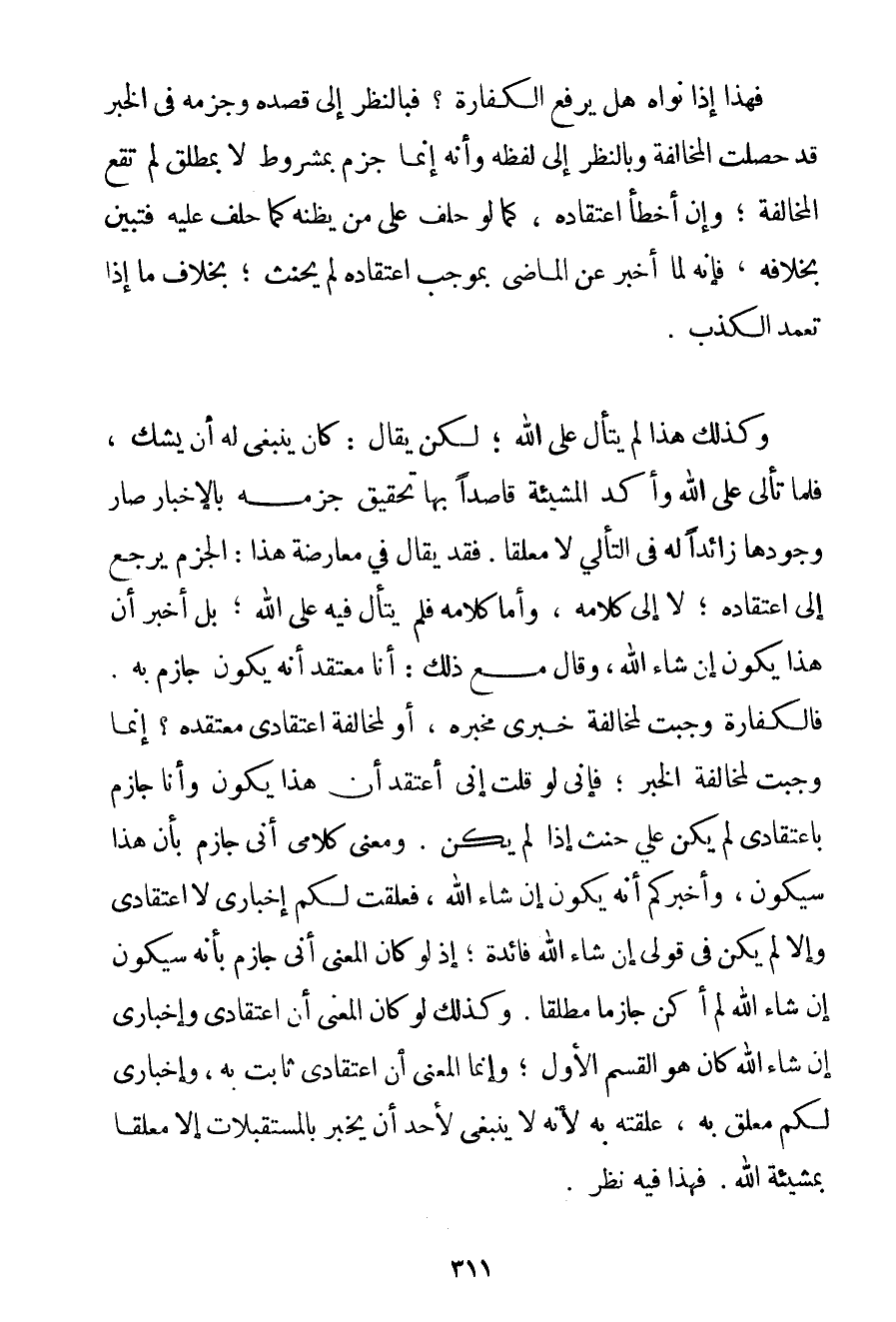 فَهَذَا إذَا نَوَاهُ هَلْ يَرْفَعُ الْكَفَّارَةَ؟ فَبِالنَّظَرِ إلَى قَصْدِهِ وَجَزْمِهِ فِي الْخَبَرِ قَدْ حَصَلَتْ الْمُخَالَفَةُ وَبِالنَّظَرِ إلَى لَفْظِهِ وَأَنَّهُ إنَّمَا جَزَمَ بِمَشْرُوطِ لَا بِمُطْلَقِ لَمْ تَقَعْ الْمُخَالَفَةُ؛ وَإِنْ أَخْطَأَ اعْتِقَادُهُ كَمَا لَوْ حَلَفَ عَلَى مَنْ يَظُنُّهُ كَمَا حَلَفَ عَلَيْهِ فَتَبَيَّنَ بِخِلَافِهِ فَإِنَّهُ لَمَّا أَخْبَرَ عَنْ الْمَاضِي بِمُوجَبِ اعْتِقَادِهِ لَمْ يَحْنَثْ؛ بِخِلَافِ مَا إذَا تَعَمَّدَ الْكَذِبَ. وَكَذَلِكَ هَذَا لَمْ يَتَأَلَّ عَلَى اللَّهِ؛ لَكِنْ يُقَالُ: كَانَ يَنْبَغِي لَهُ أَنْ يَشُكَّ فَلَمَّا تَأَلَّى عَلَى اللَّهِ وَأَكَّدَ الْمَشِيئَةَ قَاصِدًا بِهَا تَحْقِيقَ جَزْمِهِ بِالْإِخْبَارِ صَارَ وَجُودُهَا زَائِدًا لَهُ فِي التَّأَلِّي لَا مُعَلَّقًا. فَقَدْ يُقَالُ فِي مُعَارَضَةِ هَذَا: الْجَزْمِ يُرْجَعُ إلَى اعْتِقَادِهِ؛ لَا إلَى كَلَامِهِ وَأَمَّا كَلَامُهُ فَلَمْ يَتَأَلَّ فِيهِ عَلَى اللَّهِ؛ بَلْ أَخْبَرَ أَنَّ هَذَا يَكُونُ إنْ شَاءَ اللَّهُ وَقَالَ مَعَ ذَلِكَ: أَنَا مُعْتَقِدٌ أَنَّهُ يَكُونُ جَازِمًا بِهِ. فَالْكَفَّارَةُ وَجَبَتْ لِمُخَالَفَةِ خَبَرِي مُخْبَرِهِ أَوْ لِمُخَالَفَةِ اعْتِقَادِي مُعْتَقَدِهِ؟ إنَّمَا وَجَبَتْ لِمُخَالَفَةِ الْخَبَرِ فَإِنِّي لَوْ قُلْت إنِّي أَعْتَقِدُ أَنَّ هَذَا يَكُونُ وَأَنَا جَازِمٌ بِاعْتِقَادِي لَمْ يَكُنْ عَلَيَّ حِنْثٌ إذَا لَمْ يَكُنْ. وَمَعْنَى كَلَامِي أَنِّي جَازِمٌ بِأَنَّ هَذَا سَيَكُونُ وَأُخْبِرُكُمْ أَنَّهُ يَكُونُ إنْ شَاءَ اللَّهُ فَعَلَّقْت لَكُمْ إخْبَارِي لَا اعْتِقَادِي وَإِلَّا لَمْ يَكُنْ فِي قَوْلِي إنْ شَاءَ اللَّهُ فَائِدَةٌ؛ إذْ لَوْ كَانَ الْمَعْنَى أَنِّي جَازِمٌ بِأَنَّهُ سَيَكُونُ إنْ شَاءَ اللَّهُ لَمْ أَكُنْ جَازِمًا مُطْلَقًا. وَكَذَلِكَ لَوْ كَانَ الْمَعْنَى أَنَّ اعْتِقَادِي وَإِخْبَارِي إنْ شَاءَ اللَّهُ كَانَ هُوَ الْقَسَمَ الْأَوَّلَ؛ وَإِنَّمَا الْمَعْنَى أَنَّ اعْتِقَادِي ثَابِتٌ بِهِ وَإِخْبَارِي لَكُمْ مُعَلَّقٌ بِهِ عَلَّقْته بِهِ لِأَنَّهُ لَا يَنْبَغِي لِأَحَدِ أَنْ يُخْبِرَ بالمستقبلات إلَّا مُعَلِّقًا بِمَشِيئَةِ اللَّهِ. فَهَذَا فِيهِ نَظَرٌ.
