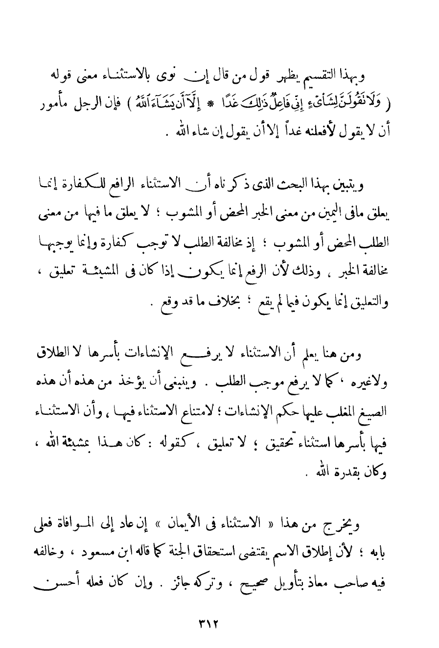 وَبِهَذَا التَّقْسِيمِ يَظْهَرُ قَوْلُ مَنْ قَالَ إنْ نَوَى بِالِاسْتِثْنَاءِ مَعْنَى قَوْلِهِ {وَلَا تَقُولَنَّ لِشَيْءٍ إنِّي فَاعِلٌ ذَلِكَ غَدًا} {إلَّا أَنْ يَشَاءَ اللَّهُ} فَإِنَّ الرَّجُلَ مَأْمُورٌ أَنْ لَا يَقُولَ لَأَفْعَلَنَّهُ غَدًا إلَّا أَنْ يَقُولَ إنْ شَاءَ اللَّهُ. وَيَتَبَيَّنُ بِهَذَا الْبَحْثِ الَّذِي ذَكَرْنَاهُ أَنَّ الِاسْتِثْنَاءَ الرَّافِعَ لِلْكَفَّارَةِ إنَّمَا يُعَلِّقُ مَا فِي الْيَمِينِ مِنْ مَعْنَى الْخَبَرِ الْمَحْضِ أَوْ الْمَشُوبِ؛ لَا يُعَلِّقُ مَا فِيهَا مِنْ مَعْنَى الطَّلَبِ الْمَحْضِ أَوْ الْمَشُوبِ؛ إذْ مُخَالَفَةُ الطَّلَبِ لَا تُوجِبُ كَفَّارَةً وَإِنَّمَا يُوجِبُهَا مُخَالَفَةُ الْخَبَرِ وَذَلِكَ لِأَنَّ الرَّفْعَ إنَّمَا يَكُونُ إذَا كَانَ فِي الْمَشِيئَةِ تَعْلِيقٌ وَالتَّعْلِيقُ إنَّمَا يَكُونُ فِيمَا لَمْ يَقَعْ؛ بِخِلَافِ مَا قَدْ وَقَعَ. وَمِنْ هُنَا يُعْلَمُ أَنَّ الِاسْتِثْنَاءَ لَا يَرْفَعُ الْإِنْشَاءَاتِ بِأَسْرِهَا لَا الطَّلَاقَ وَلَا غَيْرَهُ كَمَا لَا يَرْفَعُ مُوجَبَ الطَّلَبِ. وَيَنْبَغِي أَنْ يُؤْخَذَ مِنْ هَذِهِ أَنَّ هَذِهِ الصِّيَغَ الْمُغَلَّبُ عَلَيْهَا حُكْمُ الْإِنْشَاءَاتِ؛ لِامْتِنَاعِ الِاسْتِثْنَاءِ فِيهَا وَأَنَّ الِاسْتِثْنَاءَ فِيهَا بِأَسْرِهَا اسْتِثْنَاءُ تَحْقِيقٌ؛ لَا تَعْلِيقٍ كَقَوْلِهِ: كَانَ هَذَا بِمَشِيئَةِ اللَّهِ وَكَانَ بِقُدْرَةِ اللَّهِ. وَيُخَرَّجُ مِنْ هَذَا " الِاسْتِثْنَاءِ فِي الْأَيْمَانِ " إنْ عَادَ إلَى الْمُوَافَاةِ فَعَلَى بَابِهِ؛ لِأَنَّ إطْلَاقَ الِاسْمِ يَقْتَضِي اسْتِحْقَاقَ الْجَنَّةِ كَمَا قَالَهُ ابْنُ مَسْعُودٍ وَخَالَفَهُ فِيهِ صَاحِبُ مُعَاذٍ بِتَأْوِيلِ صَحِيحٍ وَتَرْكُهُ جَائِزٌ. وَإِنْ كَانَ فِعْلُهُ أَحْسَنَ