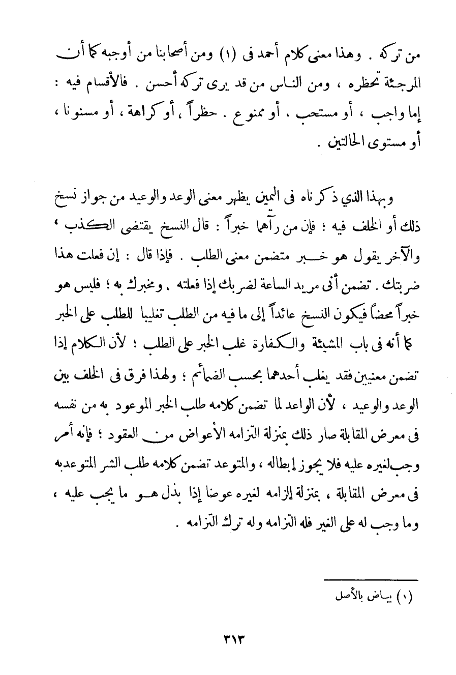 مِنْ تَرْكِهِ. وَهَذَا مَعْنَى كَلَامِ أَحْمَد فِي. . . (1) وَمِنْ أَصْحَابِنَا مَنْ أَوْجَبَهُ كَمَا أَنَّ الْمُرْجِئَةَ تَحْظُرُهُ وَمِنْ النَّاسِ مَنْ قَدْ يَرَى تَرْكَهُ أَحْسَنَ. فَالْإِقْسَامُ فِيهِ: إمَّا وَاجِبٌ أَوْ مُسْتَحَبٌّ أَوْ مَمْنُوعٌ. حَظْرًا أَوْ كَرَاهَةً أَوْ مَسْنُونًا أَوْ مُسْتَوِي الْحَالَتَيْنِ. وَبِهَذَا الَّذِي ذَكَرْنَاهُ فِي الْيَمِينِ يَظْهَرُ مَعْنَى الْوَعْدِ وَالْوَعِيدِ مِنْ جَوَازِ نَسْخِ ذَلِكَ أَوْ الْخَلْفِ فِيهِ؛ فَإِنَّ مَنْ رَآهُمَا خَبَرًا: قَالَ النَّسْخُ يَقْتَضِي الْكَذِبَ وَالْآخَرُ يَقُولُ هُوَ خَبَرٌ مُتَضَمِّنٌ مَعْنَى الطَّلَبِ. فَإِذَا قَالَ: إنْ فَعَلْت هَذَا ضَرَبْتُك. تَضَمَّنَ إنِّي مُرِيدٌ السَّاعَةَ لِضَرْبِك إذَا فَعَلْته وَمُخْبِرُك بِهِ؛ فَلَيْسَ هُوَ خَبَرًا مَحْضًا فَيَكُونُ النَّسْخُ عَائِدًا إلَى مَا فِيهِ مِنْ الطَّلَبِ تَغْلِيبًا لِلطَّلَبِ عَلَى الْخَبَرِ كَمَا أَنَّهُ فِي بَابِ الْمَشِيئَةِ وَالْكَفَّارَةِ غَلَبَ الْخَبَرُ عَلَى الطَّلَبِ؛ لِأَنَّ الْكَلَامَ إذَا تَضَمَّنَ مَعْنَيَانِ فَقَدْ يَغْلِبُ أَحَدُهُمَا بِحَسَبِ الضمائم؛ وَلِهَذَا فَرَّقَ فِي الْخَلْفِ بَيْنَ الْوَعْدِ وَالْوَعِيدِ لِأَنَّ الْوَاعِدَ لَمَّا تَضَمَّنَ كَلَامُهُ طَلَبَ الْخَبَرِ الْمَوْعُودِ بِهِ مِنْ نَفْسِهِ فِي مَعْرِضِ الْمُقَابَلَةِ صَارَ ذَلِكَ بِمَنْزِلَةِ الْتِزَامِهِ الْأَعْوَاضَ مِنْ الْعُقُودِ؛ فَإِنَّهُ أَمْرٌ وَجَبَ لِغَيْرِهِ عَلَيْهِ فَلَا يَجُوزُ إبْطَالُهُ وَالْمُتَوَعِّدُ تَضَمَّنَ كَلَامُهُ طَلَبَ الشَّرِّ الْمُتَوَعَّدِ بِهِ فِي مَعْرِضِ الْمُقَابَلَةِ بِمَنْزِلَةِ إلْزَامِهِ لِغَيْرِهِ عِوَضًا إذَا بَذَلَ هُوَ مَا يَجِبُ عَلَيْهِ وَمَا وَجَبَ لَهُ عَلَى الْغَيْرِ فَلَهُ الْتِزَامُهُ وَلَهُ تَرْكُ الْتِزَامِهِ.