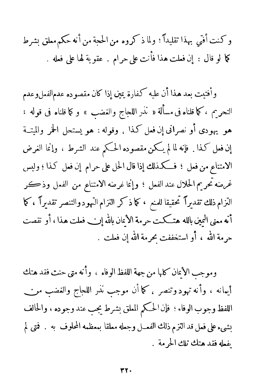 وَكُنْت أُفْتِي بِهَذَا تَقْلِيدًا؛ وَلِمَا ذَكَرُوهُ مِنْ الْحُجَّةِ مِنْ أَنَّهُ حُكْمٌ مُعَلَّقٌ بِشَرْطِ كَمَا لَوْ قَالَ: إنْ فَعَلْت هَذَا فَأَنْت عَلَيَّ حَرَامٌ. عُقُوبَةً لَهَا عَلَى فِعْلِهِ. وَأَفْتَيْت بَعْدَ هَذَا أَنَّ عَلَيْهِ كَفَّارَةَ يَمِينٍ إذَا كَانَ مَقْصُودُهُ عَدَمَ الْفِعْلِ وَعَدَمَ التَّحْرِيمِ كَمَا قُلْنَاهُ فِي مَسْأَلَةِ " نَذْرِ اللَّجَاجِ وَالْغَضَبِ " وَكَمَا قُلْنَاهُ فِي قَوْلِهِ: هُوَ يَهُودِيٌّ أَوْ نَصْرَانِيٌّ إنْ فَعَلَ كَذَا وَقَوْلِهِ: هُوَ يَسْتَحِلُّ الْخَمْرَ وَالْمَيْتَةَ إنْ فَعَلَ كَذَا. فَإِنَّهُ لَمَّا لَمْ يَكُنْ مَقْصُودُهُ الْحُكْمَ عِنْدَ الشَّرْطِ وَإِنَّمَا الْغَرَضُ الِامْتِنَاعُ مِنْ فِعْلٍ؛ فَكَذَلِكَ إذَا قَالَ الْحِلُّ عَلَيَّ حَرَامٌ إنْ فَعَلَ كَذَا؛ وَلَيْسَ غَرَضُهُ تَحْرِيمَ الْحَلَالِ عِنْدَ الْفِعْلِ؛ وَإِنَّمَا غَرَضُهُ الِامْتِنَاعُ مِنْ الْفِعْلِ وَذِكْرُ الْتِزَامِ ذَلِكَ تَقْدِيرًا تَحْقِيقًا لِلْمَنْعِ كَمَا ذُكِرَ الْتِزَامُ التَّهَوُّدِ وَالتَّنَصُّرِ تَقْدِيرًا كَمَا أَنَّهُ مَعْنَى الْيَمِينِ بِاَللَّهِ هَتَكْت حُرْمَةَ الْأَيْمَانِ بِاَللَّهِ إنْ فَعَلْت هَذَا أَوْ نَقَصْت حُرْمَةَ اللَّهِ أَوْ اسْتَخْفَفْت بِحُرْمَةِ اللَّهِ إنْ فَعَلْت. وَمُوجَبُ الْأَيْمَانِ كُلِّهَا مِنْ جِهَةِ اللَّفْظِ الْوَفَاءُ وَأَنَّهُ مَتَى حَنِثَ فَقَدْ هَتَكَ أَيْمَانَهُ وَأَنَّهُ تَهَوَّدَ وَتَنَصَّرَ كَمَا أَنَّ مُوجَبَ نَذْرِ اللَّجَاجِ وَالْغَضَبِ مِنْ اللَّفْظِ وُجُوبُ الْوَفَاءِ؛ فَإِنَّ الْحُكْمَ الْمُعَلَّقَ بِشَرْطِ يَجِبُ عِنْدَ وُجُودِهِ وَالْحَالِفُ بِشَيْءِ عَلَى فِعْلٍ قَدْ الْتَزَمَ ذَلِكَ الْفِعْلَ وَجَعَلَهُ مُعَلَّقًا بِمُعَظَّمِهِ الْمَحْلُوفِ بِهِ. فَمَتَى لَمْ يَفْعَلْهُ فَقَدْ هَتَكَ تِلْكَ الْحُرْمَةَ.