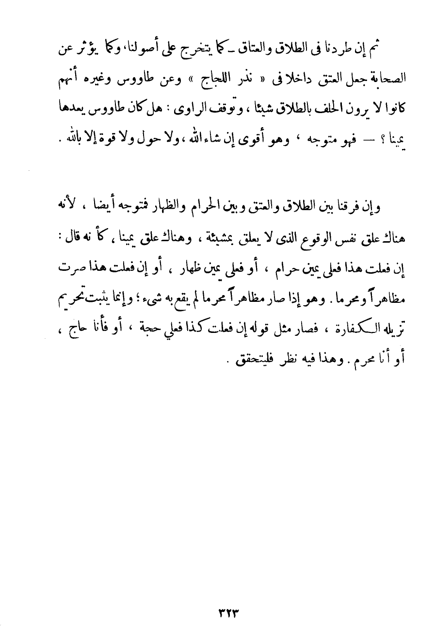 ثُمَّ إنَّ طَرَدْنَا فِي الطَّلَاقِ وَالْعِتَاقِ - كَمَا يَتَخَرَّجُ عَلَى أُصُولِنَا وَكَمَا يُؤْثَرُ عَنْ الصَّحَابَةِ جُعِلَ الْعِتْقُ دَاخِلًا فِي " نَذْرِ اللَّجَاجِ " وَعَنْ طاوس وَغَيْرِهِ أَنَّهُمْ كَانُوا لَا يَرَوْنَ الْحَلِفَ بِالطَّلَاقِ شَيْئًا وَتَوَقَّفَ الرَّاوِي: هَلْ كَانَ طاوس يَعُدُّهَا يَمِينًا؟ - فَهُوَ مُتَوَجِّهٌ وَهُوَ أَقْوَى إنْ شَاءَ اللَّهُ وَلَا حَوْلَ وَلَا قُوَّةَ إلَّا بِاَللَّهِ. وَإِنْ فَرَّقْنَا بَيْنَ الطَّلَاقِ وَالْعِتْقِ وَبَيْنَ الْحَرَامِ وَالظِّهَارِ فَمُتَوَجِّهٌ أَيْضًا لِأَنَّهُ هُنَاكَ عَلَّقَ نَفْسَ الْوُقُوعِ الَّذِي لَا يُعَلَّقُ بِمَشِيئَةِ وَهُنَاكَ عَلَّقَ يَمِينًا كَأَنَّهُ قَالَ: إنْ فَعَلْت هَذَا فَعَلَيَّ يَمِينُ حَرَامٍ أَوْ فَعَلَيَّ يَمِينُ ظِهَارٍ أَوْ إنْ فَعَلْت هَذَا صِرْت مُظَاهِرًا وَمُحَرِّمًا. وَهُوَ إذَا صَارَ مُظَاهِرًا مُحَرِّمًا لَمْ يَقَعْ بِهِ شَيْءٌ؛ وَإِنَّمَا يَثْبُتُ تَحْرِيمُ تَزَيُّلِهِ الْكَفَّارَةَ فَصَارَ مِثْلَ قَوْلِهِ إنْ فَعَلْت كَذَا فَعَلَيَّ حَجَّةٌ أَوْ فَأَنَا حَاجٌّ أَوْ أَنَا مُحْرِمٌ. وَهَذَا فِيهِ نَظَرٌ فَلْيُتَحَقَّقْ.