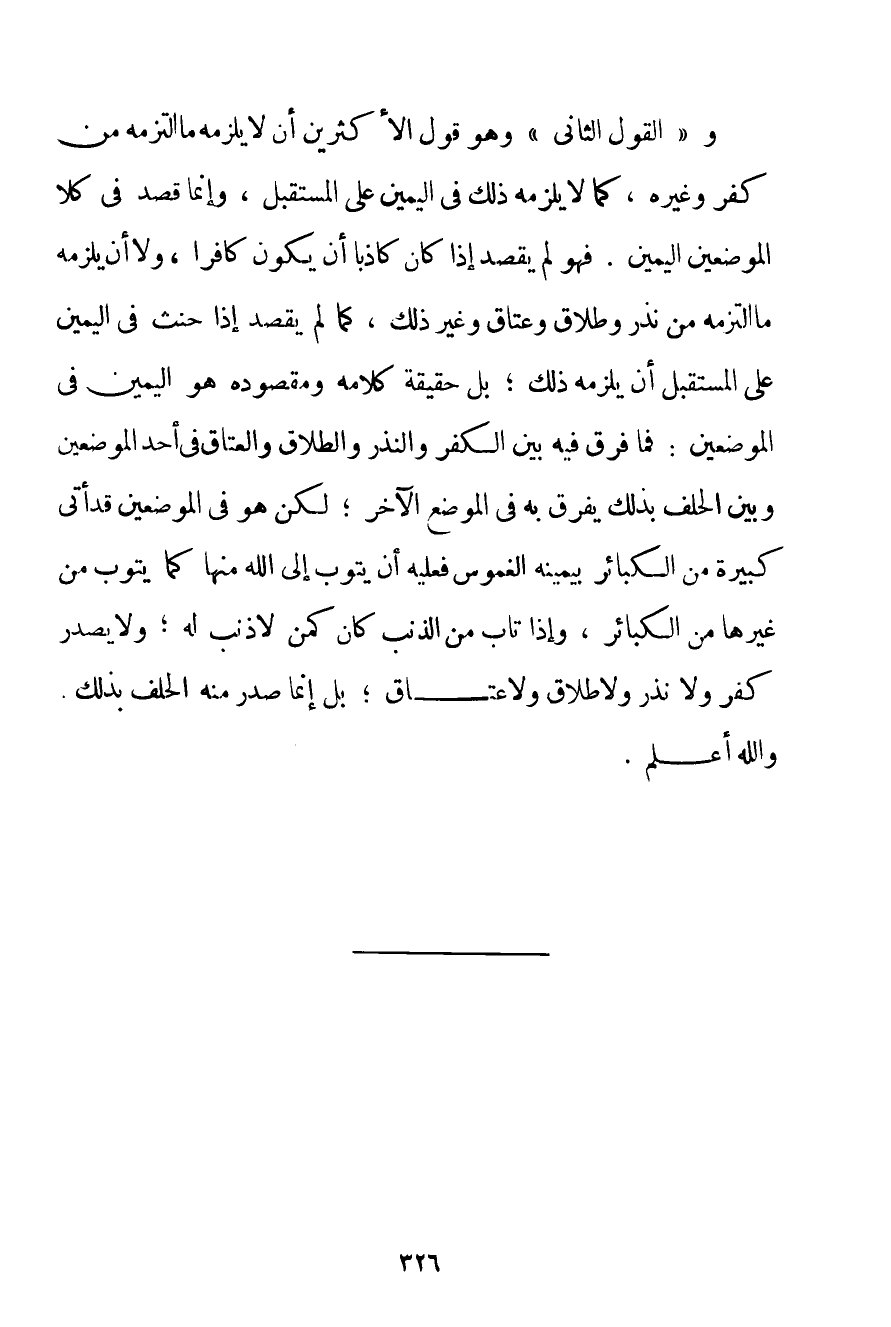 و " الْقَوْلُ الثَّانِي " وَهُوَ قَوْلُ الْأَكْثَرِينَ أَنْ لَا يَلْزَمَهُ مَا الْتَزَمَهُ مِنْ كُفْرٍ وَغَيْرِهِ كَمَا لَا يَلْزَمُهُ ذَلِكَ فِي الْيَمِينِ عَلَى الْمُسْتَقْبَلِ وَإِنَّمَا قَصَدَ فِي كِلَا الْمَوْضِعَيْنِ الْيَمِينَ. فَهُوَ لَمْ يَقْصِدْ إذَا كَانَ كَاذِبًا أَنْ يَكُونَ كَافِرًا وَلَا أَنْ يَلْزَمَهُ مَا الْتَزَمَهُ مِنْ نَذْرٍ وَطَلَاقٍ وَعِتَاقٍ وَغَيْرِ ذَلِكَ كَمَا لَمْ يَقْصِدْ إذَا حَنِثَ فِي الْيَمِينِ عَلَى الْمُسْتَقْبَلِ أَنْ يَلْزَمَهُ ذَلِكَ؛ بَلْ حَقِيقَةُ كَلَامِهِ وَمَقْصُودُهُ هُوَ الْيَمِينُ فِي الْمَوْضِعَيْنِ: فَمَا فُرِّقَ فِيهِ بَيْنَ الْكُفْرِ وَالنَّذْرِ وَالطَّلَاقِ وَالْعِتَاقِ فِي أَحَدِ الْمَوْضِعَيْنِ وَبَيْنَ الْحَلِفِ بِذَلِكَ يُفَرَّقُ بِهِ فِي الْمَوْضِعِ الْآخَرِ؛ لَكِنْ هُوَ فِي الْمَوْضِعَيْنِ قَدْ أَتَى كَبِيرَةً مِنْ الْكَبَائِرِ بِيَمِينِهِ الْغَمُوسِ فَعَلَيْهِ أَنْ يَتُوبَ إلَى اللَّهِ مِنْهَا كَمَا يَتُوبُ مِنْ غَيْرِهَا مِنْ الْكَبَائِرِ وَإِذَا تَابَ مِنْ الذَّنْبِ كَانَ كَمَنْ لَا ذَنْبَ لَهُ؛ وَلَا يَصْدُرُ كُفْرٌ وَلَا نَذْرٌ وَلَا طَلَاقٌ وَلَا عِتَاقٌ بَلْ إنَّمَا صَدَرَ مِنْهُ الْحَلِفُ بِذَلِكَ. وَاَللَّهُ أَعْلَمُ.
