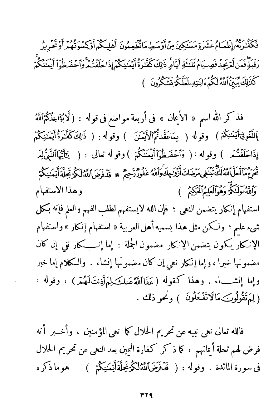 وَلَكِنْ يُؤَاخِذُكُمْ بِمَا عَقَّدْتُمُ الْأَيْمَانَ فَكَفَّارَتُهُ إطْعَامُ عَشَرَةِ مَسَاكِينَ مِنْ أَوْسَطِ مَا تُطْعِمُونَ أَهْلِيكُمْ أَوْ كِسْوَتُهُمْ أَوْ تَحْرِيرُ رَقَبَةٍ فَمَنْ لَمْ يَجِدْ فَصِيَامُ ثَلَاثَةِ أَيَّامٍ ذَلِكَ كَفَّارَةُ أَيْمَانِكُمْ إذَا حَلَفْتُمْ وَاحْفَظُوا أَيْمَانَكُمْ كَذَلِكَ يُبَيِّنُ اللَّهُ لَكُمْ آيَاتِهِ لَعَلَّكُمْ تَشْكُرُونَ} فَذَكَرَ اللَّهُ اسْمَ " الْأَيْمَانِ " فِي أَرْبَعَةِ مَوَاضِعَ فِي قَوْلِهِ: {لَا يُؤَاخِذُكُمُ اللَّهُ بِاللَّغْوِ فِي أَيْمَانِكُمْ} وَقَوْلِهِ {بِمَا عَقَّدْتُمُ الْأَيْمَانَ} وَقَوْلِهِ: {ذَلِكَ كَفَّارَةُ أَيْمَانِكُمْ إذَا حَلَفْتُمْ} وَقَوْلِهِ: {وَاحْفَظُوا أَيْمَانَكُمْ} وقَوْله تَعَالَى {يَا أَيُّهَا النَّبِيُّ لِمَ تُحَرِّمُ مَا أَحَلَّ اللَّهُ لَكَ تَبْتَغِي مَرْضَاةَ أَزْوَاجِكَ وَاللَّهُ غَفُورٌ رَحِيمٌ} {قَدْ فَرَضَ اللَّهُ لَكُمْ تَحِلَّةَ أَيْمَانِكُمْ وَاللَّهُ مَوْلَاكُمْ وَهُوَ الْعَلِيمُ الْحَكِيمُ} وَهَذَا الِاسْتِفْهَامُ اسْتِفْهَامُ إنْكَارٍ يَتَضَمَّنُ النَّهْيَ؛ فَإِنَّ اللَّهَ لَا يَسْتَفْهِمُ لِطَلَبِ الْفَهْمِ وَالْعِلْمِ فَإِنَّهُ بِكُلِّ شَيْءٍ عَلِيمٌ؛ وَلَكِنَّ مِثْلَ هَذَا يُسَمِّيهِ أَهْلُ الْعَرَبِيَّةِ " اسْتِفْهَامَ إنْكَارٍ " وَاسْتِفْهَامُ الْإِنْكَارِ يَكُونُ بِتَضَمُّنِ الْإِنْكَارِ مَضْمُونَ الْجُمْلَةِ: إمَّا إنْكَارَ نَفْيٍ إنْ كَانَ مَضْمُونُهَا خَبَرًا وَإِمَّا إنْكَارَ نَهْيٍ إنْ كَانَ مَضْمُونُهَا إنْشَاءً. وَالْكَلَامُ إمَّا خَبَرٌ وَإِمَّا إنْشَاءٌ. وَهَذَا كَقَوْلِهِ {عَفَا اللَّهُ عَنْكَ لِمَ أَذِنْتَ لَهُمْ} وَقَوْلِهِ: {لِمَ تَقُولُونَ مَا لَا تَفْعَلُونَ} وَنَحْوِ ذَلِكَ. فَاَللَّهُ تَعَالَى نَهَى نَبِيَّهُ عَنْ تَحْرِيمِ الْحَلَالِ كَمَا نَهَى الْمُؤْمِنِينَ وَأَخْبَرَ أَنَّهُ فَرَضَ لَهُمْ تَحِلَّةَ أَيْمَانِهِمْ كَمَا ذَكَرَ كَفَّارَةَ الْيَمِينِ بَعْدَ النَّهْيِ عَنْ تَحْرِيمِ الْحَلَالِ فِي سُورَةِ الْمَائِدَةِ. وَقَوْلُهُ: {قَدْ فَرَضَ اللَّهُ لَكُمْ تَحِلَّةَ أَيْمَانِكُمْ} هُوَ مَا ذَكَرَهُ