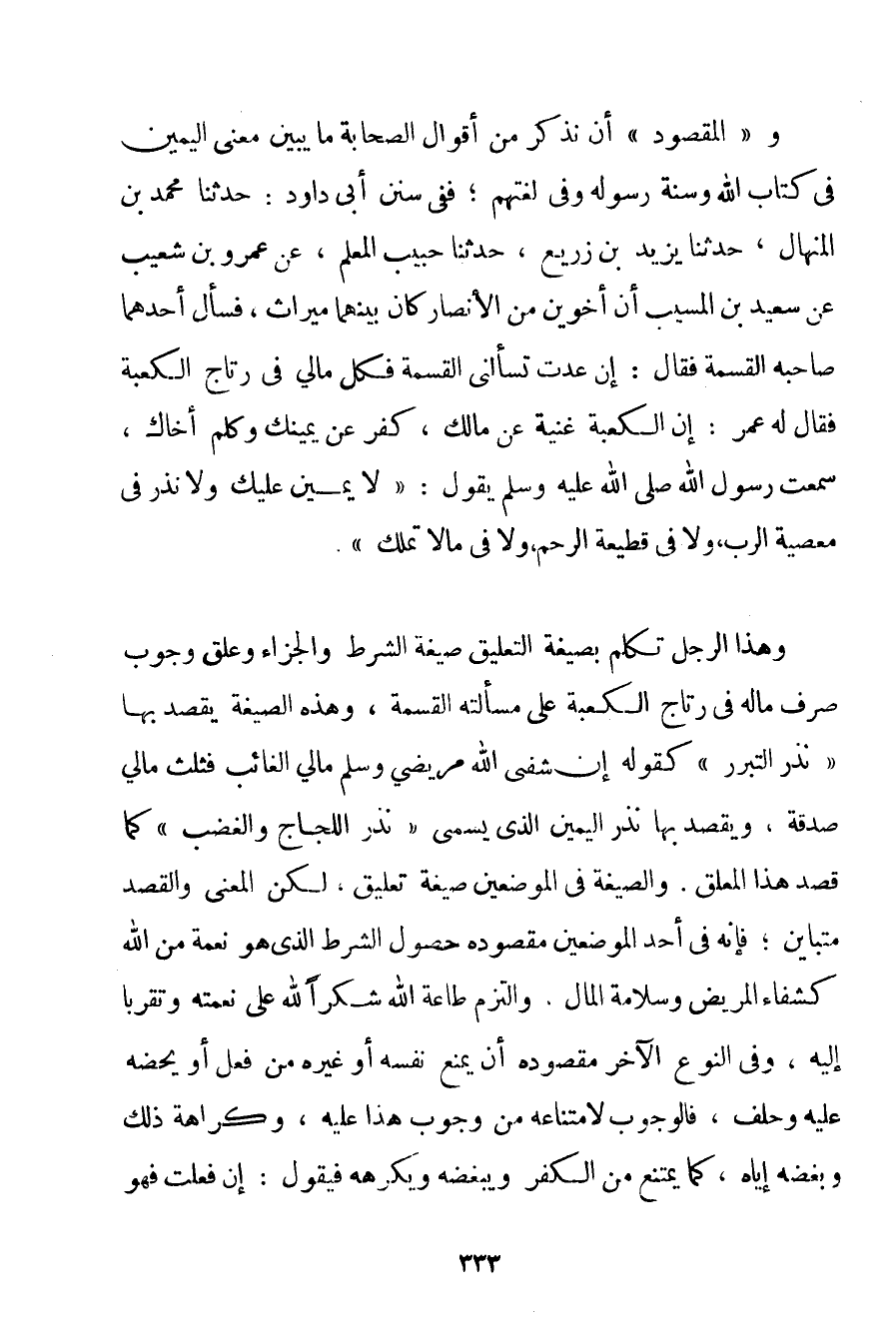 و " الْمَقْصُودُ " أَنْ نَذْكُرَ مِنْ أَقْوَالِ الصَّحَابَةِ مَا يُبَيِّنُ مَعْنَى الْيَمِينِ فِي كِتَابِ اللَّهِ وَسُنَّةِ رَسُولِهِ وَفِي لُغَتِهِمْ؛ فَفِي سُنَنِ أَبِي دَاوُد: حَدَّثَنَا مُحَمَّدُ بْنُ الْمِنْهَالِ حَدَّثَنَا يَزِيدُ بْنُ زريع حَدَّثَنَا حَبِيبٌ الْمُعَلِّمُ عَنْ عَمْرِو بْنِ شُعَيْبٍ عَنْ سَعِيدِ بْنِ الْمُسَيِّبِ أَنَّ أَخَوَيْنِ مِنْ الْأَنْصَارِ كَانَ بَيْنَهُمَا مِيرَاثٌ فَسَأَلَ أَحَدُهُمَا صَاحِبَهُ الْقِسْمَةَ فَقَالَ: إنْ عُدْت تَسْأَلُنِي الْقِسْمَةَ فَكُلُّ مَالِي فِي رِتَاجِ الْكَعْبَةِ فَقَالَ لَهُ عُمَرُ: إنَّ الْكَعْبَةَ غَنِيَّةٌ عَنْ مَالِك كَفِّرْ عَنْ يَمِينِك وَكَلِّمْ أَخَاك سَمِعْت رَسُولَ اللَّهِ صَلَّى اللَّهُ عَلَيْهِ وَسَلَّمَ يَقُولُ: {لَا يَمِينَ عَلَيْك وَلَا نَذْرَ فِي مَعْصِيَةٍ الرَّبِّ وَلَا فِي قَطِيعَةِ الرَّحِمِ وَلَا فِي مَا لَا تَمْلِكُ} . وَهَذَا الرَّجُلُ تَكَلَّمَ بِصِيغَةِ التَّعْلِيقِ صِيغَةِ الشَّرْطِ وَالْجَزَاءِ وَعَلَّقَ وُجُوبَ صَرْفِ مَالِهِ فِي رِتَاجِ الْكَعْبَةِ عَلَى مَسْأَلَتِهِ الْقِسْمَةَ وَهَذِهِ الصِّيغَةُ يَقْصِدُ بِهَا " نَذْرَ التَّبَرُّرِ " كَقَوْلِهِ إنْ شَفَى اللَّهُ مَرِيضِي وَسَلِمَ مَالِي الْغَائِبُ فَثُلْثُ مَالِي صَدَقَةٌ وَيَقْصِدُ بِهَا نَذْرَ الْيَمِينِ الَّذِي يُسَمَّى " نَذْرَ اللَّجَاجِ وَالْغَضَبِ " كَمَا قَصَدَ هَذَا الْمُعَلَّقَ. وَالصِّيغَةُ فِي الْمَوْضِعَيْنِ صِيغَةُ تَعْلِيقٍ لَكِنَّ الْمَعْنَى وَالْقَصْدَ مُتَبَايِنٌ؛ فَإِنَّهُ فِي أَحَدِ الْمَوْضِعَيْنِ مَقْصُودُهُ حُصُولُ الشَّرْطِ الَّذِي هُوَ نِعْمَةٌ مِنْ اللَّهِ كَشِفَاءِ الْمَرِيضِ وَسَلَامَةِ الْمَالِ. وَالْتِزَامِ طَاعَةِ اللَّهِ شُكْرًا لِلَّهِ عَلَى نِعْمَتِهِ وَتَقَرُّبًا إلَيْهِ وَفِي النَّوْعِ الْآخَرِ مَقْصُودُهُ أَنْ يَمْنَعَ نَفْسَهُ أَوْ غَيْرَهُ مِنْ فِعْلٍ أَوْ يَحُضُّهُ عَلَيْهِ وَحَلَفَ فَالْوُجُوبُ لِامْتِنَاعِهِ مِنْ وُجُوبِ هَذَا عَلَيْهِ وَكَرَاهَةِ ذَلِكَ وَبُغْضِهِ إيَّاهُ كَمَا يَمْتَنِعُ مِنْ الْكُفْرِ وَيُبْغِضُهُ وَيَكْرَهُهُ فَيَقُولُ: إنْ فَعَلْت فَهُوَ