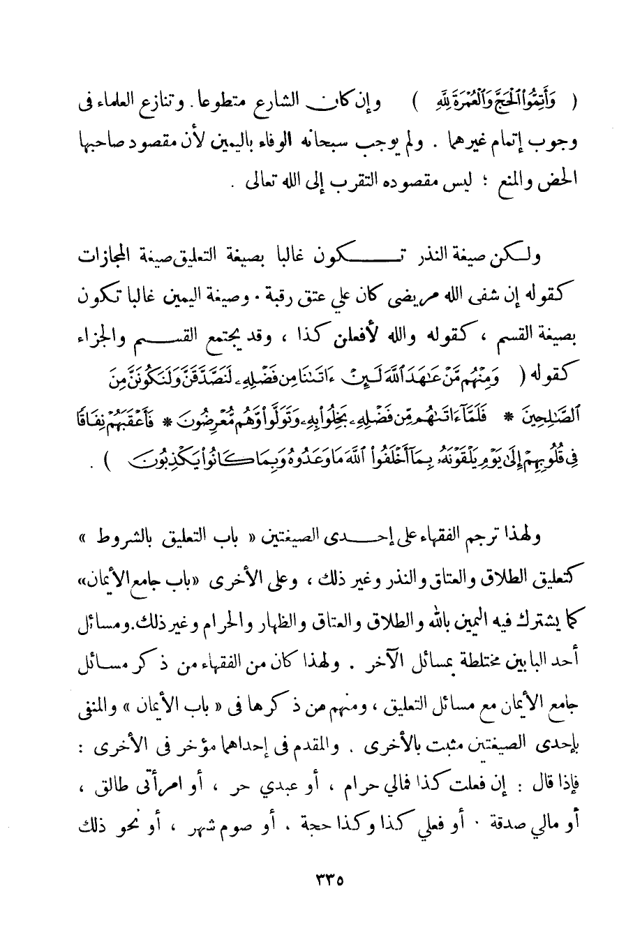{وَأَتِمُّوا الْحَجَّ وَالْعُمْرَةَ لِلَّهِ} وَإِنْ كَانَ الشَّارِعُ مُتَطَوِّعًا. وَتَنَازَعَ الْعُلَمَاءُ فِي وُجُوبِ إتْمَامِ غَيْرِهِمَا. وَلَمْ يُوجِبْ سُبْحَانَهُ الْوَفَاءَ بِالْيَمِينِ لِأَنَّ مَقْصُودَ صَاحِبِهَا الْحَضُّ وَالْمَنْعُ؛ لَيْسَ مَقْصُودُهُ التَّقَرُّبَ إلَى اللَّهِ تَعَالَى. وَلَكِنَّ صِيغَةَ النَّذْرِ تَكُونُ غَالِبًا بِصِيغَةِ التَّعْلِيقِ صِيغَةِ الْمَجَازَاتِ كَقَوْلِهِ إنْ شَفَى اللَّهُ مَرِيضِي كَانَ عَلَيَّ عِتْقُ رَقَبَةٍ. وَصِيغَةُ الْيَمِينِ غَالِبًا تَكُونُ بِصِيغَةِ الْقَسَمِ كَقَوْلِهِ وَاَللَّهِ لَأَفْعَلَنَّ كَذَا وَقَدْ يَجْتَمِعُ الْقَسَمُ وَالْجَزَاءُ كَقَوْلِهِ {وَمِنْهُمْ مَنْ عَاهَدَ اللَّهَ لَئِنْ آتَانَا مِنْ فَضْلِهِ لَنَصَّدَّقَنَّ وَلَنَكُونَنَّ مِنَ الصَّالِحِينَ} {فَلَمَّا آتَاهُمْ مِنْ فَضْلِهِ بَخِلُوا بِهِ وَتَوَلَّوْا وَهُمْ مُعْرِضُونَ} {فَأَعْقَبَهُمْ نِفَاقًا فِي قُلُوبِهِمْ إلَى يَوْمِ يَلْقَوْنَهُ بِمَا أَخْلَفُوا اللَّهَ مَا وَعَدُوهُ وَبِمَا كَانُوا يَكْذِبُونَ} . وَلِهَذَا تَرْجَمَ الْفُقَهَاءُ عَلَى إحْدَى الصِّيغَتَيْنِ " بَابَ التَّعْلِيقِ بِالشُّرُوطِ " كَتَعْلِيقِ الطَّلَاقِ وَالْعِتَاقِ وَالنَّذْرِ وَغَيْرِ ذَلِكَ وَعَلَى الْأُخْرَى " بَابَ جَامِعِ الْأَيْمَانِ " كَمَا يَشْتَرِكُ فِيهِ الْيَمِينُ بِاَللَّهِ وَالطَّلَاقُ وَالْعِتَاقُ وَالظِّهَارُ وَالْحَرَامُ وَغَيْرُ ذَلِكَ. وَمَسَائِلُ أَحَدِ الْبَابَيْنِ مُخْتَلِطَةٌ بِمَسَائِلِ الْآخَرِ. وَلِهَذَا كَانَ مِنْ الْفُقَهَاءِ مَنْ ذَكَرَ مَسَائِلَ جَامِعِ الْأَيْمَانِ مَعَ مَسَائِلِ التَّعْلِيقِ وَمِنْهُمْ مَنْ ذَكَرَهَا فِي " بَابِ الْأَيْمَانِ " وَالْمَنْفِيُّ بِإِحْدَى الصِّيغَتَيْنِ مُثْبَتٌ بِالْأُخْرَى وَالْمُقَدَّمُ فِي إحْدَاهُمَا مُؤَخَّرٌ فِي الْأُخْرَى: فَإِذَا قَالَ: إنْ فَعَلْت كَذَا فَمَالِي حَرَامٌ أَوْ عَبْدِي حُرٌّ أَوْ امْرَأَتِي طَالِقٌ أَوْ مَالِي صَدَقَةٌ. أَوْ فَعَلَيَّ كَذَا وَكَذَا حَجَّةٍ أَوْ صَوْمُ شَهْرٍ أَوْ نَحْوَ ذَلِكَ