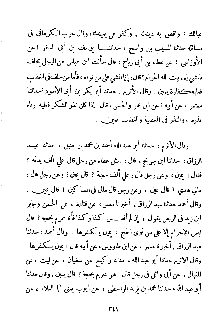عِيَالِك وَاقْضِ بِهِ دَيْنَك وَكَفِّرْ عَنْ يَمِينِك وَقَالَ حَرْبٌ الكرماني فِي مَسَائِلِهِ حَدَّثَنَا الْمُسَيِّبُ بْنُ وَاضِحٍ حَدَّثَنَا يُوسُفُ بْنُ أَبِي السَّفَرِ؛ عَنْ الأوزاعي؛ عَنْ عَطَاءِ بْنِ أَبِي رَبَاحٍ قَالَ سَأَلْت ابْنَ عَبَّاسٍ عَنْ الرَّجُلِ يَحْلِفُ بِالْمَشْيِ إلَى بَيْتِ اللَّهِ الْحَرَامِ؟ قَالَ: إنَّمَا الْمَشْيُ عَلَى مَنْ نَوَاهُ فَأَمَّا مَنْ حَلَفَ فِي الْغَضَبِ فَعَلَيْهِ كَفَّارَةُ يَمِينٍ. وَقَالَ الْأَثْرَمُ. حَدَّثَنَا أَبُو بَكْرِ بْنُ أَبِي الْأَسْوَدِ حَدَّثَنَا مُعْتَمِرٌ عَنْ أَبِيهِ؛ عَنْ ابْنِ عُمَرَ وَالْحَسَنِ قَالَ: إذَا كَانَ نَذَرَ الشُّكْرَ فَعَلَيْهِ وَفَاءُ نَذْرِهِ وَالنَّذْرُ فِي الْمَعْصِيَةِ وَالْغَضَبِ يَمِينٌ. وَقَالَ الْأَثْرَمُ: حَدَّثَنَا أَبُو عَبْدِ اللَّهِ أَحْمَد بْنُ مُحَمَّدِ بْنِ حَنْبَلٍ حَدَّثَنَا عَبْدُ الرَّزَّاقِ حَدَّثَنَا ابْنُ جريج قَالَ: سُئِلَ عَطَاءٌ عَنْ رَجُلٍ قَالَ عَلَيَّ أَلْفُ بَدَنَةٍ؟ فَقَالَ: يَمِينٌ وَعَنْ رَجُلٍ قَالَ: عَلَيَّ أَلْفُ حَجَّةٍ؟ قَالَ يَمِينٌ؛ وَعَنْ رَجُلٍ قَالَ: مَالِي هَدْيٌ؟ قَالَ يَمِينٌ وَعَنْ رَجُلٍ قَالَ مَالِي فِي الْمَسَاكِينِ؟ قَالَ يَمِينٌ. وَقَالَ أَحْمَد حَدَّثَنَا عَبْدُ الرَّزَّاقِ أَخْبَرَنَا مَعْمَرٌ عَنْ قتادة عَنْ الْحَسَنِ وَجَابِرِ بْنِ زَيْدٍ فِي الرَّجُلِ يَقُولُ: إنْ لَمْ أَفْعَلْ كَذَا وَكَذَا فَأَنَا مُحْرِمٌ بِحَجَّةِ؟ قَالَ لَيْسَ الْإِحْرَامُ إلَّا عَلَى مَنْ نَوَى الْحَجَّ يَمِينٌ يُكَفِّرُهَا. وَقَالَ أَحْمَد: حَدَّثَنَا عَبْدُ الرَّزَّاقِ أَخْبَرَنَا مَعْمَرٌ عَنْ ابْنِ طاوس عَنْ أَبِيهِ قَالَ: يَمِينٌ يُكَفِّرُهَا. وَقَالَ الْأَثْرَمُ حَدَّثَنَا أَبُو عَبْدِ اللَّهِ حَدَّثَنَا وَكِيعٌ عَنْ سُفْيَانَ عَنْ لَيْثٍ عَنْ الْمِنْهَالِ عَنْ أَبِي وَائِلٍ فِي رَجُلٍ قَالَ: هُوَ مُحْرِمٌ بِحَجَّةِ؟ قَالَ يَمِينٌ وَقَالَ حَدَّثَنَا أَبُو عَبْدِ اللَّهِ حَدَّثَنَا مُحَمَّدُ بْنُ يَزِيدَ الواسطي عَنْ أَيُّوبَ يَعْنِي أَبَا الْعَلَاءِ عَنْ