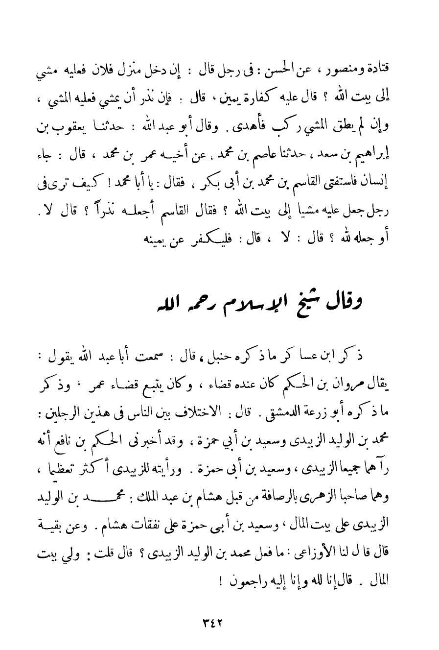 قتادة وَمَنْصُورٍ عَنْ الْحَسَنِ: فِي رَجُلٍ قَالَ: إنْ دَخَلَ مَنْزِلَ فُلَانٍ فَعَلَيْهِ مَشْيٌ إلَى بَيْتِ اللَّهِ؟ قَالَ عَلَيْهِ كَفَّارَةُ يَمِينٍ قَالَ: فَإِنْ نَذَرَ أَنْ يَمْشِيَ فَعَلَيْهِ الْمَشْيُ وَإِنْ لَمْ يُطِقْ الْمَشْيَ رَكِبَ فَأَهْدَى. وَقَالَ أَبُو عَبْدِ اللَّهِ: حَدَّثَنَا يَعْقُوبُ بْنُ إبْرَاهِيمَ بْنِ سَعْدٍ حَدَّثَنَا عَاصِمُ بْنُ مُحَمَّدٍ عَنْ أَخِيهِ عُمَرَ بْنِ مُحَمَّدٍ قَالَ: جَاءَ إنْسَانٌ فَاسْتَفْتَى الْقَاسِمَ بْنَ مُحَمَّدِ بْنِ أَبِي بَكْرٍ فَقَالَ: يَا أَبَا مُحَمَّدٍ كَيْفَ تَرَى فِي رَجُلٍ جَعَلَ عَلَيْهِ مَشْيًا إلَى بَيْتِ اللَّهِ؟ فَقَالَ الْقَاسِمُ أَجَعَلَهُ نَذْرًا؟ قَالَ لَا. أَوَجَعَلَهُ لِلَّهِ؟ قَالَ: لَا قَالَ: فَلْيُكَفِّرْ عَنْ يَمِينِهِ
