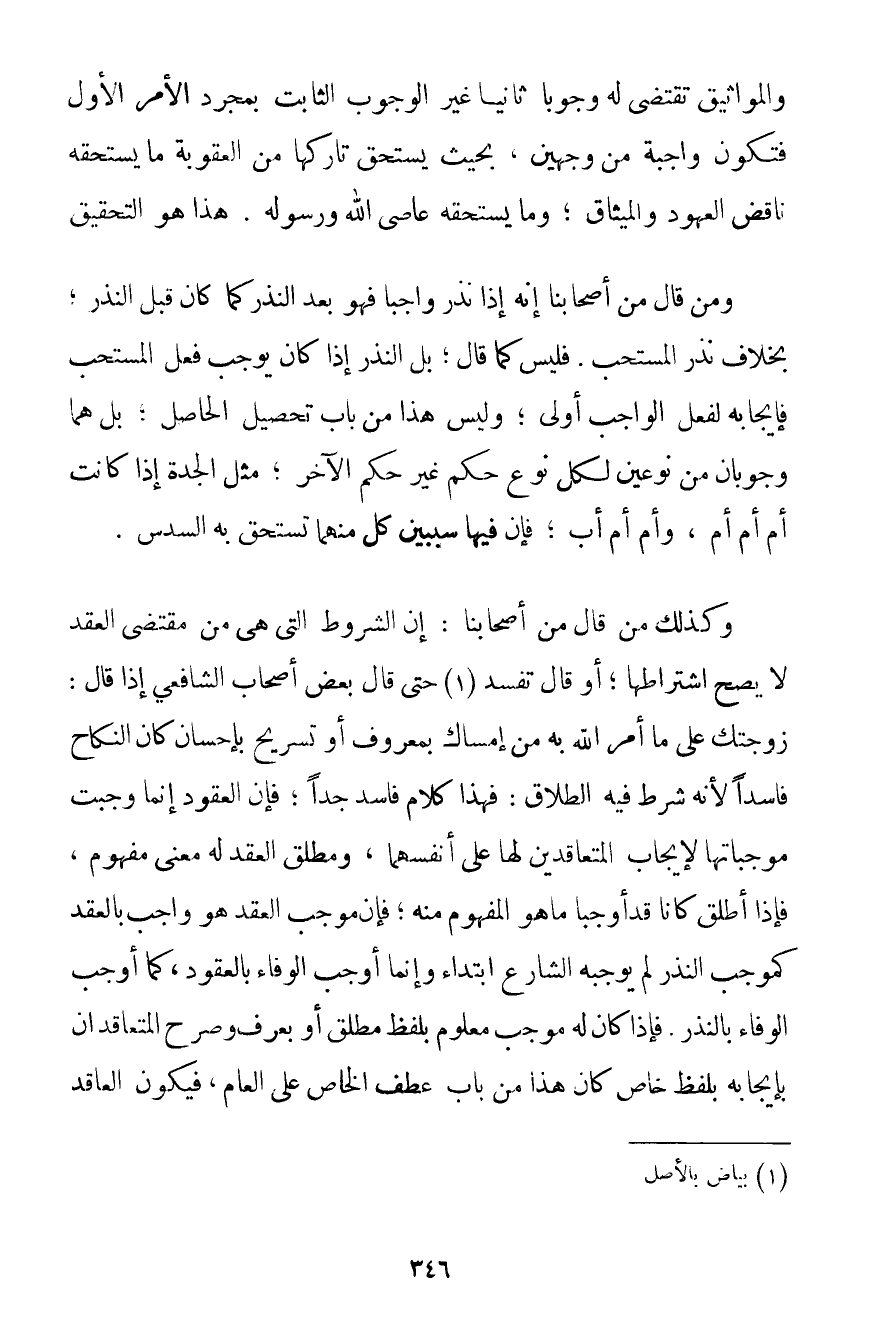 وَالْمَوَاثِيقَ تَقْتَضِي لَهُ وُجُوبًا ثَانِيًا غَيْرَ الْوُجُوبِ الثَّابِتِ بِمُجَرَّدِ الْأَمْرِ الْأَوَّلِ فَتَكُونُ وَاجِبَةً مِنْ وَجْهَيْنِ بِحَيْثُ يَسْتَحِقُّ تَارِكُهَا مِنْ الْعُقُوبَةِ مَا يَسْتَحِقُّهُ نَاقِضُ الْعُهُودِ وَالْمِيثَاقِ؛ وَمَا يَسْتَحِقُّهُ عَاصِي اللَّهِ وَرَسُولِهِ. هَذَا هُوَ التَّحْقِيقُ وَمَنْ قَالَ مِنْ أَصْحَابِنَا إنَّهُ إذَا نَذَرَ وَاجِبًا فَهُوَ بَعْدَ النَّذْرِ كَمَا كَانَ قَبْلَ النَّذْرِ؛ بِخِلَافِ نَذْرِ الْمُسْتَحَبِّ. فَلَيْسَ كَمَا قَالَ؛ بَلْ النَّذْرُ إذَا كَانَ يُوجِبُ فِعْلَ الْمُسْتَحَبِّ فَإِيجَابُهُ لِفِعْلِ الْوَاجِبِ أَوْلَى؛ وَلَيْسَ هَذَا مِنْ بَابِ تَحْصِيلِ الْحَاصِلِ؛ بَلْ هُمَا وجوبان مِنْ نَوْعَيْنِ لِكُلِّ نَوْعٍ حُكْمٌ غَيْرُ حُكْمِ الْآخَرِ؛ مِثْلُ الْجَدَّةِ إذَا كَانَتْ أُمَّ أُمِّ أُمٍّ وَأُمَّ أُمِّ أَب؛ فَإِنَّ فِيهَا سَبَبَيْنِ كُلٌّ مِنْهُمَا تَسْتَحِقُّ بِهِ السُّدْسَ. وَكَذَلِكَ مَنْ قَالَ مِنْ أَصْحَابِنَا: إنَّ الشُّرُوطَ الَّتِي هِيَ مِنْ مُقْتَضَى الْعَقْدِ لَا يَصِحُّ اشْتِرَاطُهَا؛ أَوْ قَالَ تَفْسُدُ (1) حَتَّى قَالَ بَعْضُ أَصْحَابِ الشَّافِعِيِّ إذَا قَالَ: زَوَّجْتُك عَلَى مَا أَمَرَ اللَّهُ بِهِ مِنْ إمْسَاكٍ بِمَعْرُوفِ أَوْ تَسْرِيحٍ بِإِحْسَانِ كَانَ النِّكَاحُ فَاسِدًا لِأَنَّهُ شَرَطَ فِيهِ الطَّلَاقَ: فَهَذَا كَلَامٌ فَاسِدٌ جِدًّا؛ فَإِنَّ الْعُقُودَ إنَّمَا وَجَبَتْ مُوجِبَاتُهَا لِإِيجَابِ الْمُتَعَاقِدَيْنِ لَهَا عَلَى أَنْفُسِهِمَا وَمُطْلَقُ الْعَقْدِ لَهُ مَعْنًى مَفْهُومٌ فَإِذَا أُطْلِقَ كَانَا قَدْ أَوْجَبَا مَا هُوَ الْمَفْهُومُ مِنْهُ؛ فَإِنَّ مُوجَبَ الْعَقْدِ هُوَ وَاجِبٌ بِالْعَقْدِ كَمُوجَبِ النَّذْرِ لَمْ يُوجِبْهُ الشَّارِعُ ابْتِدَاءً وَإِنَّمَا أَوْجَبَ الْوَفَاءَ بِالْعُقُودِ كَمَا أَوْجَبَ الْوَفَاءَ بِالنَّذْرِ. فَإِذَا كَانَ لَهُ مُوجَبٌ مَعْلُومٌ بِلَفْظِ مُطْلَقٍ أَوْ بِعُرْفِ وَصَرَّحَ الْمُتَعَاقِدَانِ بِإِيجَابِهِ بِلَفْظِ خَاصٍّ كَانَ هَذَا مِنْ بَابِ عَطْفِ الْخَاصِّ عَلَى الْعَامِّ فَيَكُونُ الْعَاقِدُ