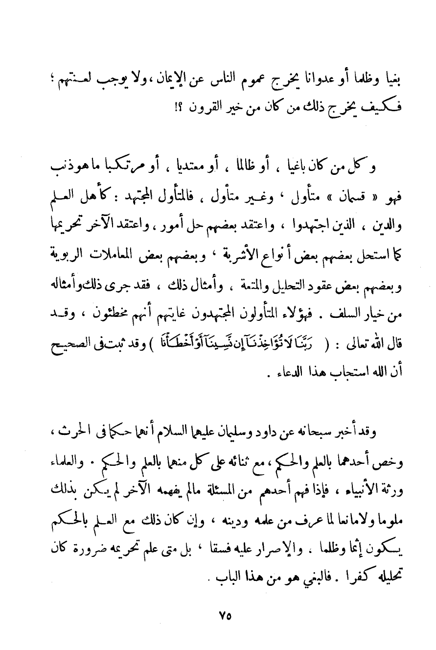 بَغْيًا وَظُلْمًا أَوْ عُدْوَانًا يُخْرِجُ عُمُومَ النَّاسِ عَنْ الْإِيمَانِ، وَلَا يُوجِبُ لَعْنَتَهُمْ؛ فَكَيْفَ يُخْرِجُ ذَلِك مَنْ كَانَ مِنْ خَيْرِ الْقُرُونِ؟ وَكُلُّ مَنْ كَانَ بَاغِيًا، أَوْ ظَالِمًا، أَوْ مُعْتَدِيًا، أَوْ مُرْتَكِبًا مَا هُوَ ذَنْبٌ فَهُوَ " قِسْمَانِ " مُتَأَوِّلٌ، وَغَيْرُ مُتَأَوِّلٍ، فَالْمُتَأَوِّلُ الْمُجْتَهِدُ: كَأَهْلِ الْعِلْمِ وَالدِّينِ، الَّذِينَ اجْتَهَدُوا، وَاعْتَقَدَ بَعْضُهُمْ حِلَّ أُمُورٍ، وَاعْتَقَدَ الْآخَرُ تَحْرِيمَهَا كَمَا اسْتَحَلَّ بَعْضُهُمْ بَعْضَ أَنْوَاعِ الْأَشْرِبَةِ، وَبَعْضُهُمْ بَعْضَ الْمُعَامَلَاتِ الرِّبَوِيَّةِ وَبَعْضُهُمْ بَعْضَ عُقُودِ التَّحْلِيلِ وَالْمُتْعَةِ، وَأَمْثَالُ ذَلِك، فَقَدْ جَرَى ذَلِك وَأَمْثَالُهُ مِنْ خِيَارِ السَّلَفِ. فَهَؤُلَاءِ الْمُتَأَوِّلُونَ الْمُجْتَهِدُونَ غَايَتُهُمْ أَنَّهُمْ مُخْطِئُونَ، وَقَدْ قَالَ اللَّهُ تَعَالَى: {رَبَّنَا لَا تُؤَاخِذْنَا إنْ نَسِينَا أَوْ أَخْطَأْنَا} وَقَدْ ثَبَتَ فِي الصَّحِيحِ أَنَّ اللَّهَ اسْتَجَابَ هَذَا الدُّعَاءَ. وَقَدْ أَخْبَرَ سُبْحَانَهُ عَنْ دَاوُد وَسُلَيْمَانَ عَلَيْهِمَا السَّلَامُ إنَّمَا حَكَمَا فِي الْحَرْثِ، وَخَصَّ أَحَدَهُمَا بِالْعِلْمِ وَالْحُكْمِ، مَعَ ثَنَائِهِ عَلَى كُلٍّ مِنْهُمَا بِالْعِلْمِ وَالْحُكْمِ. وَالْعُلَمَاءُ وَرَثَةُ الْأَنْبِيَاءِ، فَإِذَا فَهِمَ أَحَدُهُمْ مِنْ الْمَسْأَلَةِ مَا لَمْ يَفْهَمْهُ الْآخَرُ لَمْ يَكُنْ بِذَلِك مَلُومًا وَلَا مَانِعًا لِمَا عُرِفَ مِنْ عِلْمِهِ وَدِينِهِ، وَإِنْ كَانَ ذَلِك مَعَ الْعِلْمِ بِالْحُكْمِ يَكُون إثْمًا وَظُلْمًا، وَالْإِصْرَارُ عَلَيْهِ فِسْقًا، بَلْ مَتَى عُلِمَ تَحْرِيمُهُ ضَرُورَةً كَانَ تَحْلِيلُهُ كُفْرًا. فَالْبَغْيُ هُوَ مِنْ هَذَا الْبَابِ.