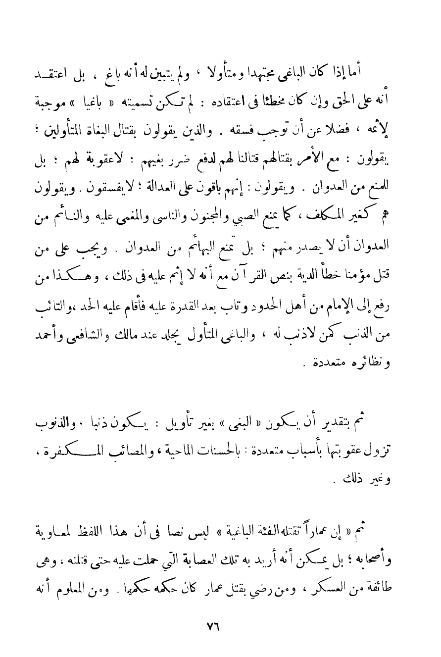 أَمَا إذَا كَانَ الْبَاغِي مُجْتَهِدًا وَمُتَأَوِّلًا، وَلَمْ يَتَبَيَّنْ لَهُ أَنَّهُ بَاغٍ، بَلْ اعْتَقَدَ أَنَّهُ عَلَى الْحَقِّ وَإِنْ كَانَ مُخْطِئًا فِي اعْتِقَادِهِ: لَمْ تَكُنْ تَسْمِيَتُهُ " بَاغِيًا " مُوجِبَةً لِإِثْمِهِ، فَضْلًا عَنْ أَنْ تُوجِبَ فِسْقَهُ. وَاَلَّذِينَ يَقُولُونَ بِقِتَالِ الْبُغَاةِ الْمُتَأَوِّلِينَ؛ يَقُولُونَ: مَعَ الْأَمْرِ بِقِتَالِهِمْ قِتَالُنَا لَهُمْ لِدَفْعِ ضَرَرِ بَغْيِهِمْ؛ لَا عُقُوبَةً لَهُمْ؛ بَلْ لِلْمَنْعِ مِنْ الْعُدْوَانِ. وَيَقُولُونَ: إنَّهُمْ بَاقُونَ عَلَى الْعَدَالَةِ؛ لَا يُفَسَّقُونَ. وَيَقُولُونَ هُمْ كَغَيْرِ الْمُكَلَّفِ، كَمَا يُمْنَعُ الصَّبِيُّ وَالْمَجْنُونُ وَالنَّاسِي وَالْمُغْمَى عَلَيْهِ وَالنَّائِمُ مِنْ الْعُدْوَانِ أَنْ لَا يَصْدُرَ مِنْهُمْ؛ بَلْ تُمْنَعُ الْبَهَائِمُ مِنْ الْعُدْوَانِ. وَيَجِبُ عَلَى مَنْ قُتِلَ مُؤْمِنًا خَطَأً الدِّيَةُ بِنَصِّ الْقُرْآنِ مَعَ أَنَّهُ لَا إثْمَ عَلَيْهِ فِي ذَلِك، وَهَكَذَا مَنْ رُفِعَ إلَى الْإِمَامِ مِنْ أَهْلِ الْحُدُودِ وَتَابَ بَعْدَ الْقُدْرَةِ عَلَيْهِ فَأَقَامَ عَلَيْهِ الْحَدَّ، وَالتَّائِبُ مِنْ الذَّنْبِ كَمَنْ لَا ذَنْبَ لَهُ، وَالْبَاغِي الْمُتَأَوِّلُ يُجْلَدُ عِنْدَ مَالِكٍ وَالشَّافِعِيِّ وَأَحْمَد وَنَظَائِرُهُ مُتَعَدِّدَةٌ. ثُمَّ بِتَقْدِيرِ أَنْ يَكُونَ " الْبَغْيُ " بِغَيْرِ تَأْوِيلٍ: يَكُون ذَنْبًا، وَالذُّنُوبُ تَزُولُ عُقُوبَتُهَا بِأَسْبَابِ مُتَعَدِّدَةٍ: بِالْحَسَنَاتِ الْمَاحِيَةِ، وَالْمَصَائِبِ الْمُكَفِّرَةِ، وَغَيْرِ ذَلِك. ثُمَّ {إنَّ عَمَّارًا تَقْتُلُهُ الْفِئَةُ الْبَاغِيَةُ} لَيْسَ نَصًّا فِي أَنَّ هَذَا اللَّفْظَ لمعاوية وَأَصْحَابِهِ؛ بَلْ يُمْكِنُ أَنَّهُ أُرِيدَ بَهْ تِلْكَ الْعِصَابَةُ الَّتِي حَمَلَتْ عَلَيْهِ حَتَّى قَتَلَتْهُ، وَهِيَ طَائِفَةٌ مِنْ الْعَسْكَرِ، وَمَنْ رَضِيَ بِقَتْلِ عَمَّارٍ كَانَ حُكْمُهُ حُكْمَهَا. وَمِنْ الْمَعْلُومِ أَنَّهُ