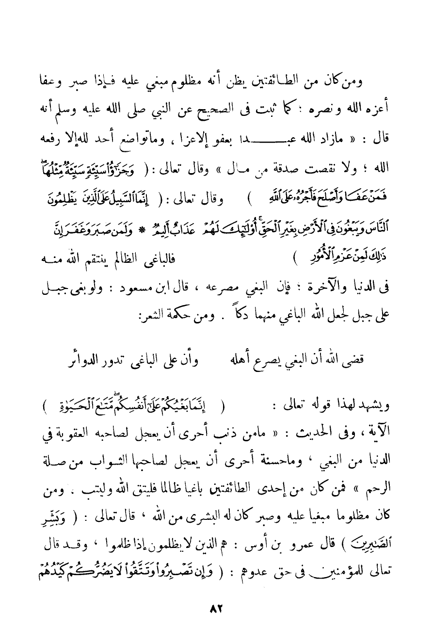 وَمَنْ كَانَ مِنْ الطَّائِفَتَيْنِ يَظُنُّ أَنَّهُ مَظْلُومٌ مَبْغِيٌّ عَلَيْهِ فَإِذَا صَبَرَ وَعَفَا أَعَزَّهُ اللَّهُ وَنَصَرَهُ؛ كَمَا ثَبَتَ فِي الصَّحِيحِ عَنْ النَّبِيِّ صَلَّى اللَّهُ عَلَيْهِ وَسَلَّمَ أَنَّهُ قَالَ: {مَا زَادَ اللَّهُ عَبْدًا بِعَفْوِ إلَّا عِزًّا، وَمَا تَوَاضَعَ أَحَدٌ لِلَّهِ إلَّا رَفَعَهُ اللَّهُ؛ وَلَا نَقَصَتْ صَدَقَةٌ مِنْ مَالٍ} وَقَالَ تَعَالَى: {وَجَزَاءُ سَيِّئَةٍ سَيِّئَةٌ مِثْلُهَا فَمَنْ عَفَا وَأَصْلَحَ فَأَجْرُهُ عَلَى اللَّهِ} وَقَالَ تَعَالَى: {إنَّمَا السَّبِيلُ عَلَى الَّذِينَ يَظْلِمُونَ النَّاسَ وَيَبْغُونَ فِي الْأَرْضِ بِغَيْرِ الْحَقِّ أُولَئِكَ لَهُمْ عَذَابٌ أَلِيمٌ} {وَلَمَنْ صَبَرَ وَغَفَرَ إنَّ ذَلِكَ لَمِنْ عَزْمِ الْأُمُورِ} فَالْبَاغِي الظَّالِمُ يَنْتَقِمُ اللَّهُ مِنْهُ فِي الدُّنْيَا وَالْآخِرَةِ؛ فَإِنَّ الْبَغْيَ مَصْرَعُهُ، قَالَ ابْنُ مَسْعُودٍ: وَلَوْ بَغَى جَبَلٌ عَلَى جَبَلٍ لَجَعَلَ اللَّهُ الْبَاغِيَ مِنْهُمَا دَكًّا. وَمِنْ حِكْمَةِ الشِّعْرِ: