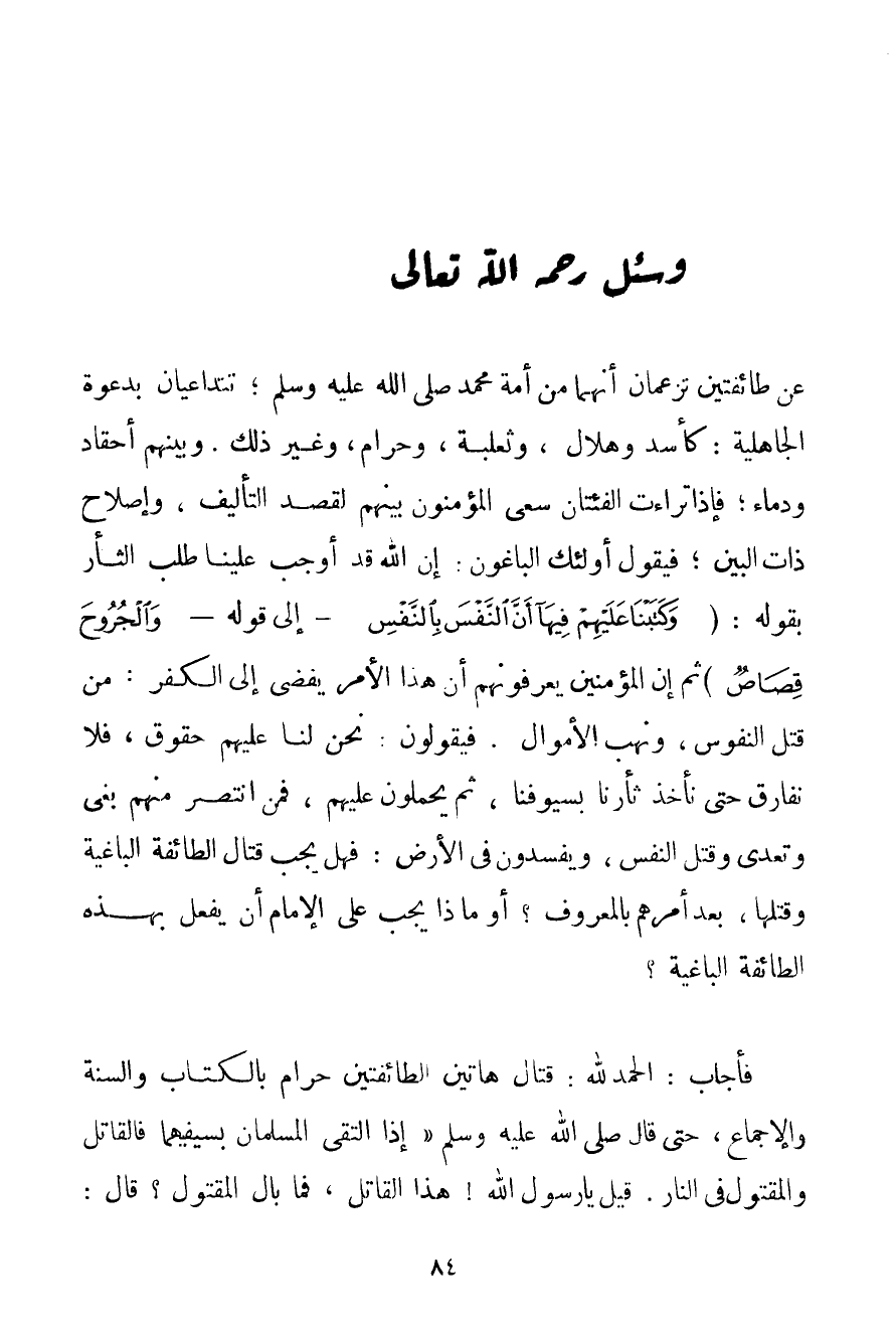 عَنْ طَائِفَتَيْنِ تَزْعُمَانِ أَنَّهُمَا مِنْ أُمَّةِ مُحَمَّد صَلَّى اللَّهُ عَلَيْهِ وَسَلَّمَ تَتَدَاعَيَانِ بِدَعْوَةِ الْجَاهِلِيَّةِ: كَأَسَدِ وَهِلَالٍ، وَثَعْلَبَةَ، وَحَرَامٍ، وَغَيْرِ ذَلِك. وَبَيْنَهُمْ أَحْقَادٌ وَدِمَاءٌ؛ فَإِذَا تَرَاءَتْ الْفِئَتَانِ سَعَى الْمُؤْمِنُونَ بَيْنَهُمْ لِقَصْدِ التَّأْلِيفِ، وَإِصْلَاحِ ذَاتِ الْبَيْنِ؛ فَيَقُولُ أُولَئِكَ الْبَاغُونَ: إنَّ اللَّهَ قَدْ أَوْجَبَ عَلَيْنَا طَلَبَ الثَّأْرِ بِقَوْلِهِ: {وَكَتَبْنَا عَلَيْهِمْ فِيهَا أَنَّ النَّفْسَ بِالنَّفْسِ} - إلَى قَوْلِهِ - {وَالْجُرُوحَ قِصَاصٌ} ثُمَّ إنَّ الْمُؤْمِنِينَ يُعَرِّفُونَهُمْ أَنَّ هَذَا الْأَمْرَ يُفْضِي إلَى الْكُفْرِ: مِنْ قَتْلِ النَّفُوسِ، وَنَهْبِ الْأَمْوَالِ. فَيَقُولُونَ: نَحْنُ لَنَا عَلَيْهِمْ حُقُوقٌ، فَلَا نُفَارِقُ حَتَّى نَأْخُذَ ثَأْرَنَا بِسُيُوفِنَا، ثُمَّ يَحْمِلُونَ عَلَيْهِمْ، فَمَنْ انْتَصَرَ مِنْهُمْ بَغَى وَتَعَدَّى وَقَتَلَ النَّفْسَ، وَيُفْسِدُونَ فِي الْأَرْضِ: فَهَلْ يَجِبُ قِتَالُ الطَّائِفَةِ الْبَاغِيَةِ وَقَتْلُهَا، بَعْدَ أَمْرِهِمْ بِالْمَعْرُوفِ؟ أَوْ مَاذَا يَجِبُ عَلَى الْإِمَامِ أَنْ يَفْعَلَ بِهَذِهِ الطَّائِفَةِ الْبَاغِيَةِ؟